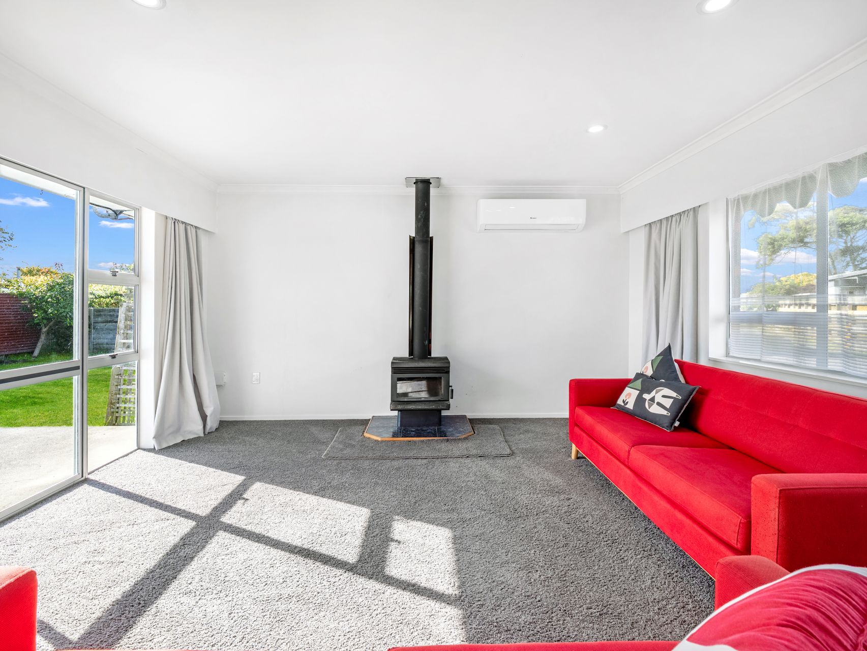 The large, light-filled lounge enjoys excellent sun and opens via a ranch slider to a generous patio and garden area, perfect for relaxing or entertaining. Year-round comfort is assured with a heat pump, wood burner, and Nitestore heater, complemented by good insulation and a Healthy Homes Certificate for peace of mind.
