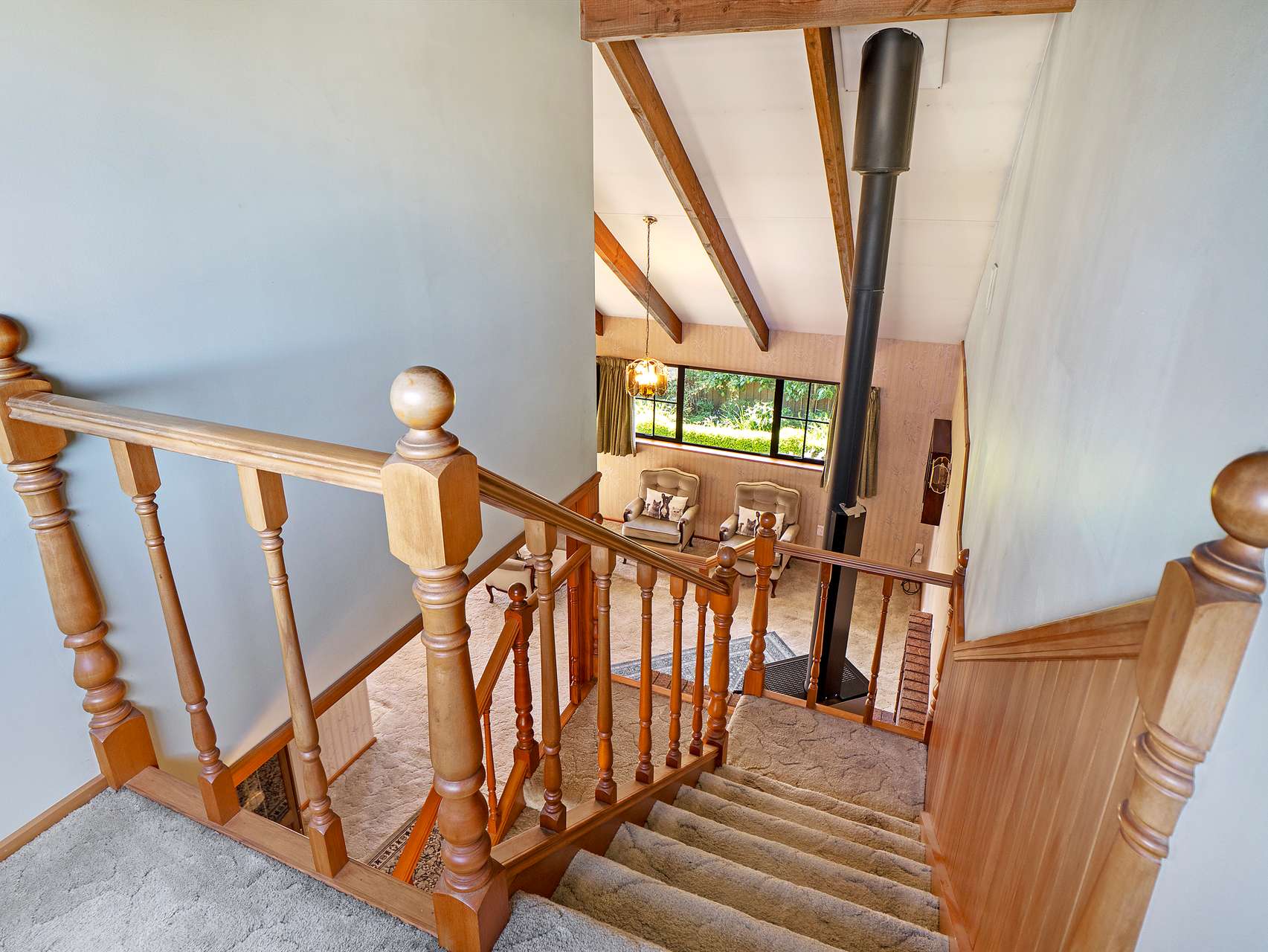Its brick and weatherboard exterior carries a quiet strength, softened by sculpted hedges and mature trees. Inside, warmth and character greet you immediately. A timber staircase anchors the entryway, leading to a generous lounge where exposed beams and a brick fireplace invite evenings that linger. Internal Fijian Kaui doors add a bespoke touch, while garden-facing windows flood the space with natural light. For additional comfort, a ventilation system & water filter.