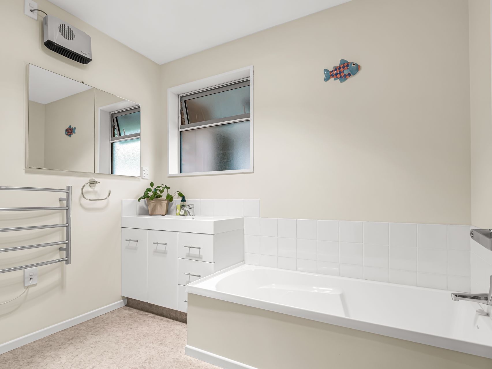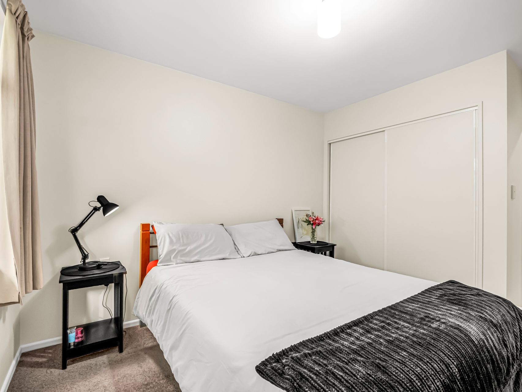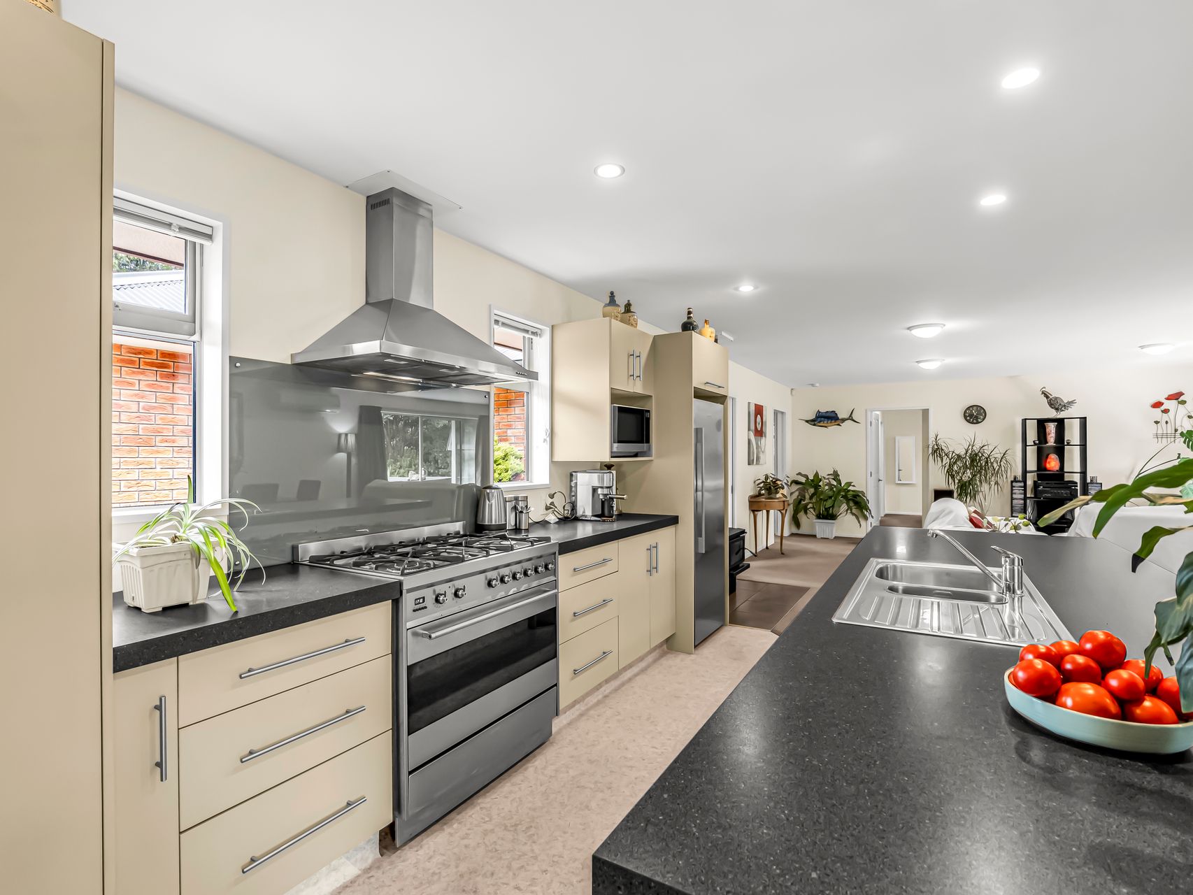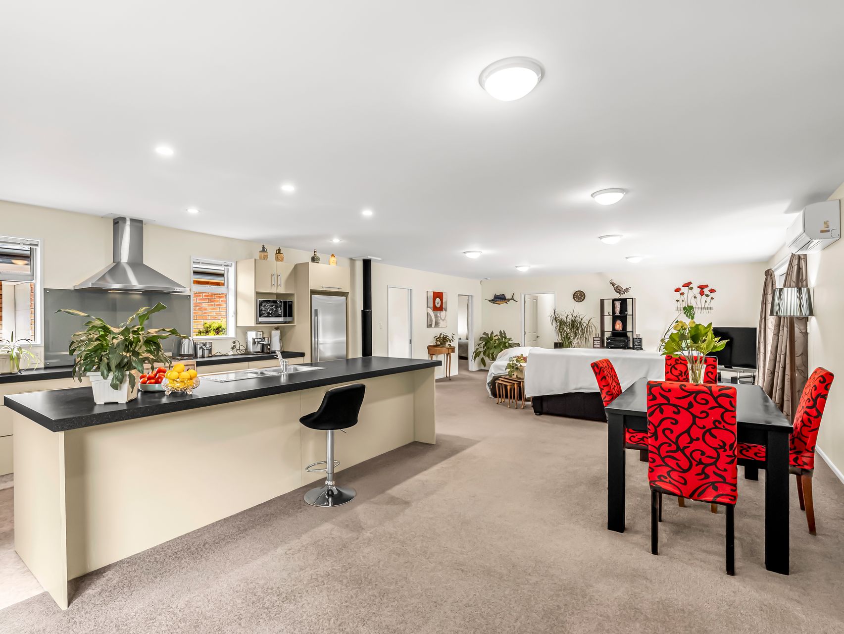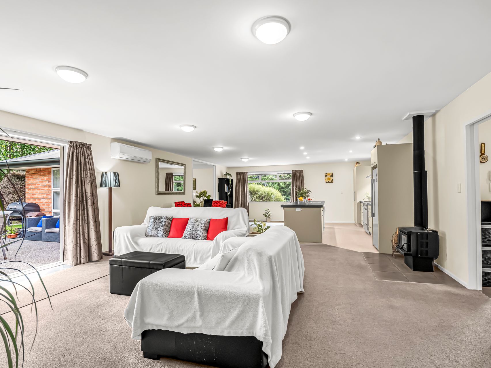 The kitchen boasts generous bench space, breakfast bar seating for quick meals or a glass of wine while dinner is underway and modern appliances that make cooking enjoyable. From here, the open plan living space with a wood burner and heat pump, extends to the private courtyard. Slide the doors back and you have easy indoor-outdoor flow for summer barbecues, or coffee in the sun.