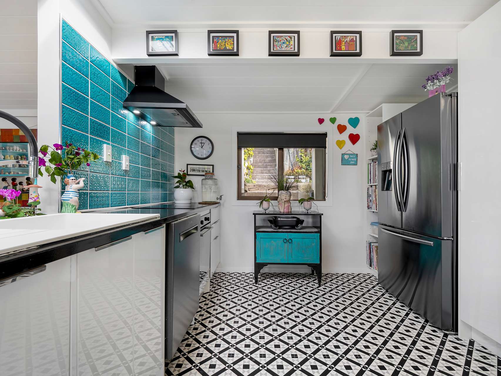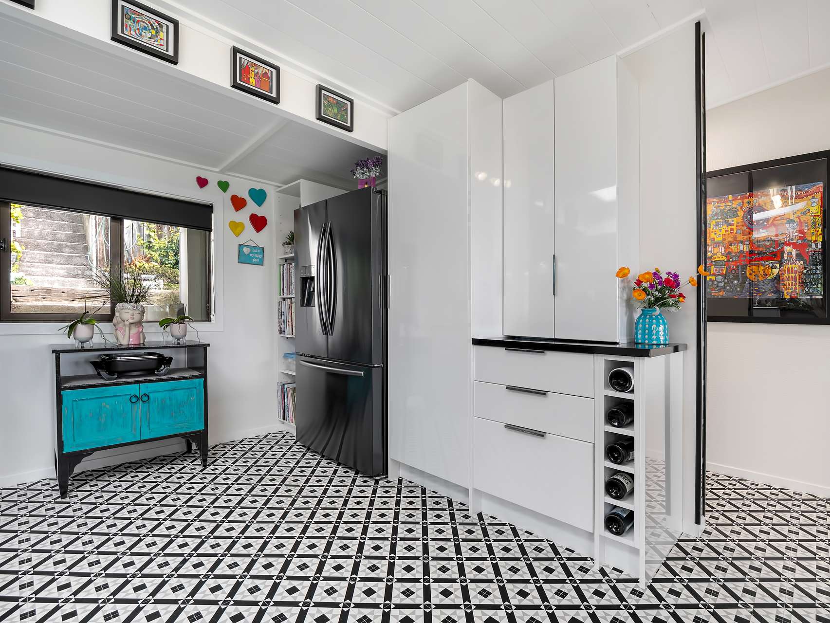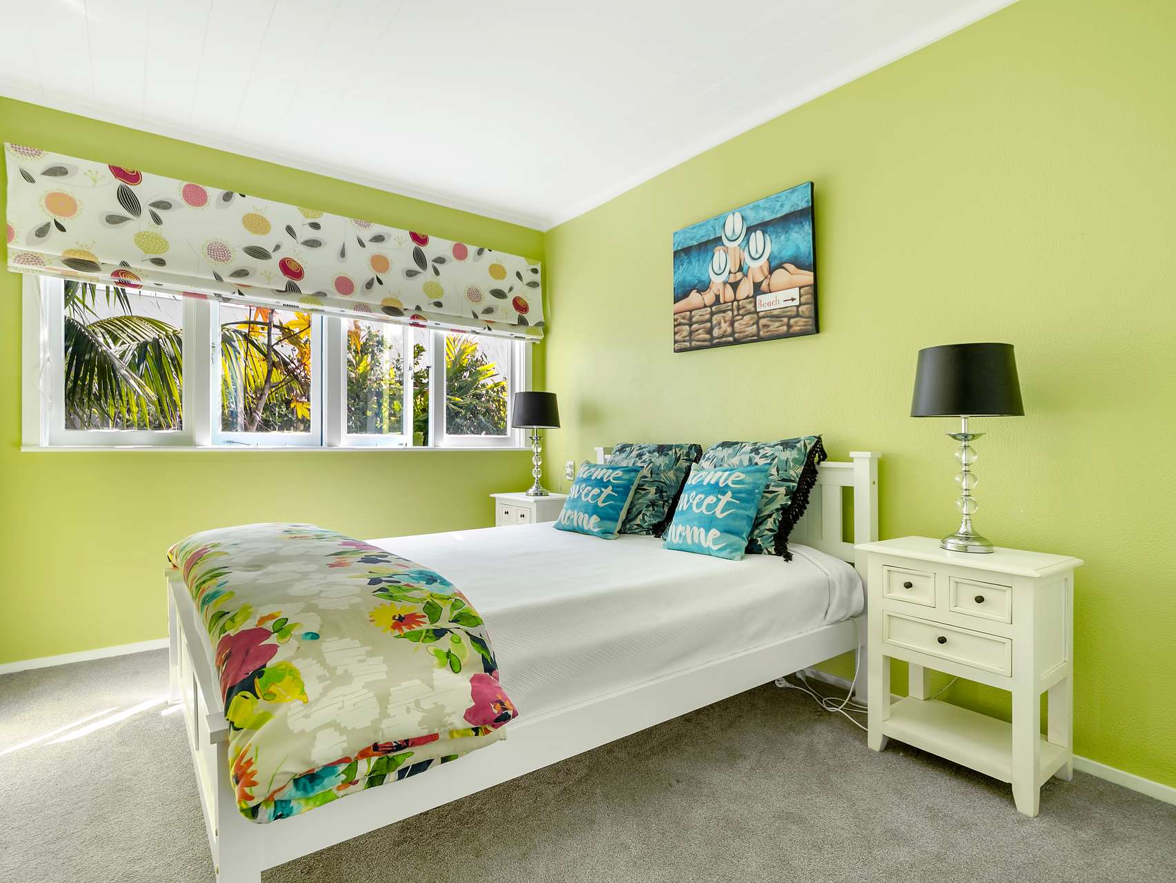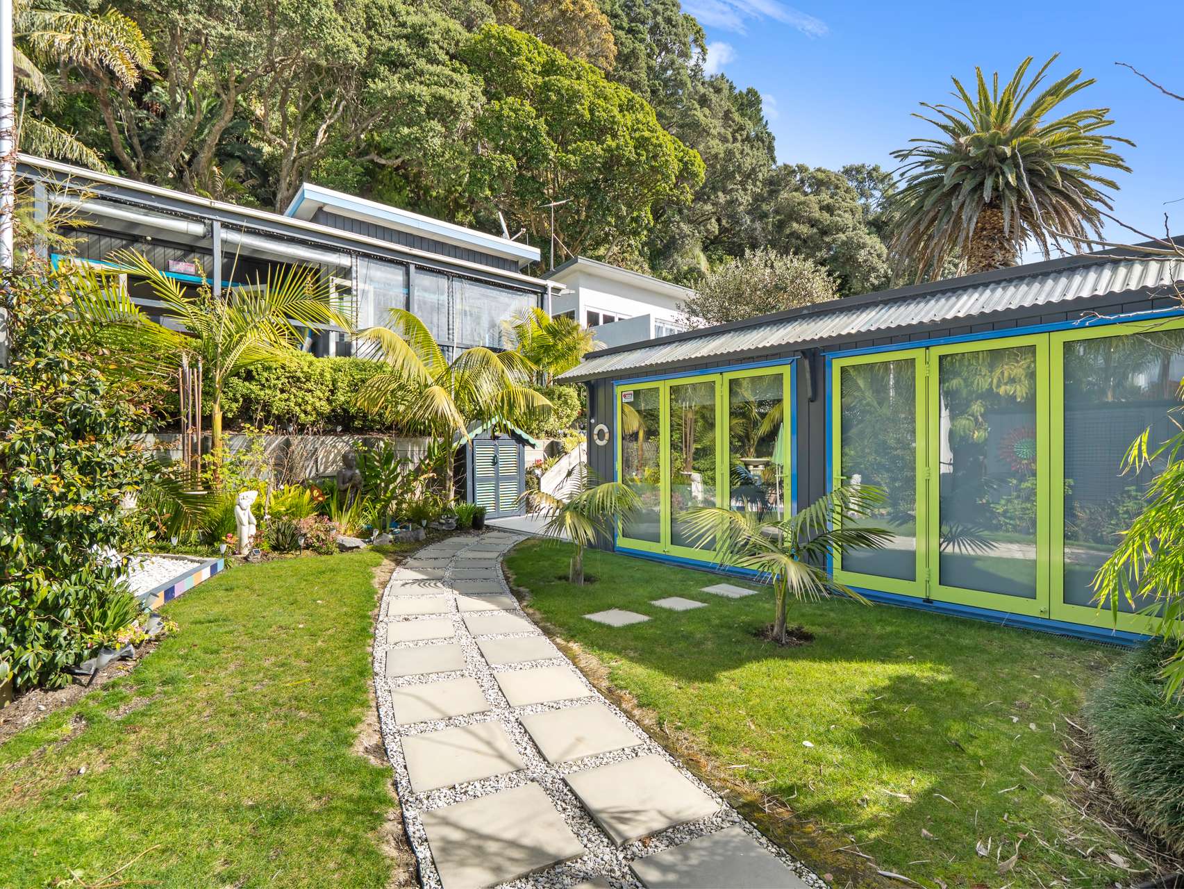 The main house features two bedrooms and one bathroom, with a bright open plan layout designed for easy living. The lounge is filled with natural light thanks to a skylight that glows warmly into the evening. From here you can catch glimpses of the ocean, a gentle reminder that Ohope’s celebrated beach is only moments away. The kitchen and dining connect effortlessly, making daily life simple and evenings with friends a pleasure. Throughout the home, colour has been incorporated thoughtfully, reflecting the owner’s eye for design and adding warmth and vibrancy without overwhelming the spaces. Both bedrooms are restful retreats with leafy outlooks, while the bathroom is fresh, modern and practical.
