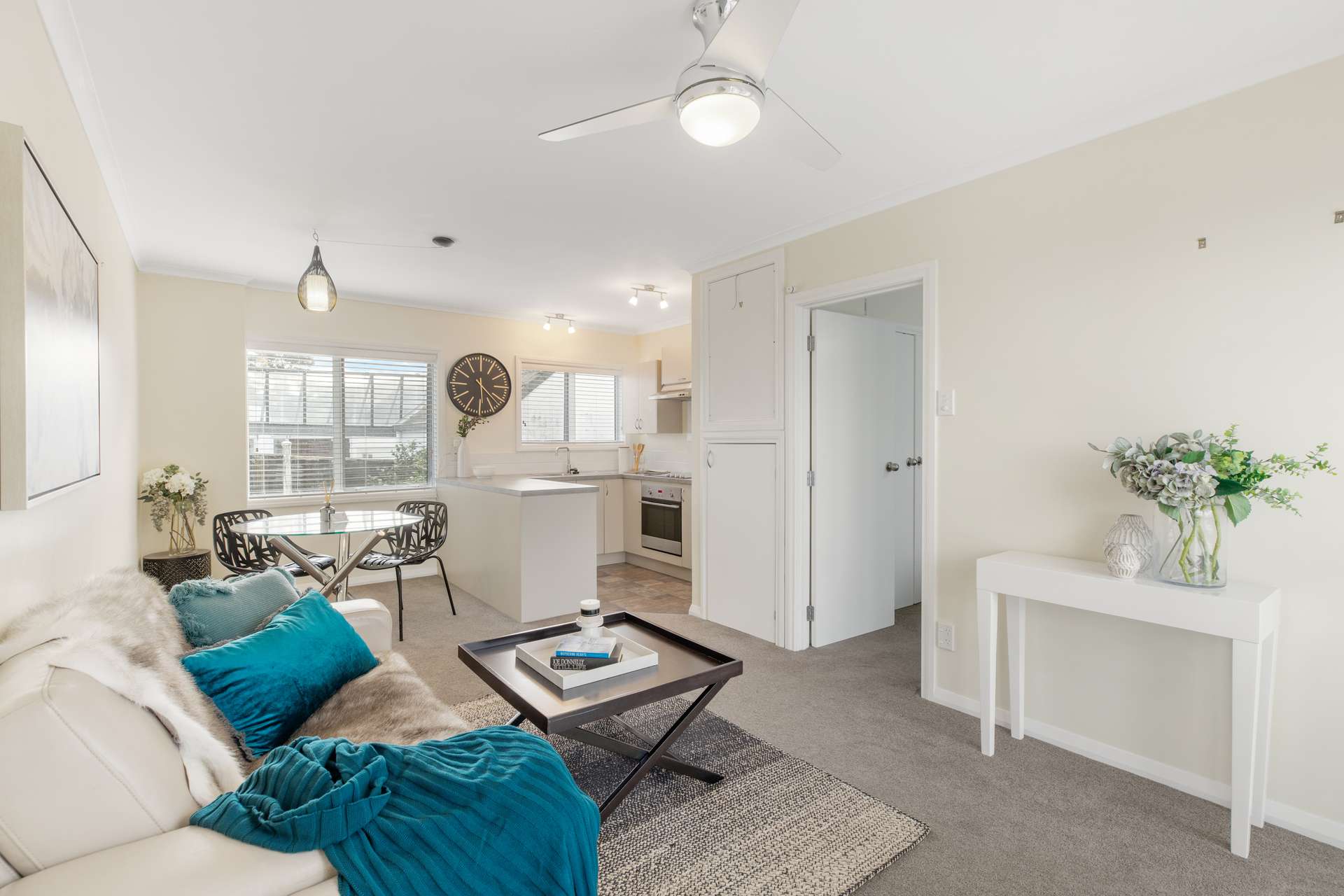 Feeling surprisingly spacious for a one bedroom, you are sure to fall in love at first sight. The main living area is open plan, with stunning shutters to take you outside. It has a ceiling fan for the heat of summer, plush carpet and lots of space for a comfy sofa where you can relax, read, or catch up on your favourite shows.