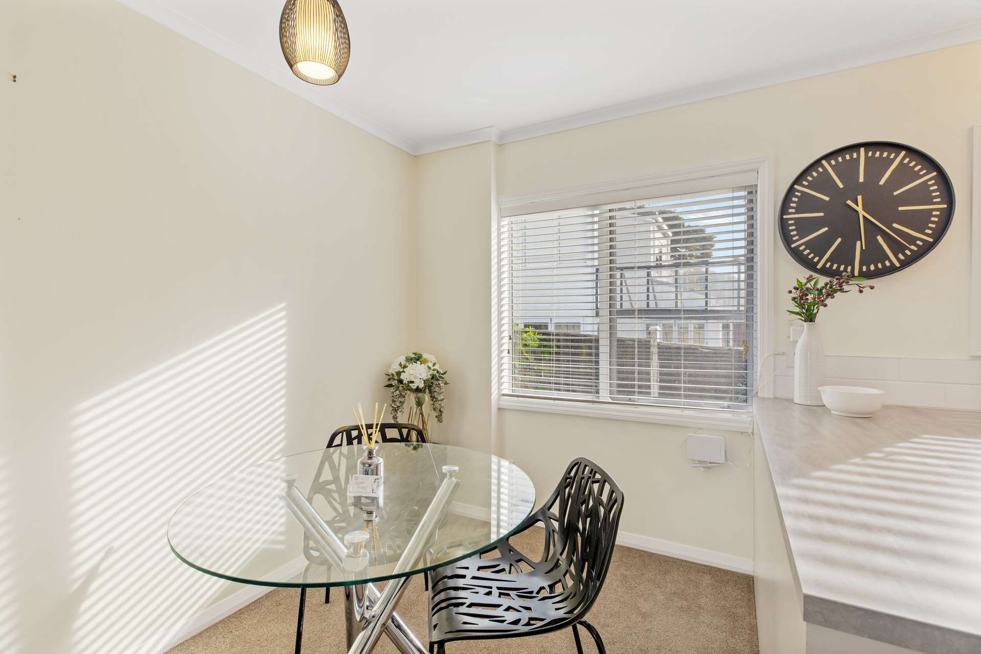 There’s a lovely dining area with good lighting, next to the kitchen. The kitchen is a generously sized U-shape with space for all of the essentials. It has a good amount of bench space, cabinet storage and a beautiful neutral colour palette.