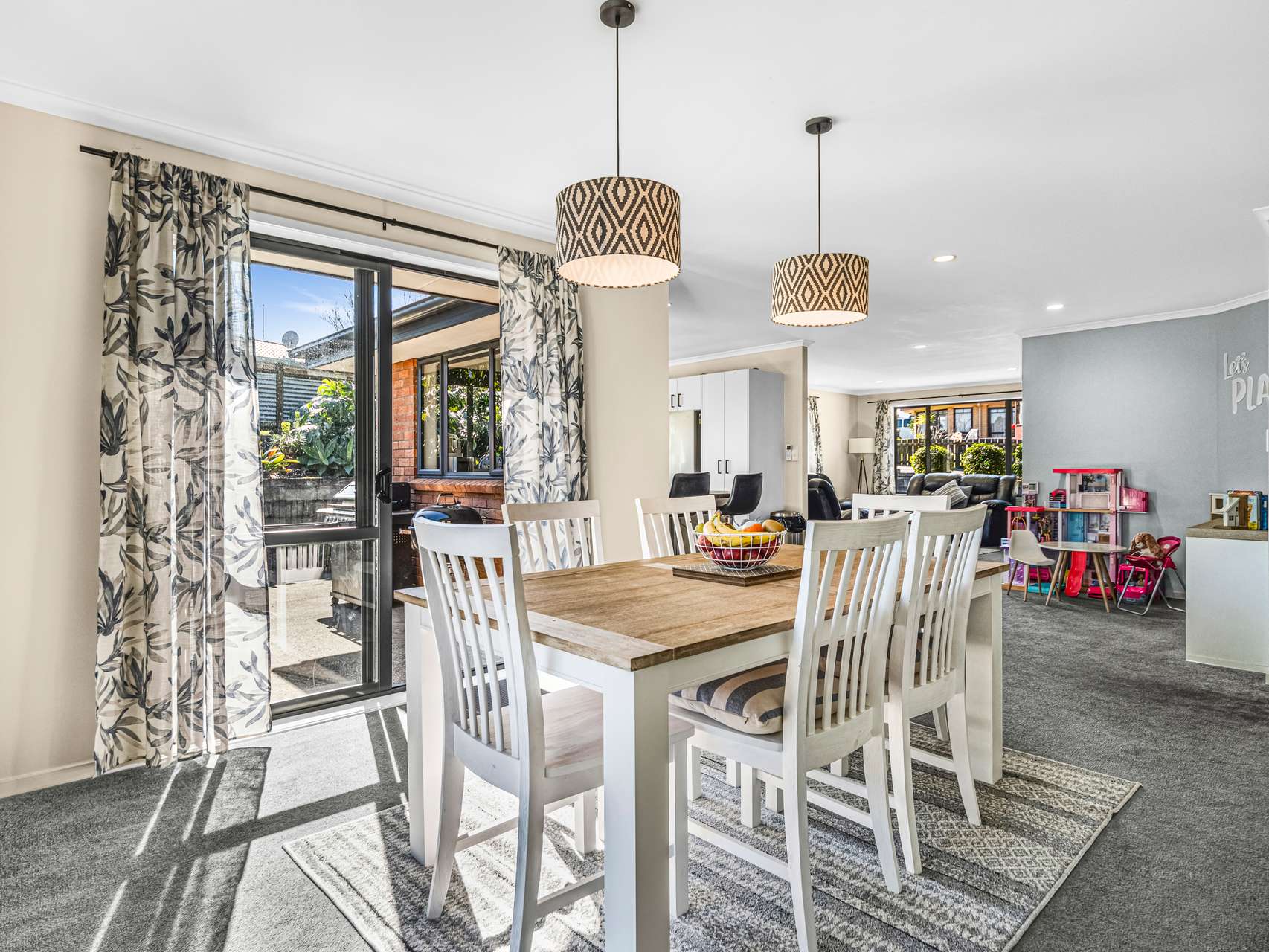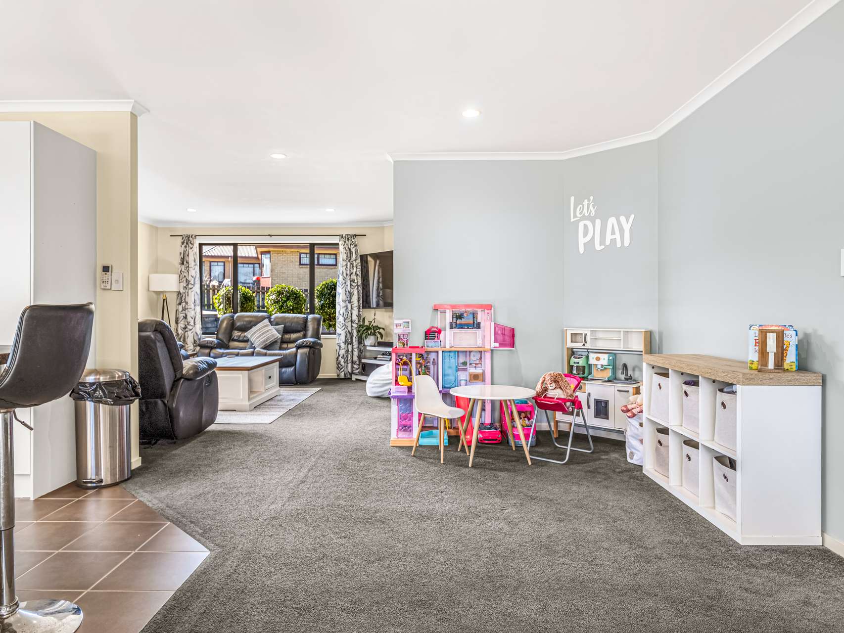 Inside, a series of connected zones makes daily life flow with ease. The front lounge, bathed in soft light from dual aspect windows, is kept comfortable year-round with a heat pump. The open-plan kitchen, dining, and living area forms the home’s heart, where a sleek U-shaped kitchen with stone-look benchtops, modern appliances, and breakfast bar seating makes cooking and conversation go hand in hand. Adjacent to this, a dedicated kids’ play corner keeps little ones entertained while still in sight. From the dining area, doors open to the patio, perfect for sliding between indoor dinners and evenings under the stars.