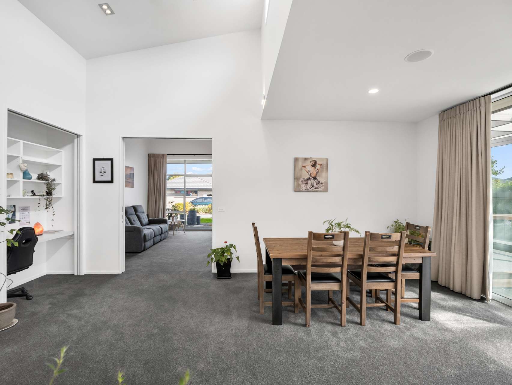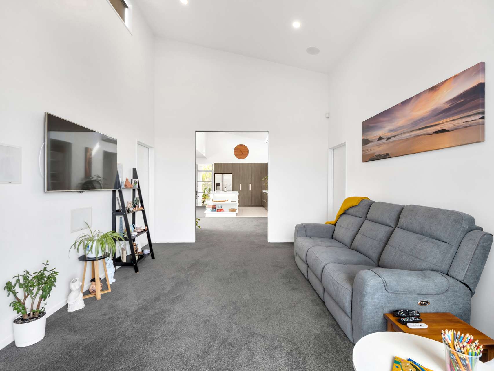The solid-plaster-over-brick exterior gives the property its strong, timeless presence, while inside, soaring raked ceilings & expansive windows flood the home with natural light. The generous open-plan kitchen, dining, & living area is the ultimate hub for entertaining, featuring a sleek oversized island bench & stainless-steel appliances. A separate lounge, media room & study nook ensure everyone has space to unwind or focus. Year-round comfort comes effortlessly with a gas fire, two heat pumps & under-tile heating, enhanced by ceiling speakers & a central vacuum system.