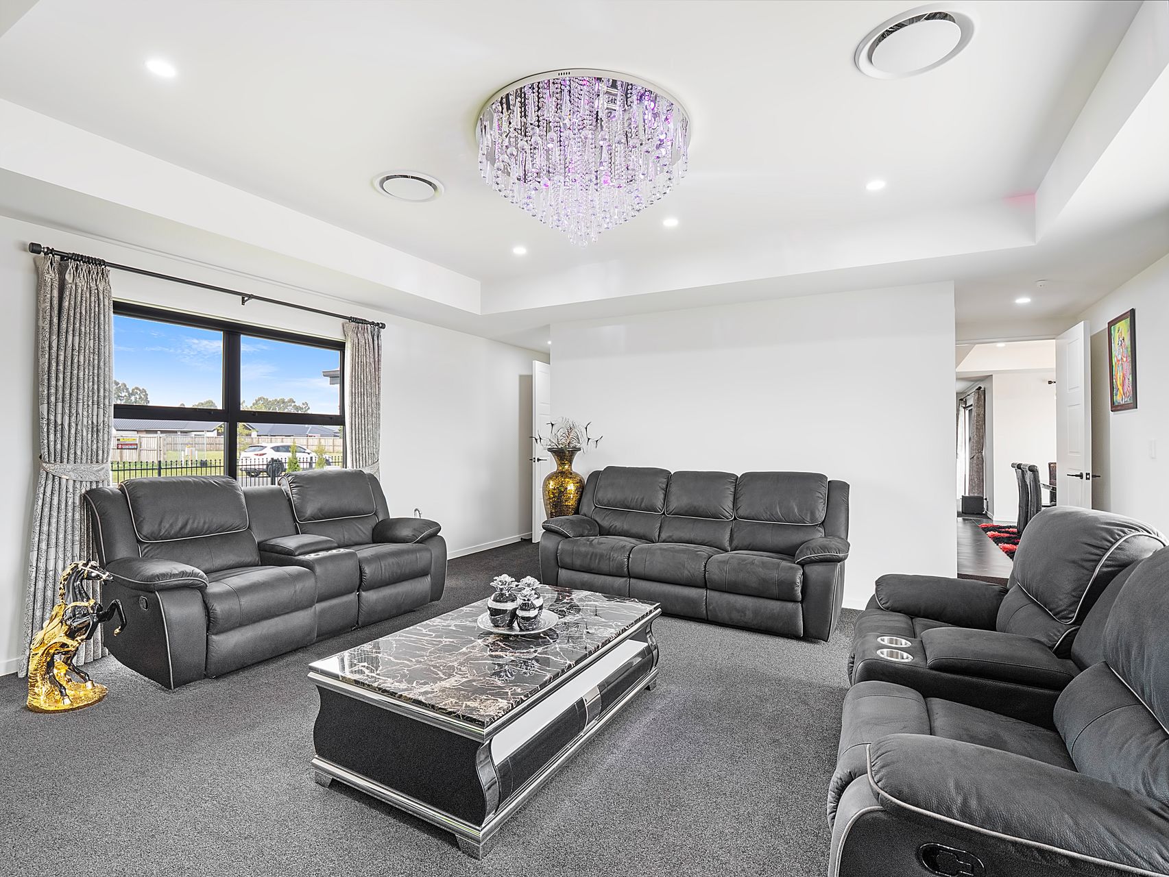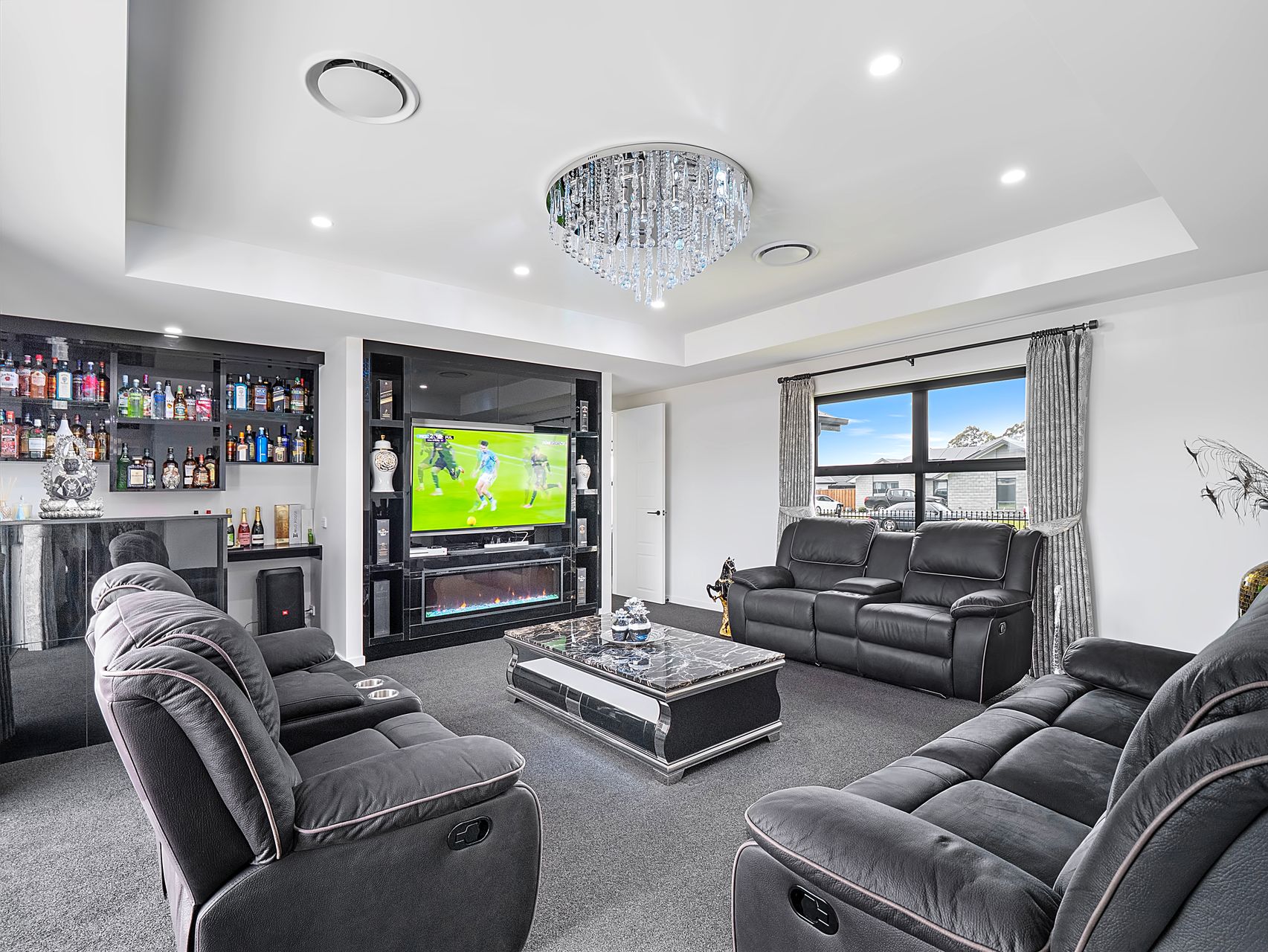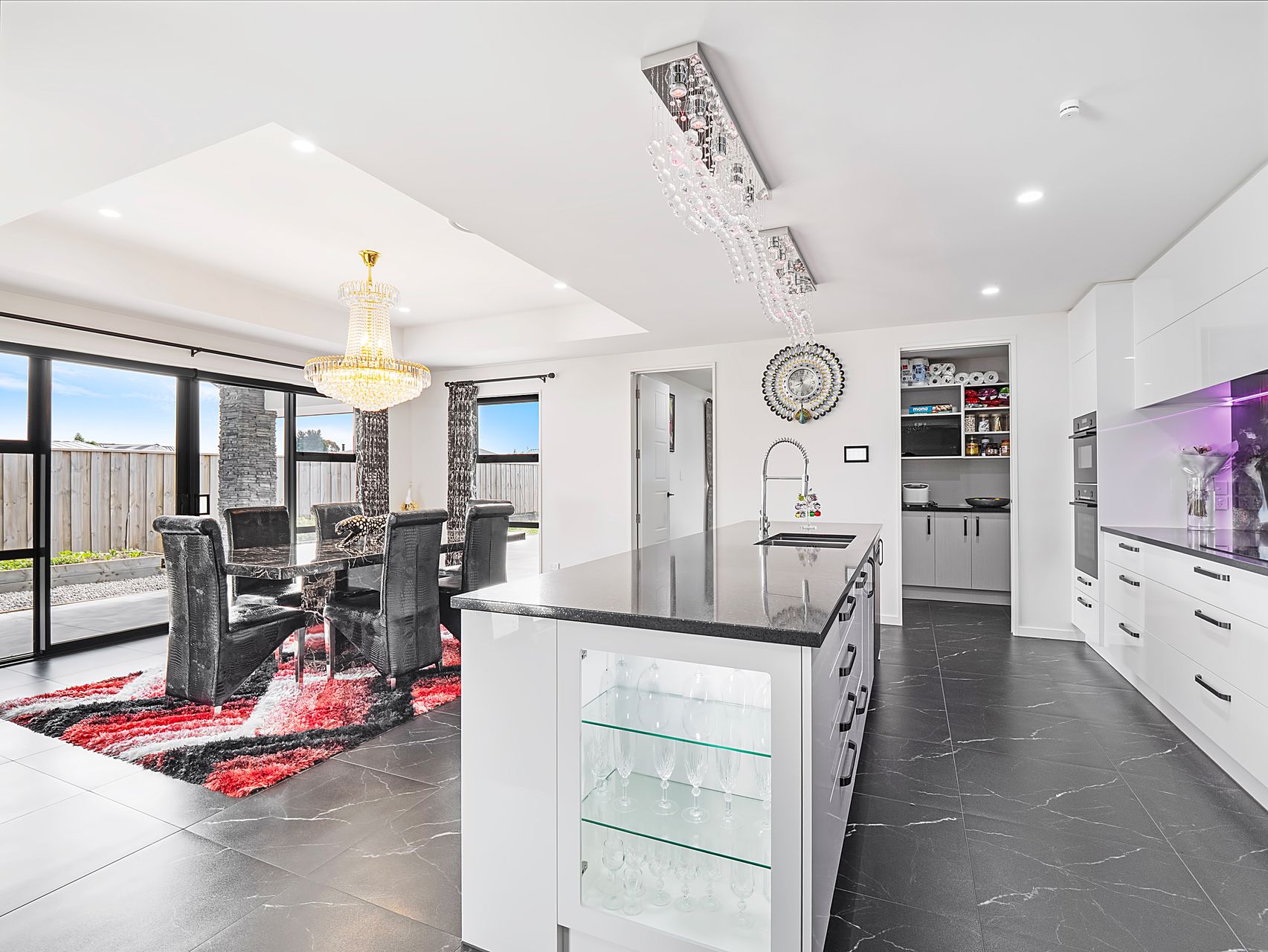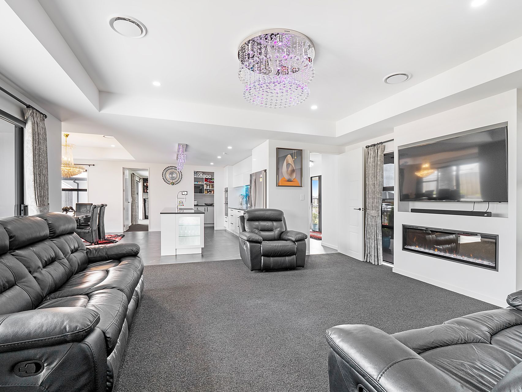 The layout centres around a well-appointed kitchen that does the heavy lifting. A long island bench with breakfast bar seating, quality appliances, a walk-in pantry and generous bench space mean there’s room for more than one home chef at a time. The dining area sits alongside under a feature chandelier, with ranch sliders opening to the patio for easy indoor-outdoor flow. From here, you move naturally into the family room - light, open and ideal for day-to-day living - while a separate lounge offers a quieter retreat with built-in cabinetry and an electric fireplace.