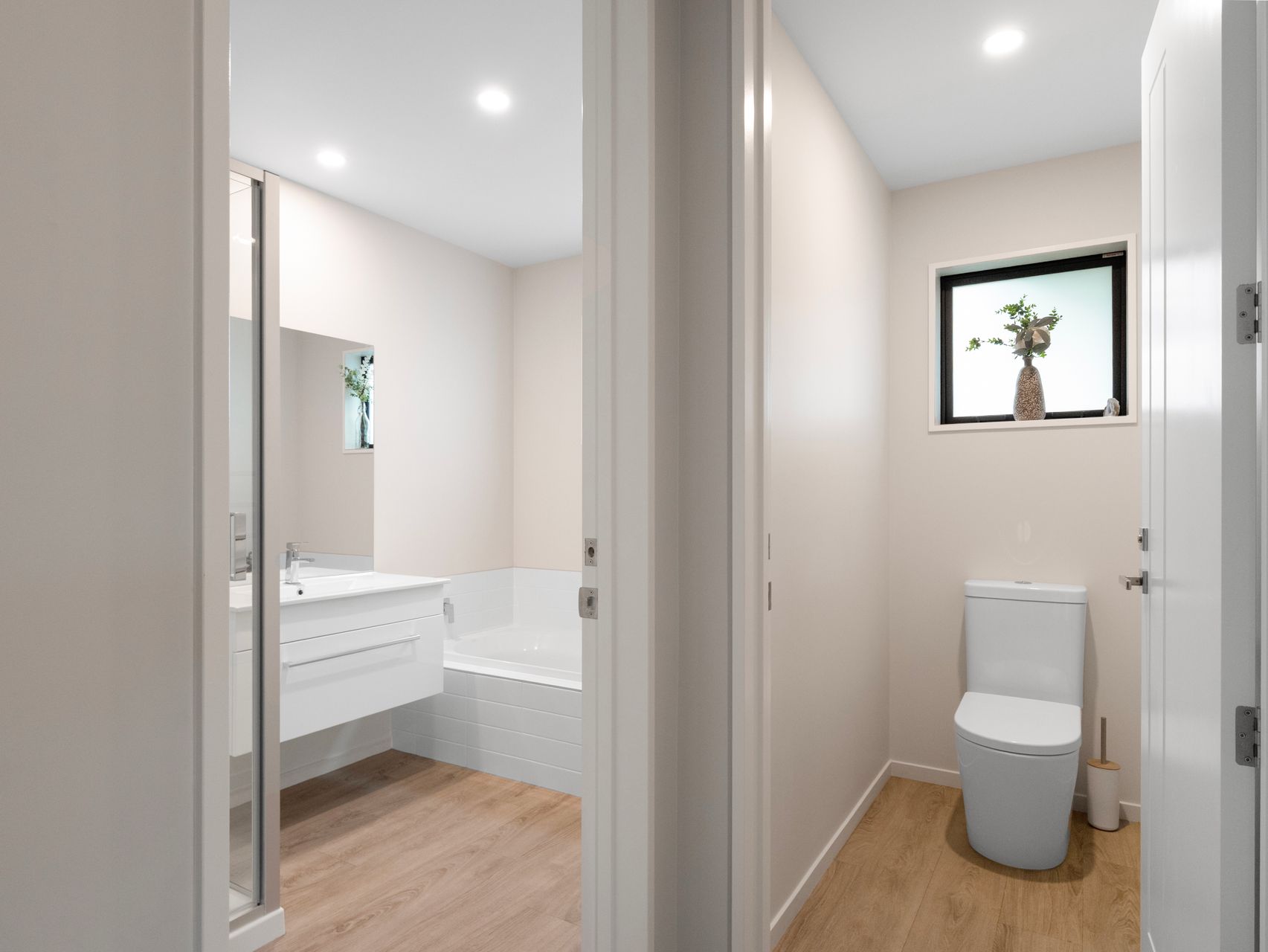 The master suite is privately positioned away from the additional bedrooms, offering a peaceful retreat with stacker sliders to the patio, a walk-in wardrobe and a tiled ensuite with underfloor heating. Two further double bedrooms are well-proportioned and serviced by a family bathroom and a separate toilet with handbasin.