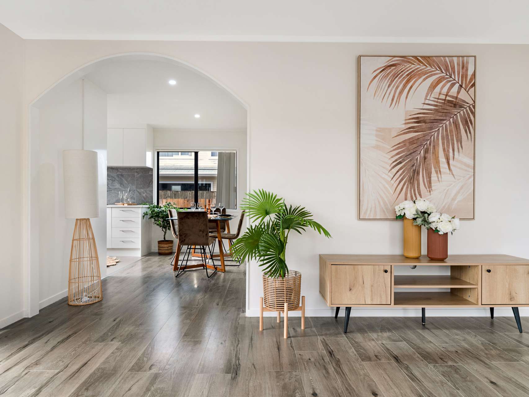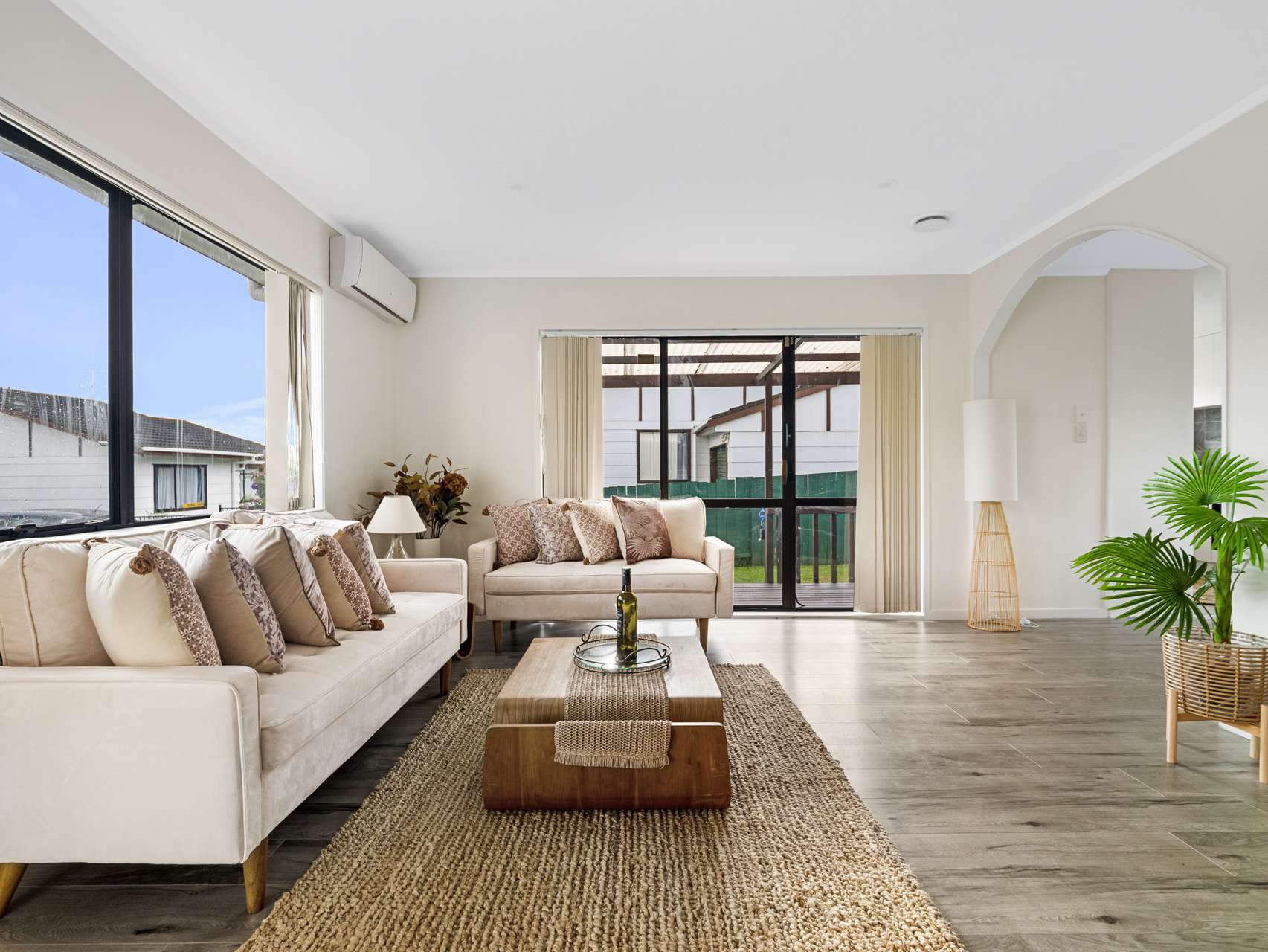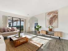 The impressive kitchen features quality appliances, sleek modern cabinetry, stylish stone benchtops, and elegant tiling. It seamlessly connects to a sunlit dining area, perfect for enjoyable mealtimes. A large archway leads to the spacious open-plan living area, a serene space for relaxation, complete with a heat pump for year-round comfort.