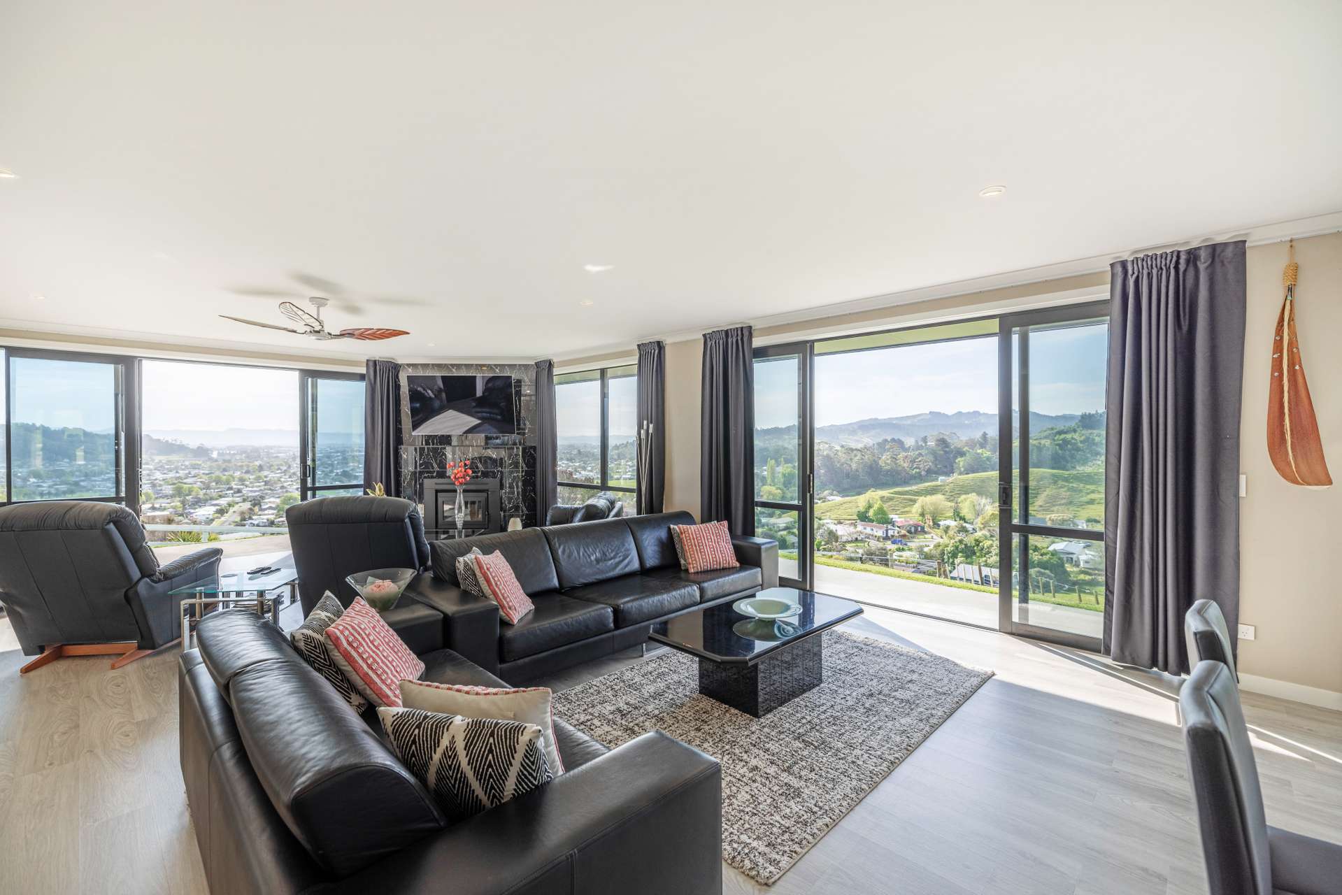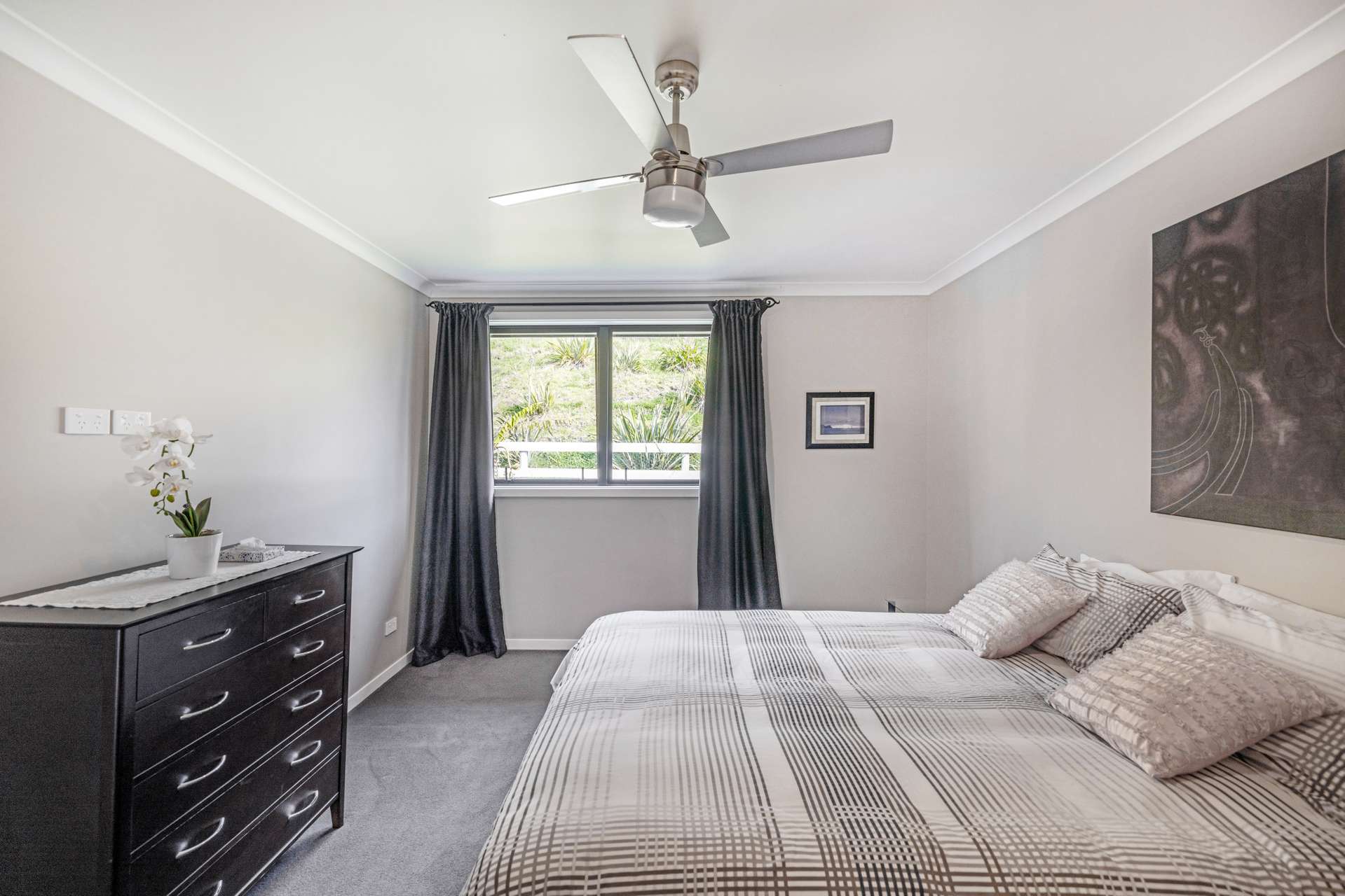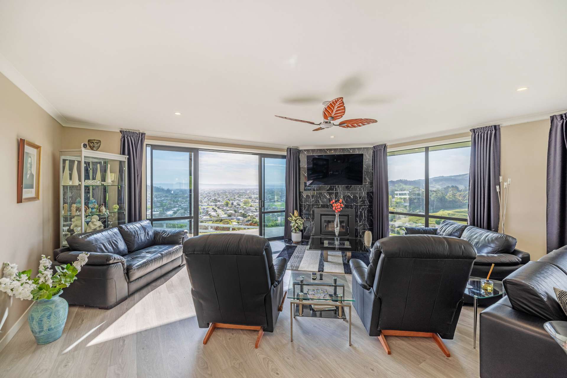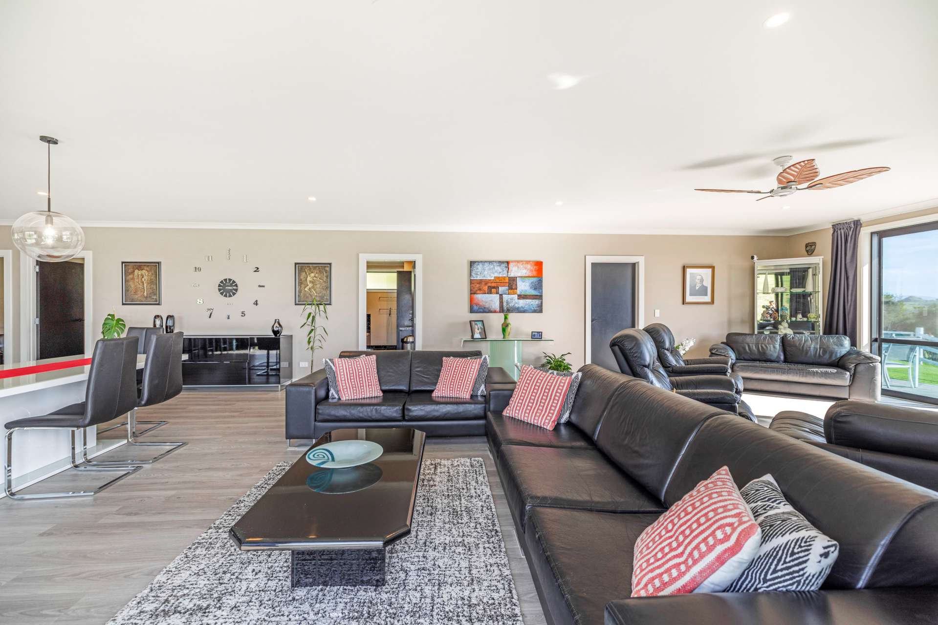 The heart of the home is the expansive open-plan living area that flows out seamlessly to an exquisite entertainers area. The home is finished in warm, light neutral colours, complemented by beautiful flooring and large windows that showcase the panoramic views. A ceiling fan keeps things cool in the summer months, making the space comfortable all year round.