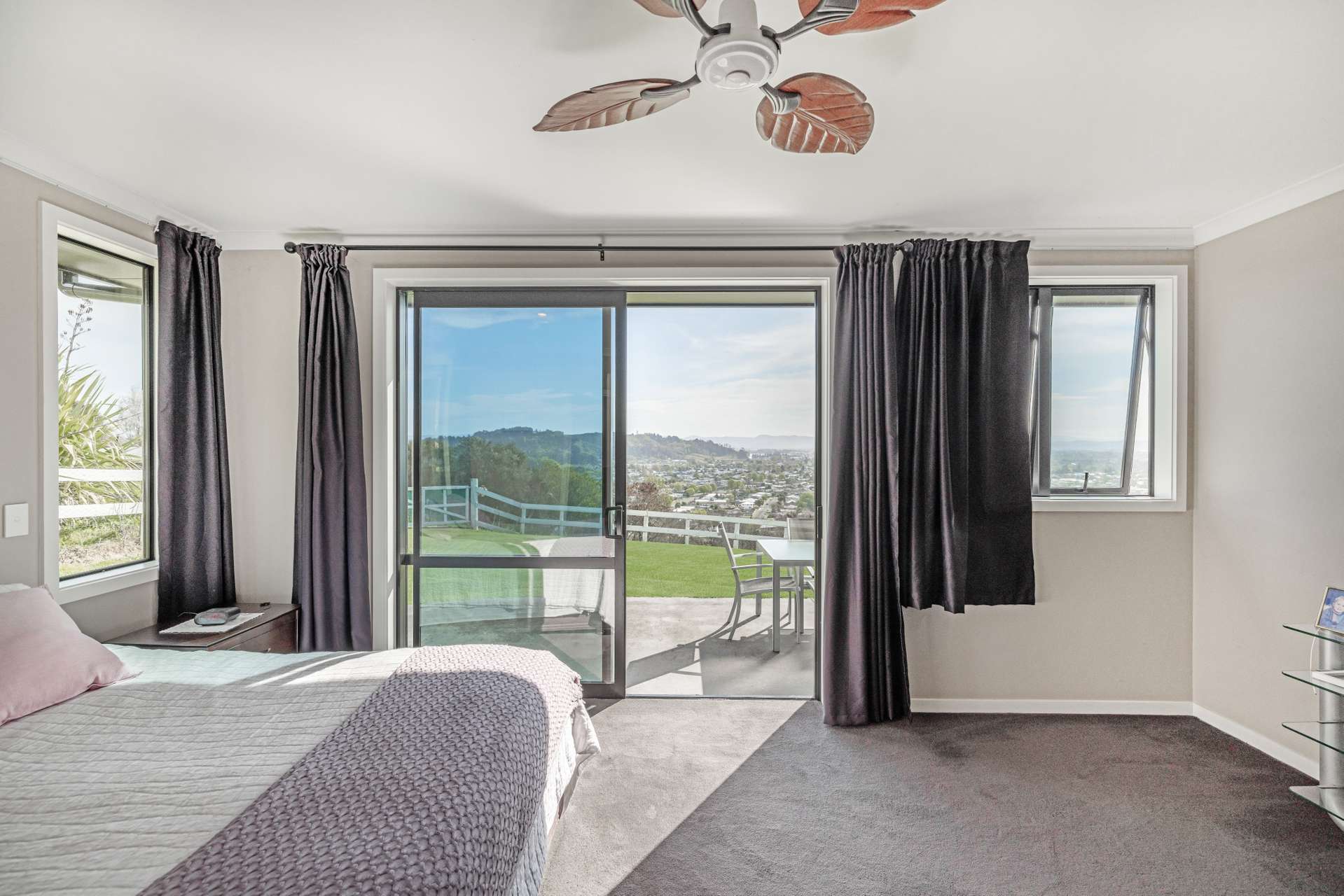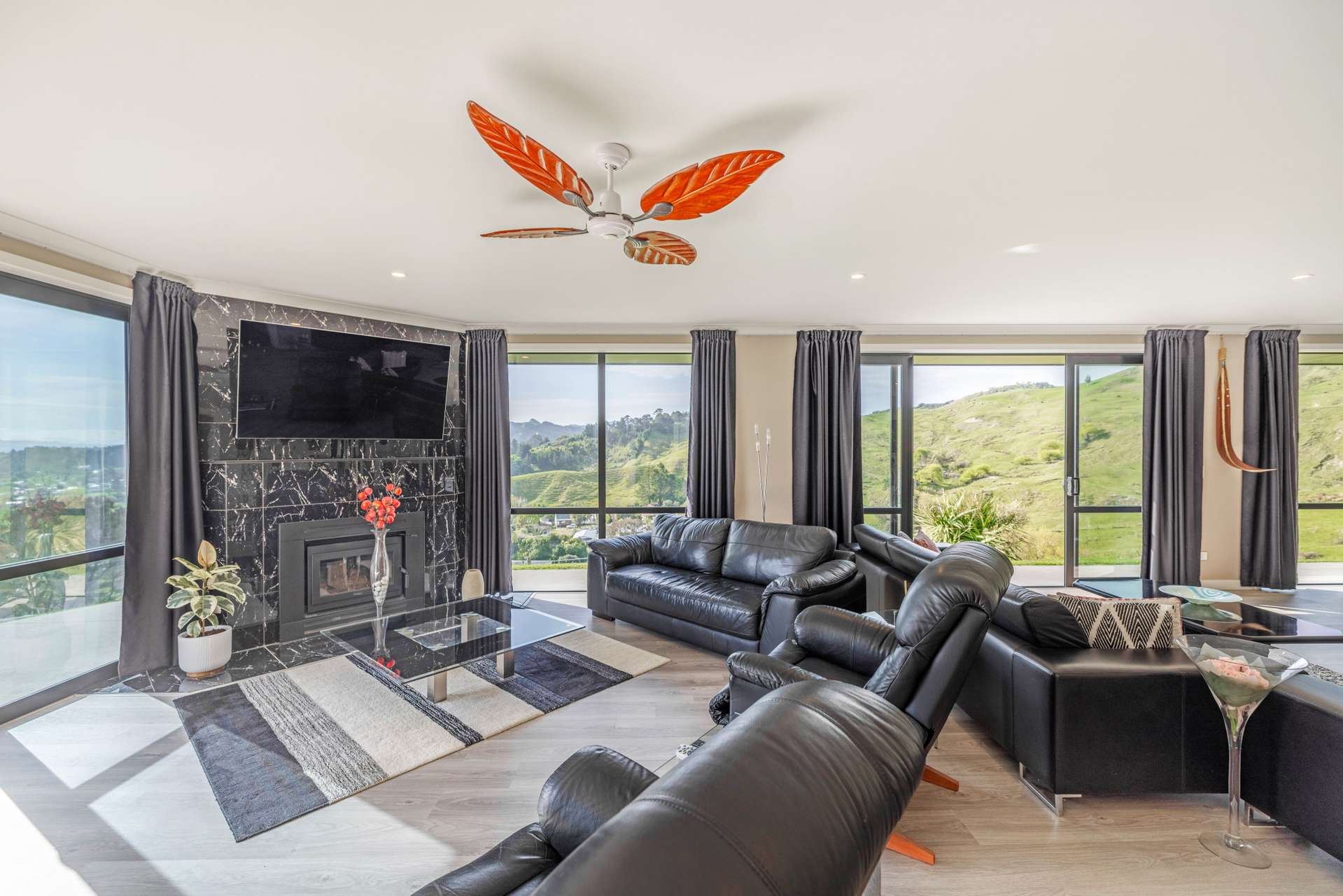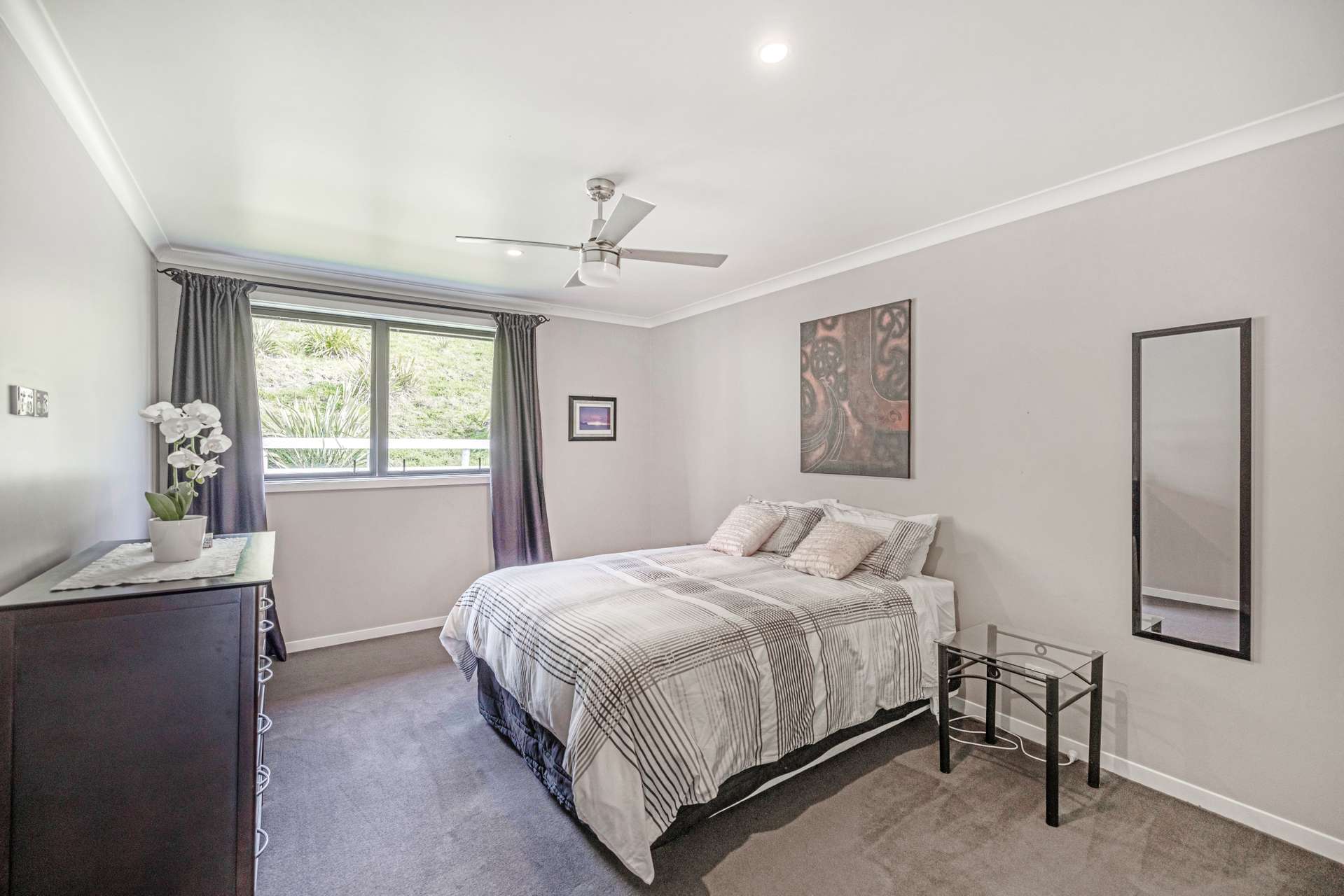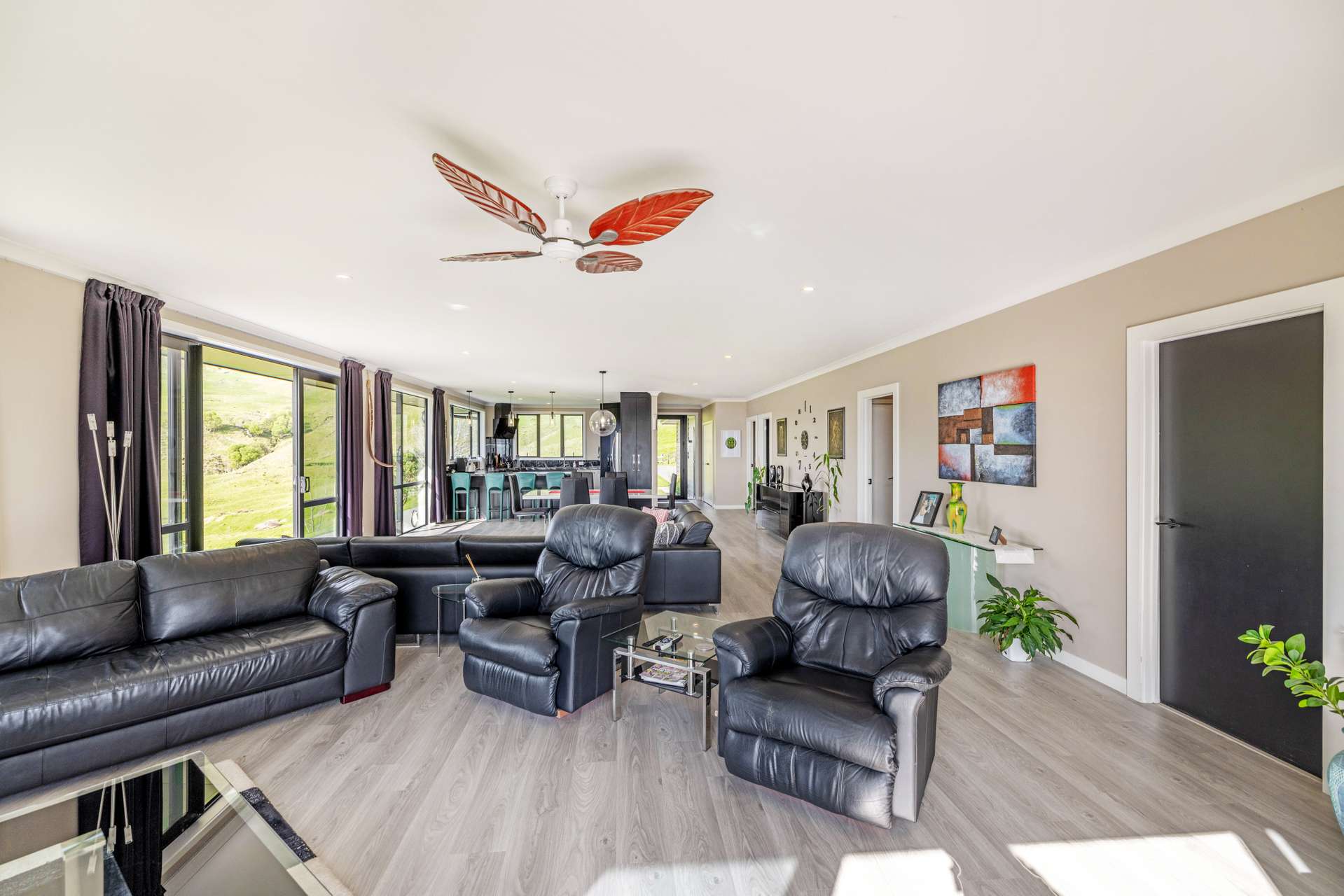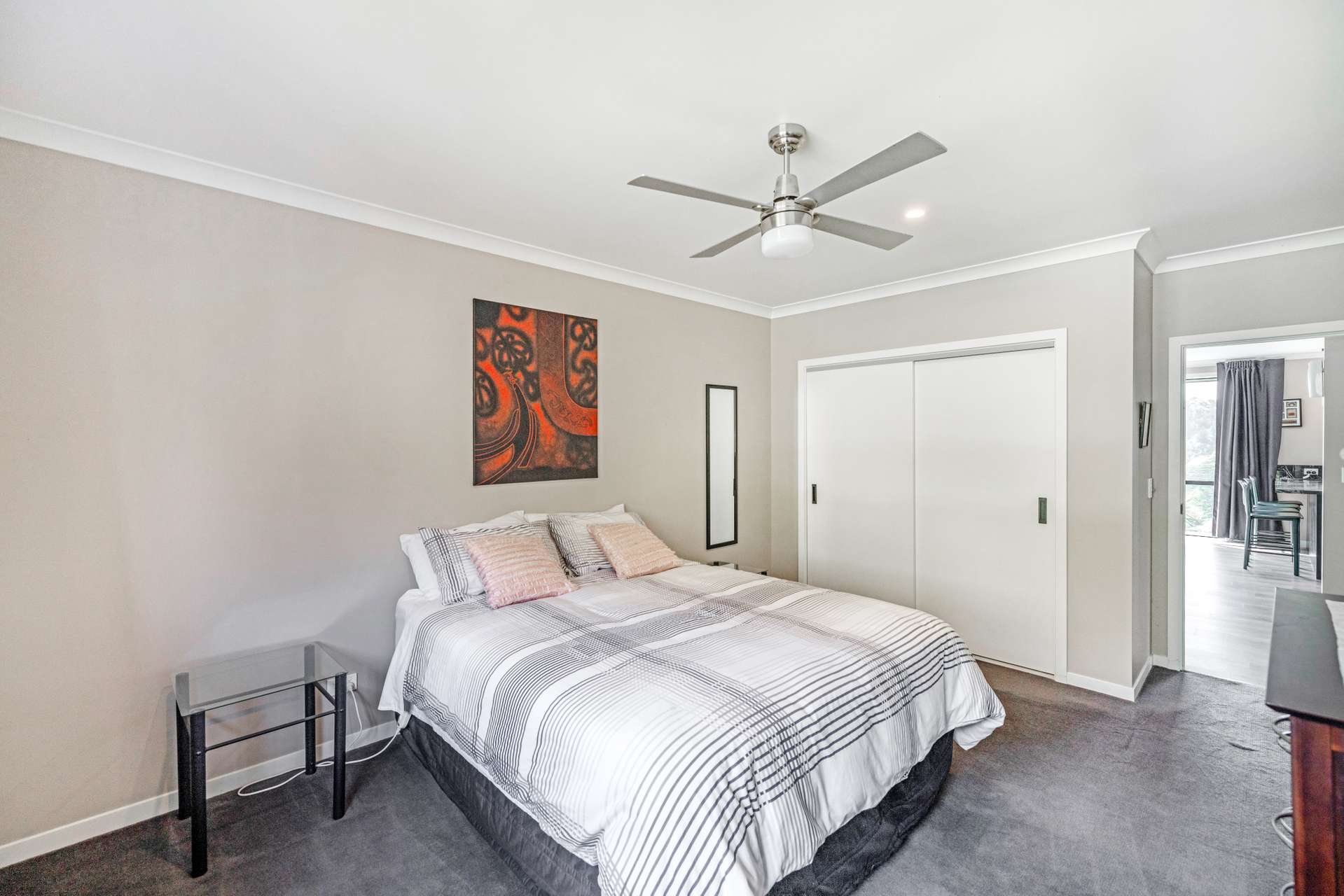 The heart of the home is the expansive open-plan living area that flows out seamlessly to an exquisite entertainers area. The home is finished in warm, light neutral colours, complemented by beautiful flooring and large windows that showcase the panoramic views. A ceiling fan keeps things cool in the summer months, making the space comfortable all year round.