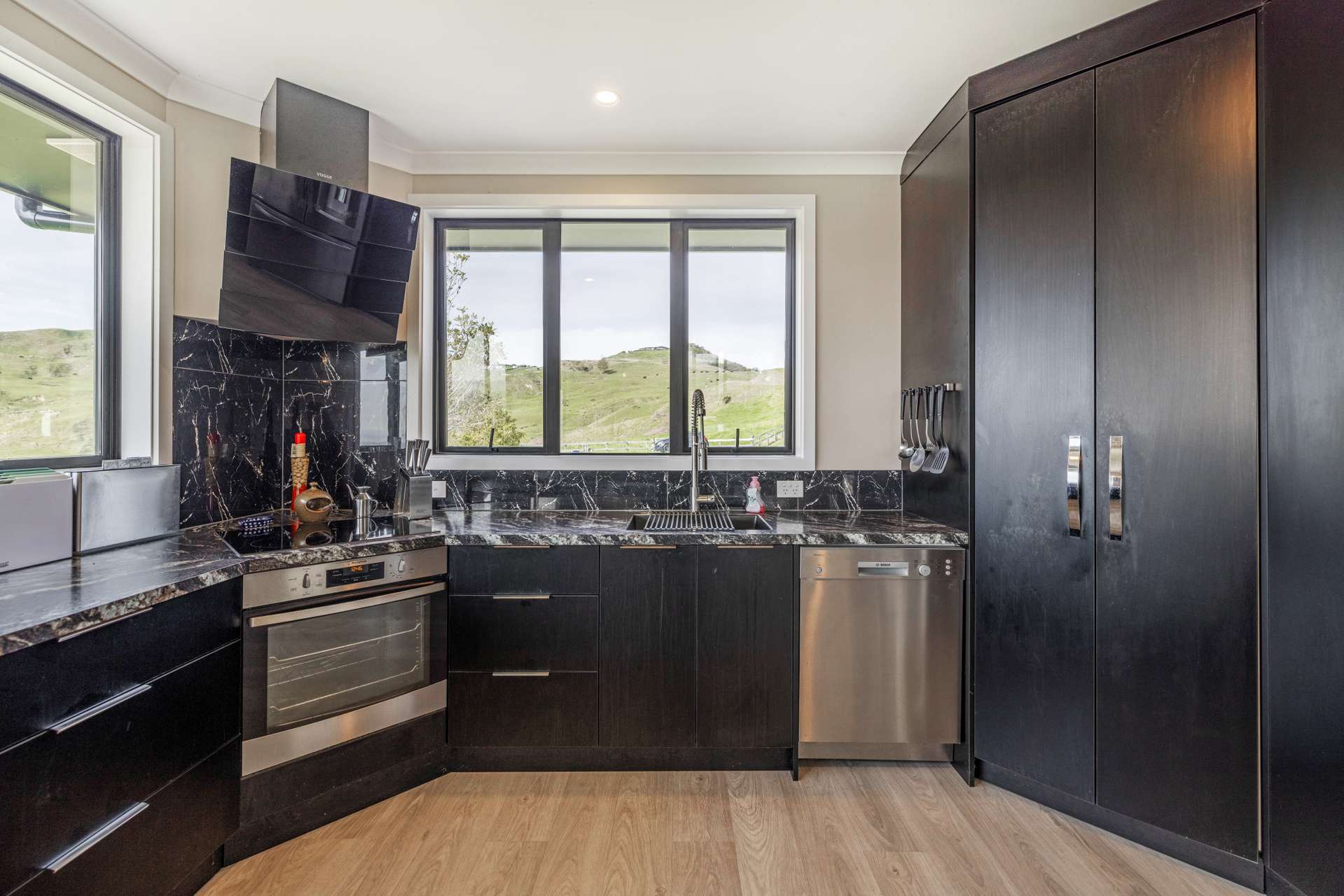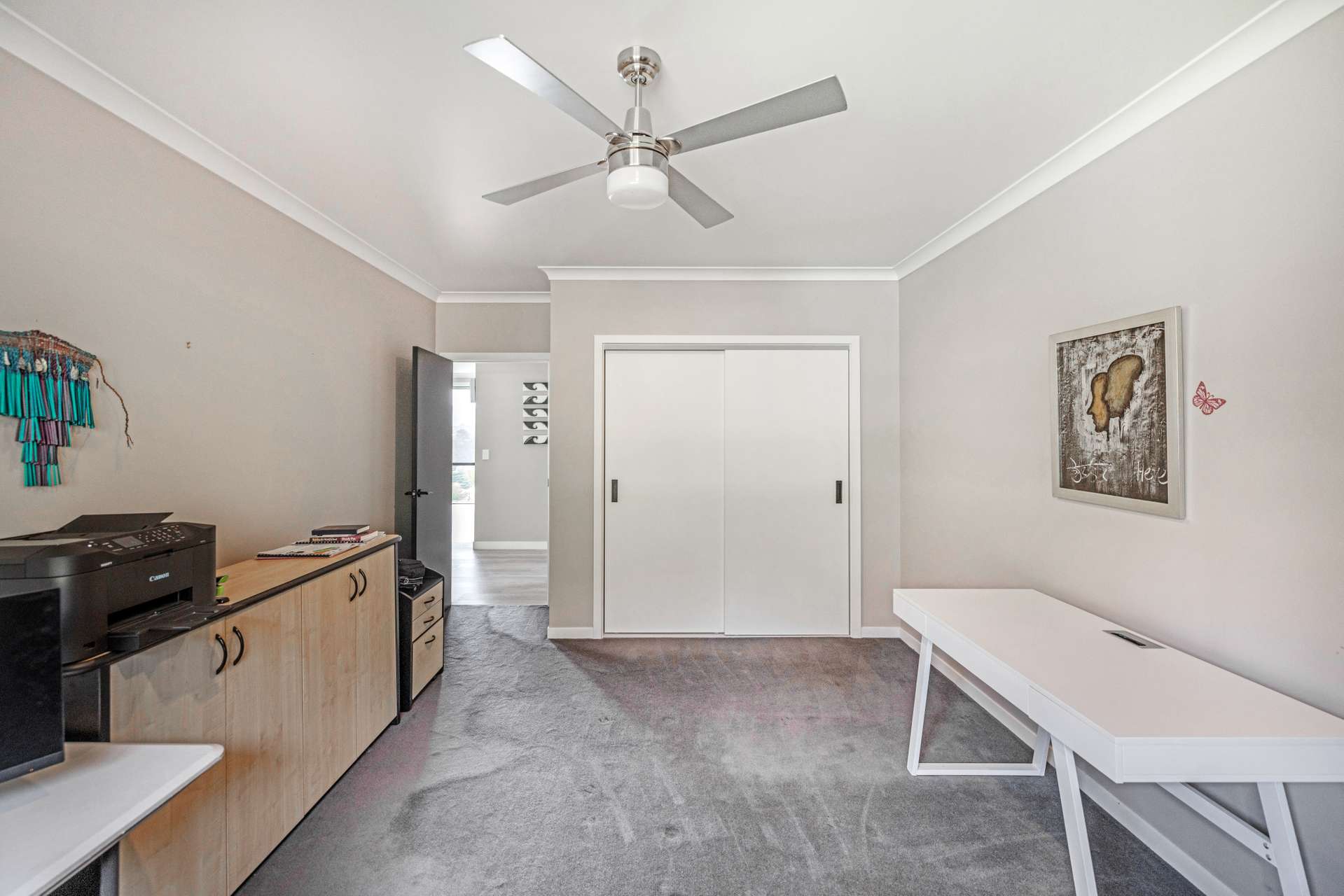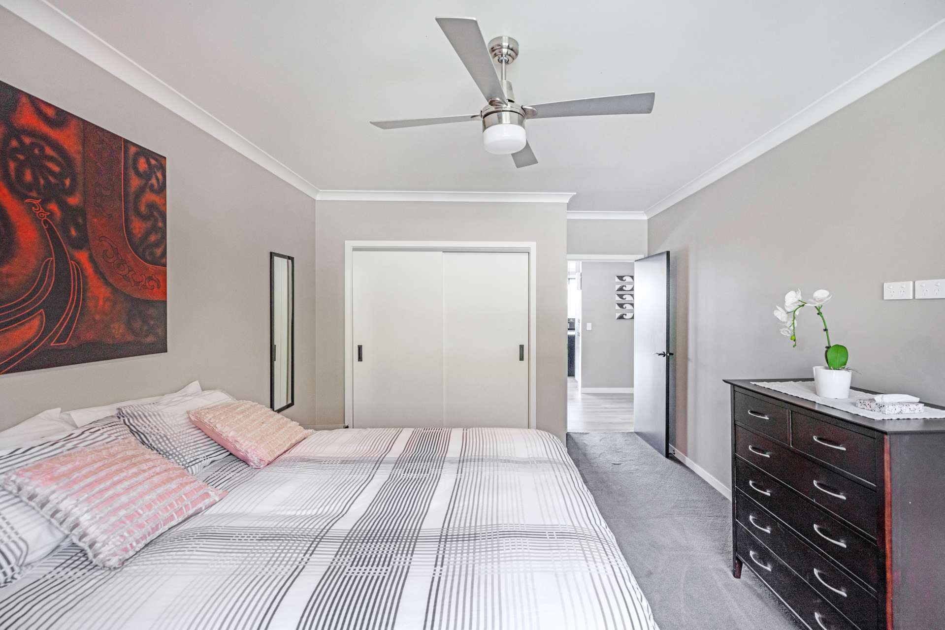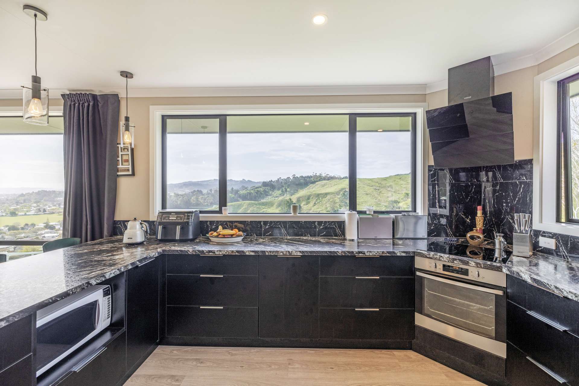 The heart of the home is the expansive open-plan living area that flows out seamlessly to an exquisite entertainers area. The home is finished in warm, light neutral colours, complemented by beautiful flooring and large windows that showcase the panoramic views. A ceiling fan keeps things cool in the summer months, making the space comfortable all year round.