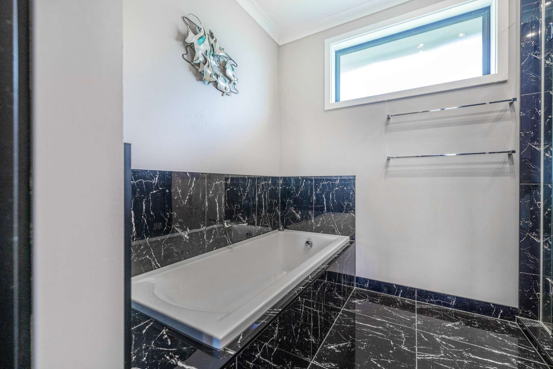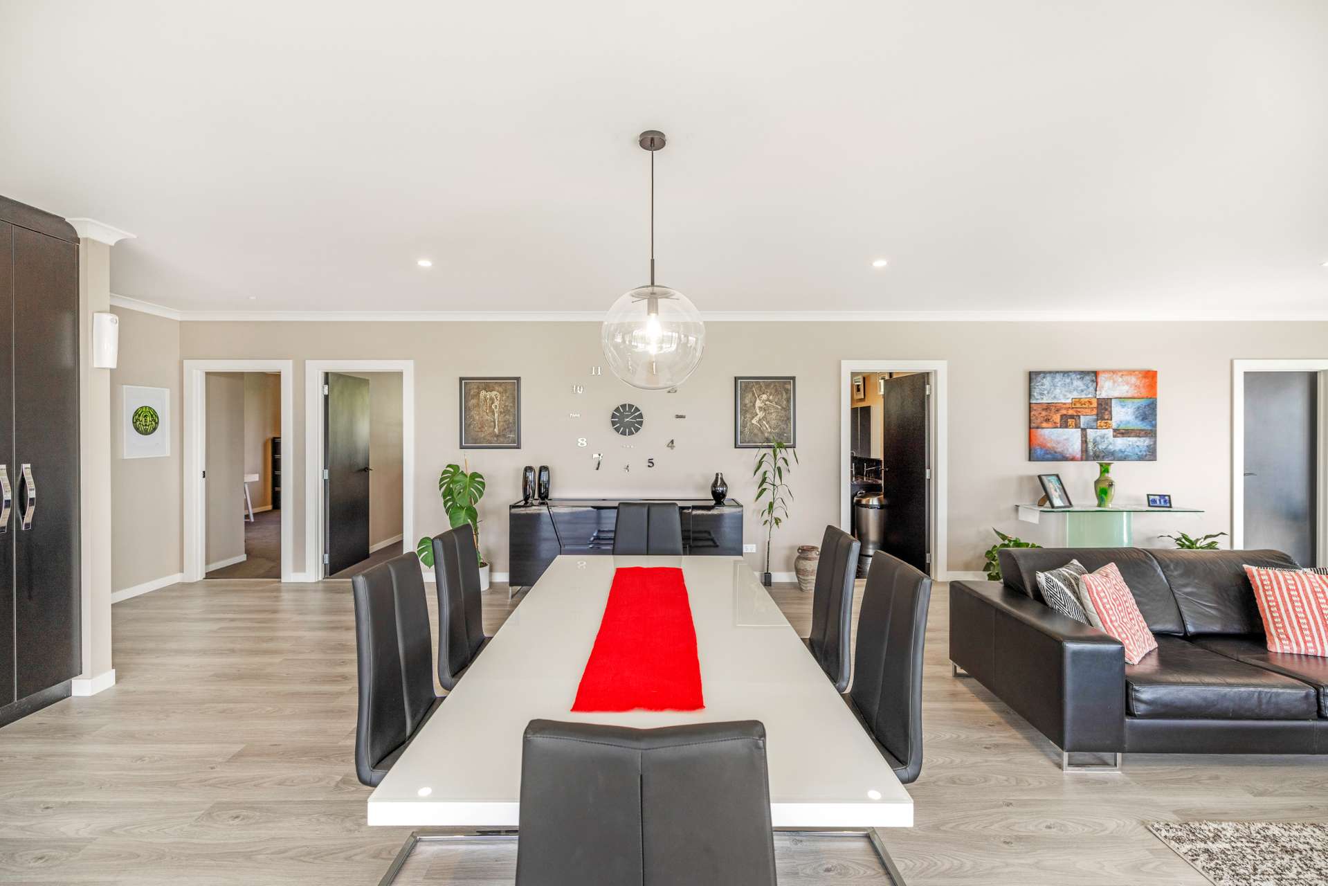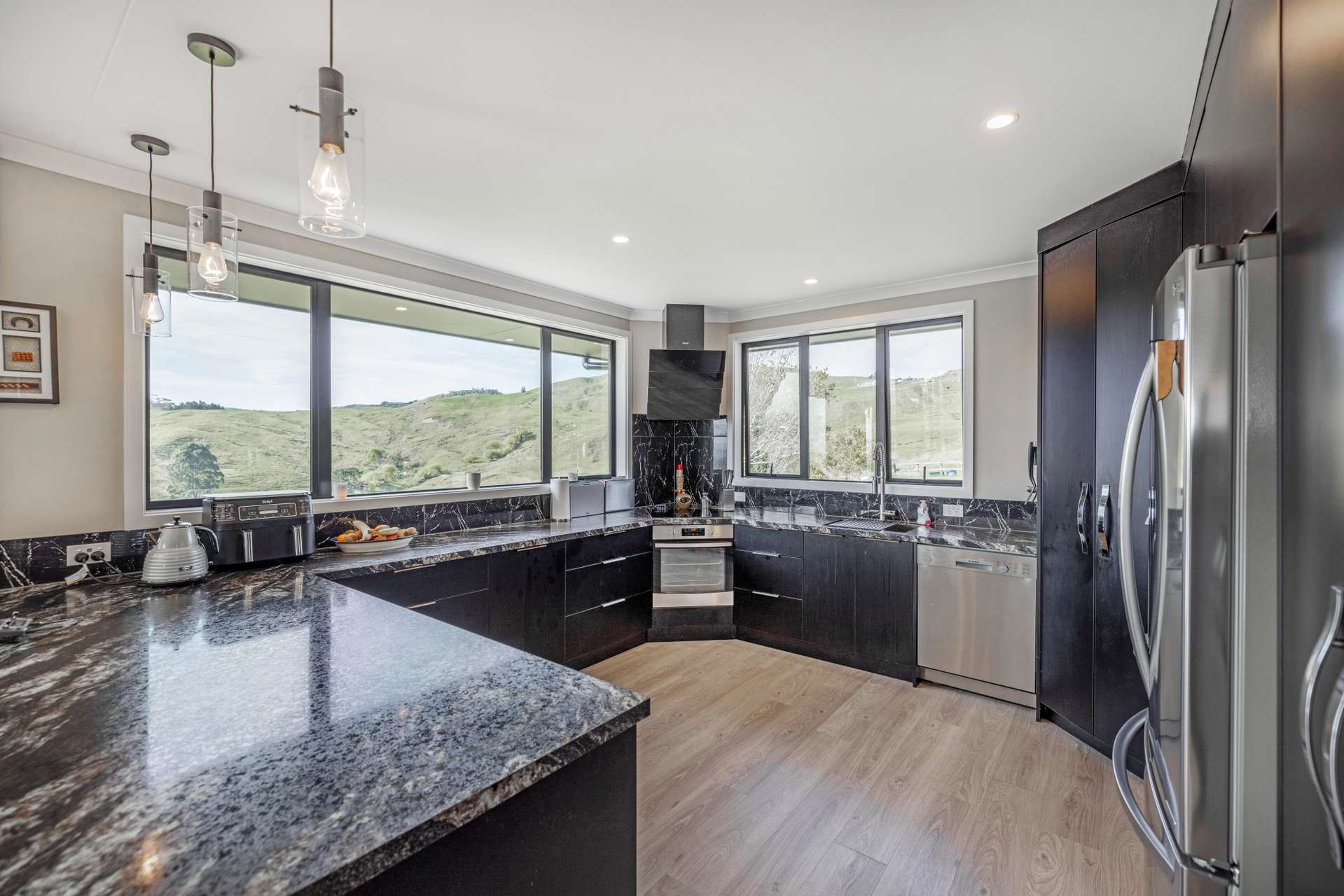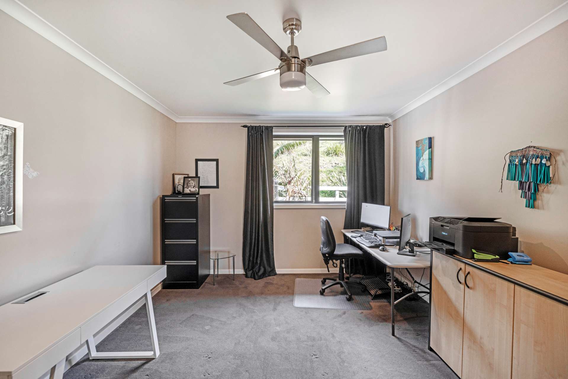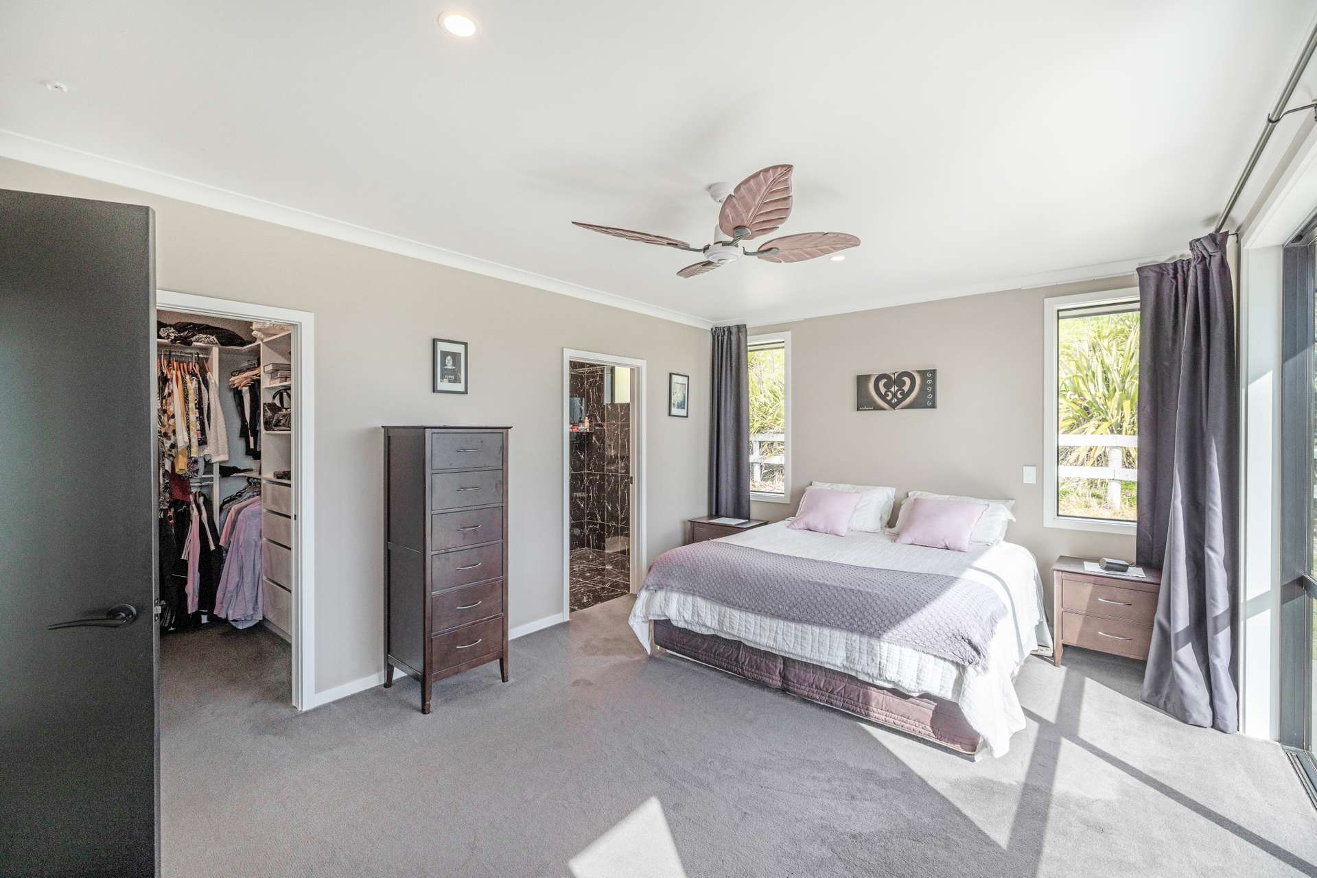 The heart of the home is the expansive open-plan living area that flows out seamlessly to an exquisite entertainers area. The home is finished in warm, light neutral colours, complemented by beautiful flooring and large windows that showcase the panoramic views. A ceiling fan keeps things cool in the summer months, making the space comfortable all year round.