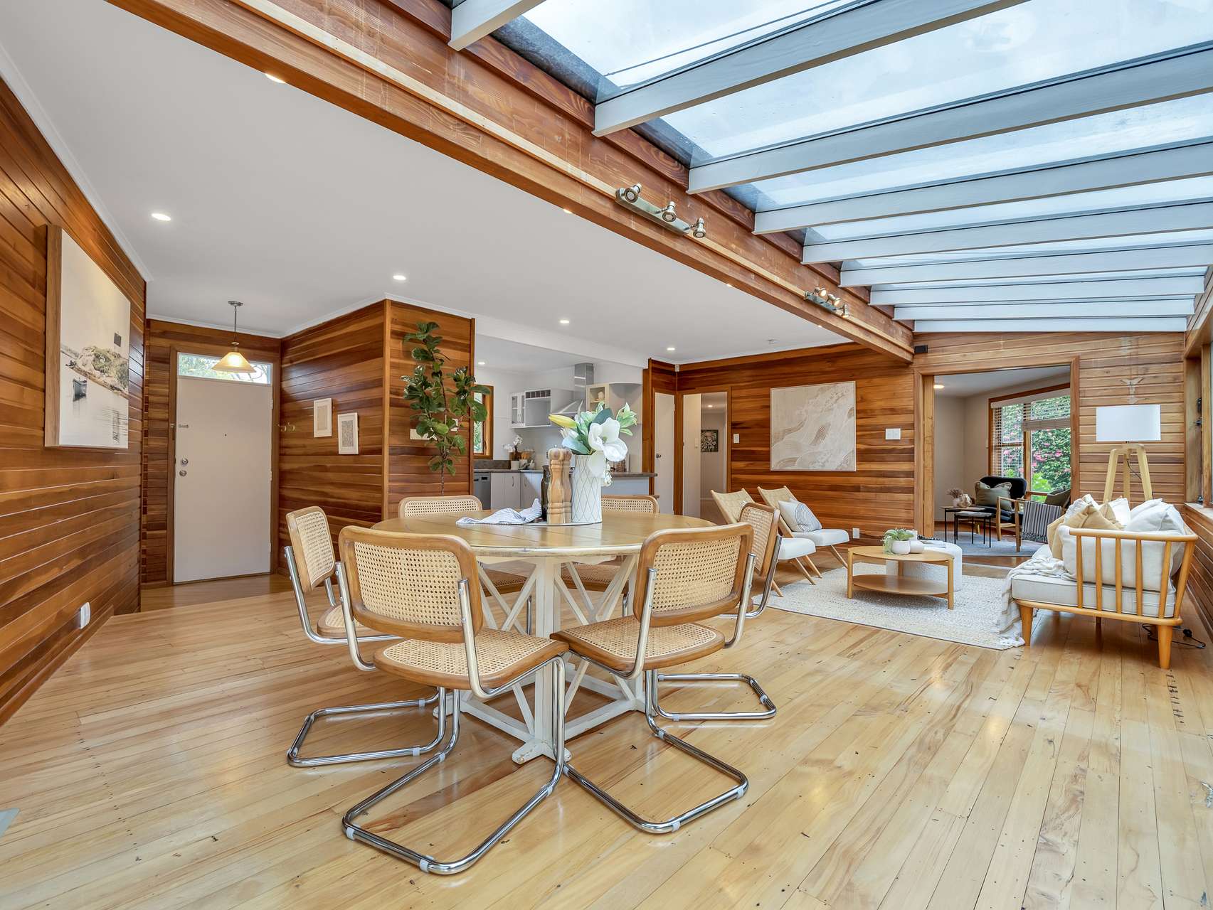 The heart of the home is a large and light-filled dining/sitting room/kitchen where timber walls, native flooring and ceiling windows provide warmth and character. Open the french doors and you have another living space – a large deck that looks over the garden. Move into the lounge and you will find full-height windows, polished timber floors, a wood burner and french doors to the deck. This room feels just as good on a winter morning as it does when the sun pours in after work and natural tones plus garden views keep the atmosphere calm and connected.
