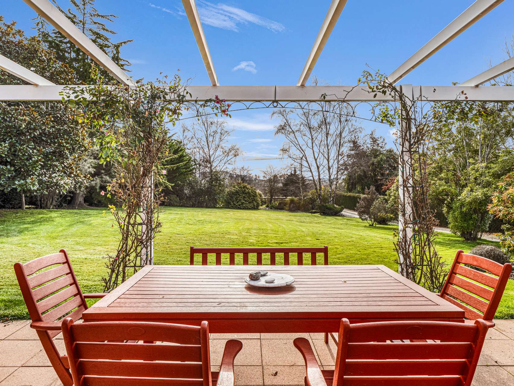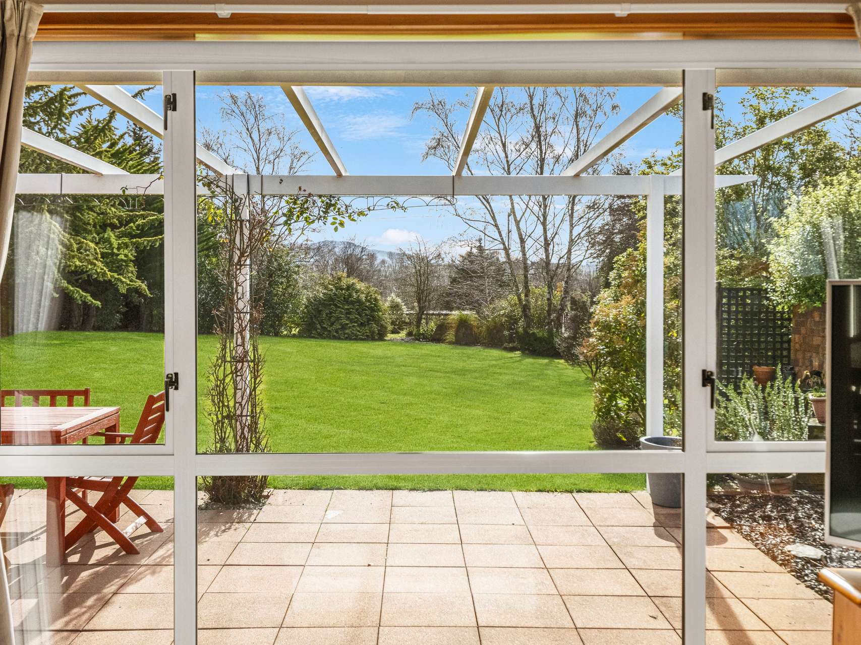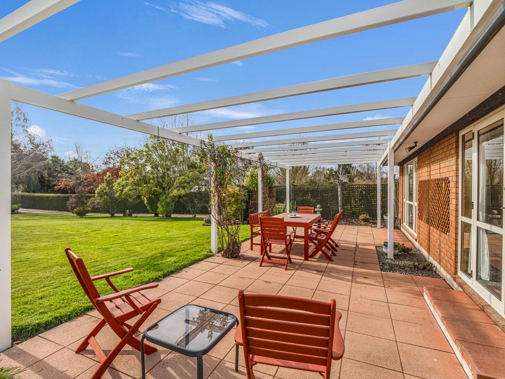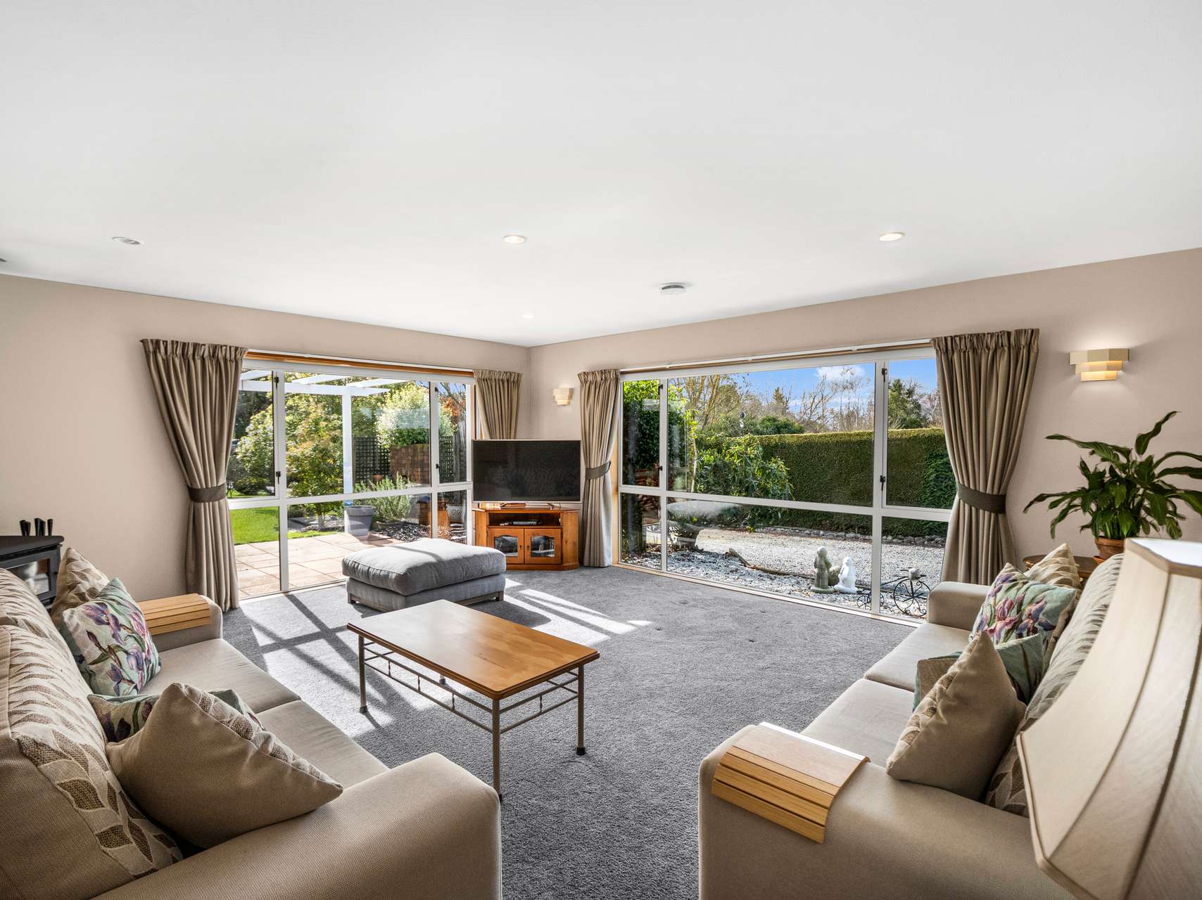 A skylit entry leads into the open-plan living and dining areas, where large windows frame delightful garden scenes, with sliding doors connecting to a sun-drenched paved patio. The classic country kitchen is both inviting and intelligently designed, featuring ample cabinetry, quality appliances, and views of the gardens. A logburner, HRV system, and double glazing ensure year-round comfort, while a separate laundry and internal-access garage with loft storage add practicality and space.