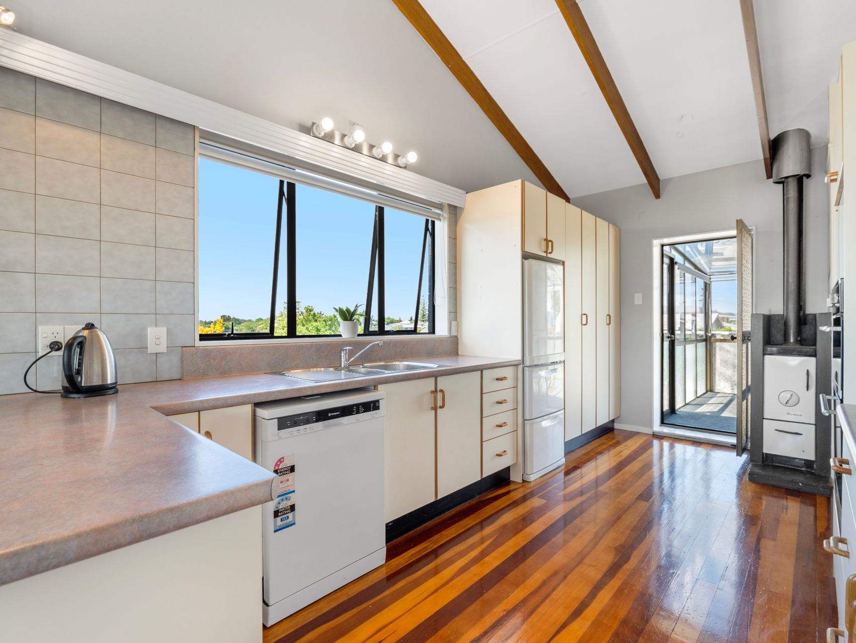 Sitting in an elevated position, the upper level is warm, bright and wonderfully open. The kitchen, living and dining areas soak up all-day sun, framed by wide windows that look out across the neighbourhood. Timber floors add richness and warmth, while the pitched ceilings create an airy, spacious feel. This is everyday living done well - practical, comfortable and easy to enjoy.