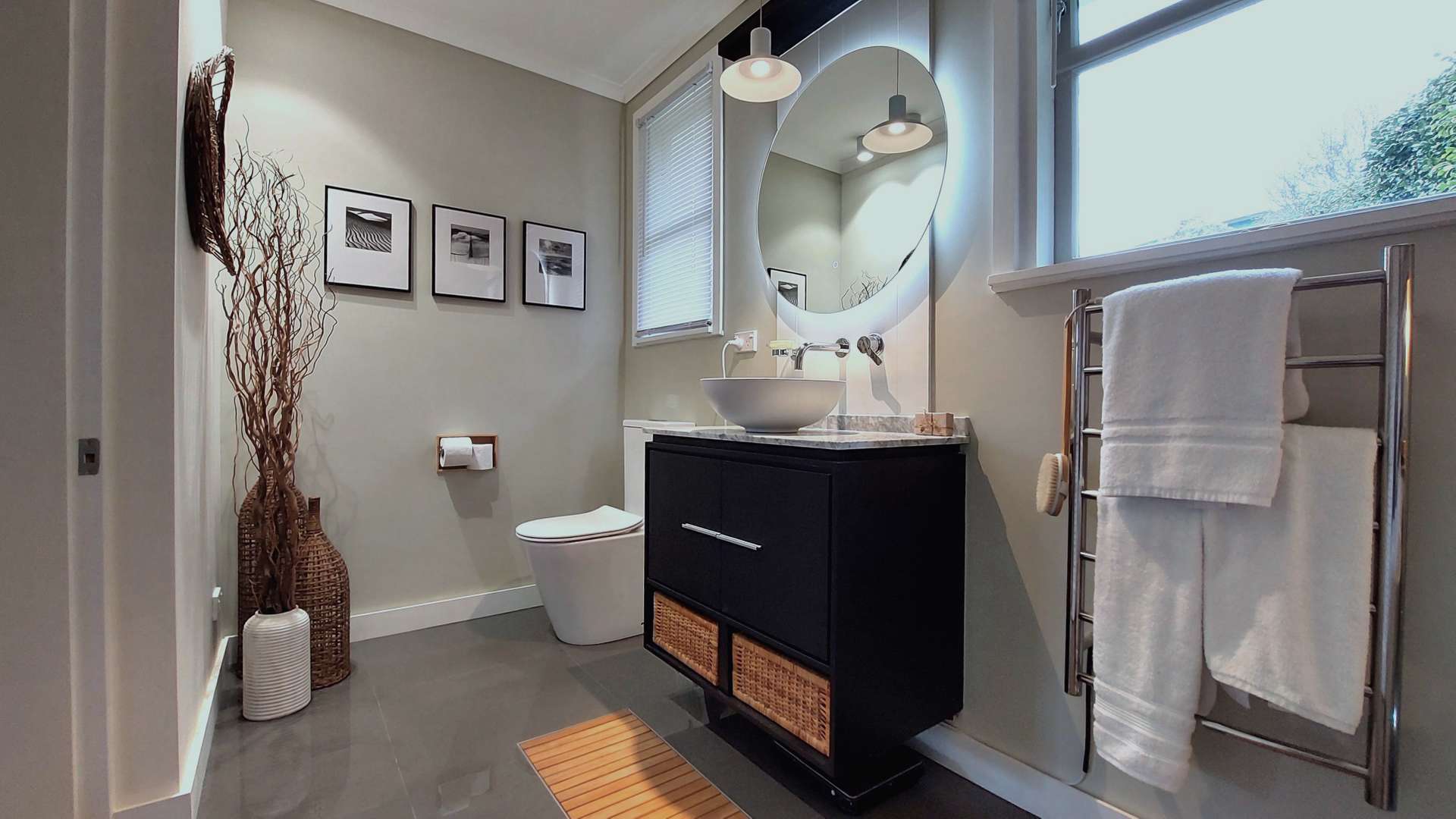 Inside, three well appointed bedrooms and two luxurious new bathrooms offer comfort and style. A premium German Bosch kitchen anchors the living space, complemented by a separate laundry. Climate-control features including three heat pumps, a wood burner, and HRV system.