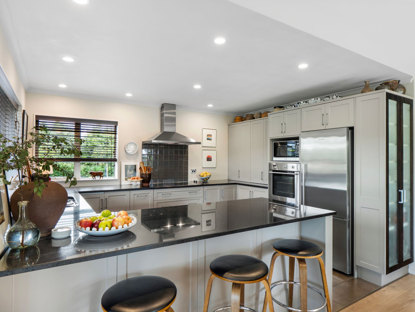Then there’s the heart of the home - a sun-filled kitchen, dining and family living zone. The kitchen is both stylish and hardworking, with sleek cabinetry, black granite benchtops, and a generous island. Recessed lighting keeps everything crisp and functional year-round, while recently installed wood-burner brings warmth and ambiance when the seasons change.