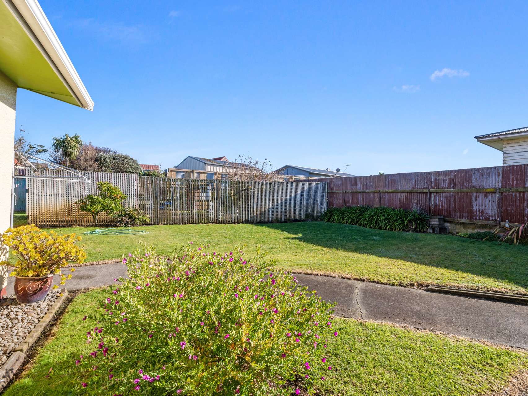 Out front, a covered porch is your go-to spot for morning coffee, while the fully fenced section is ideal for summer BBQs, garden games or simply kicking back under the mature trees. A long driveway leads to a two-car garage, and there’s plenty of room for extra off-street parking. Lavender, citrus, and established greenery round out the picture.