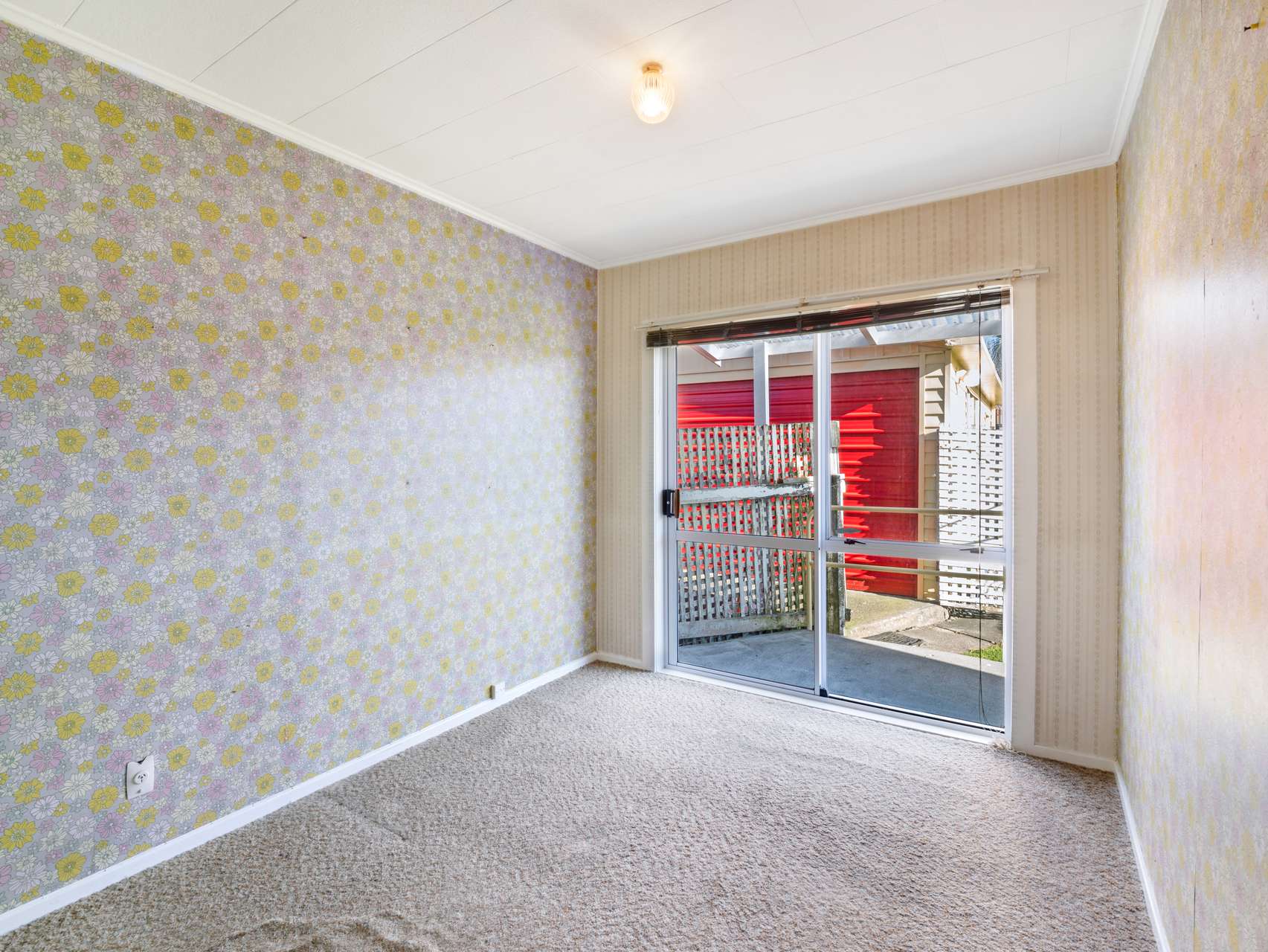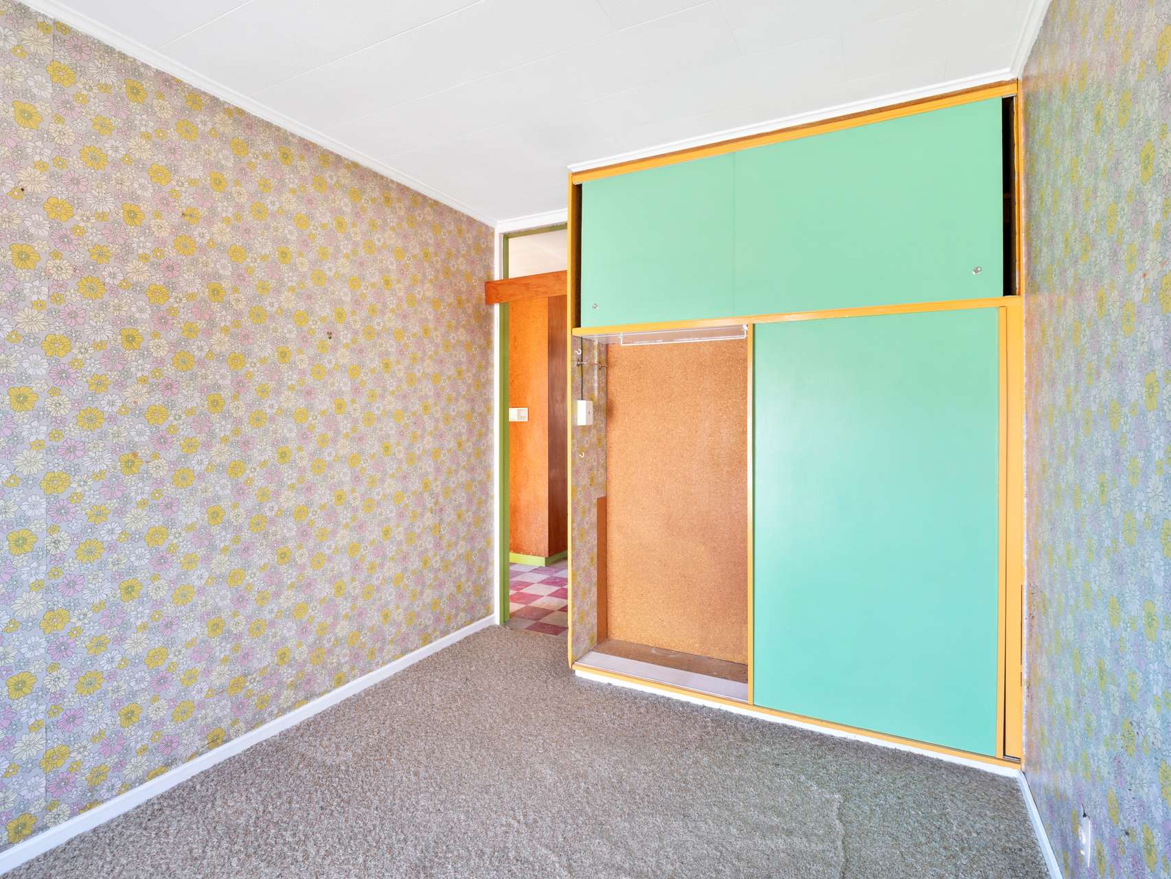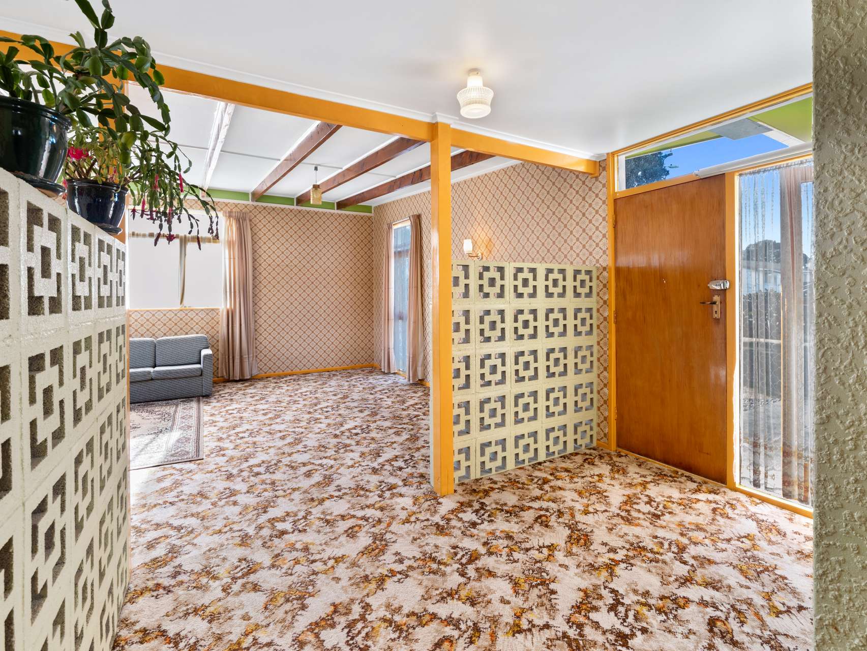 Beyond the cheerful yellow gabled roof and mid-century breeze blocks, you’ll find a home full of character. Inside, exposed timber ceiling beams, patterned wallpaper and matching carpet create a homely feel. The wood-burner keeps the living warm and toasty in cooler months, while a half-wall between lounge and kitchen keeps the layout open yet defined, ideal for casual entertaining.