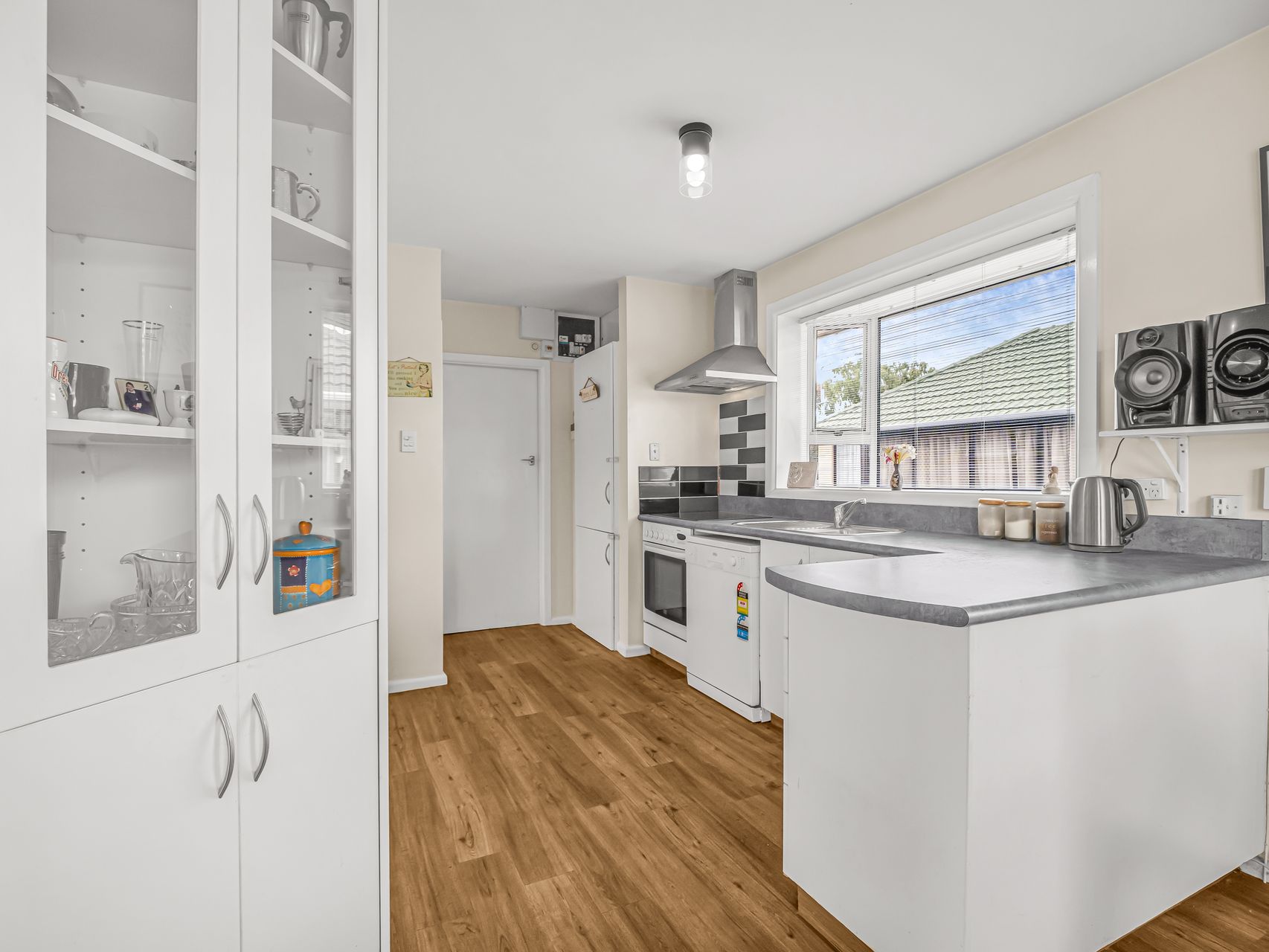 The inviting living area features polished timber floors, large double glazed windows and the comfort of both a heat pump and wood burner to keep you cosy year-round. This space flows effortlessly into the dining area and adjacent kitchen, creating a practical layout ideal for everyday living. The kitchen is clean and functional with white cabinetry, a light marble-look bench top.