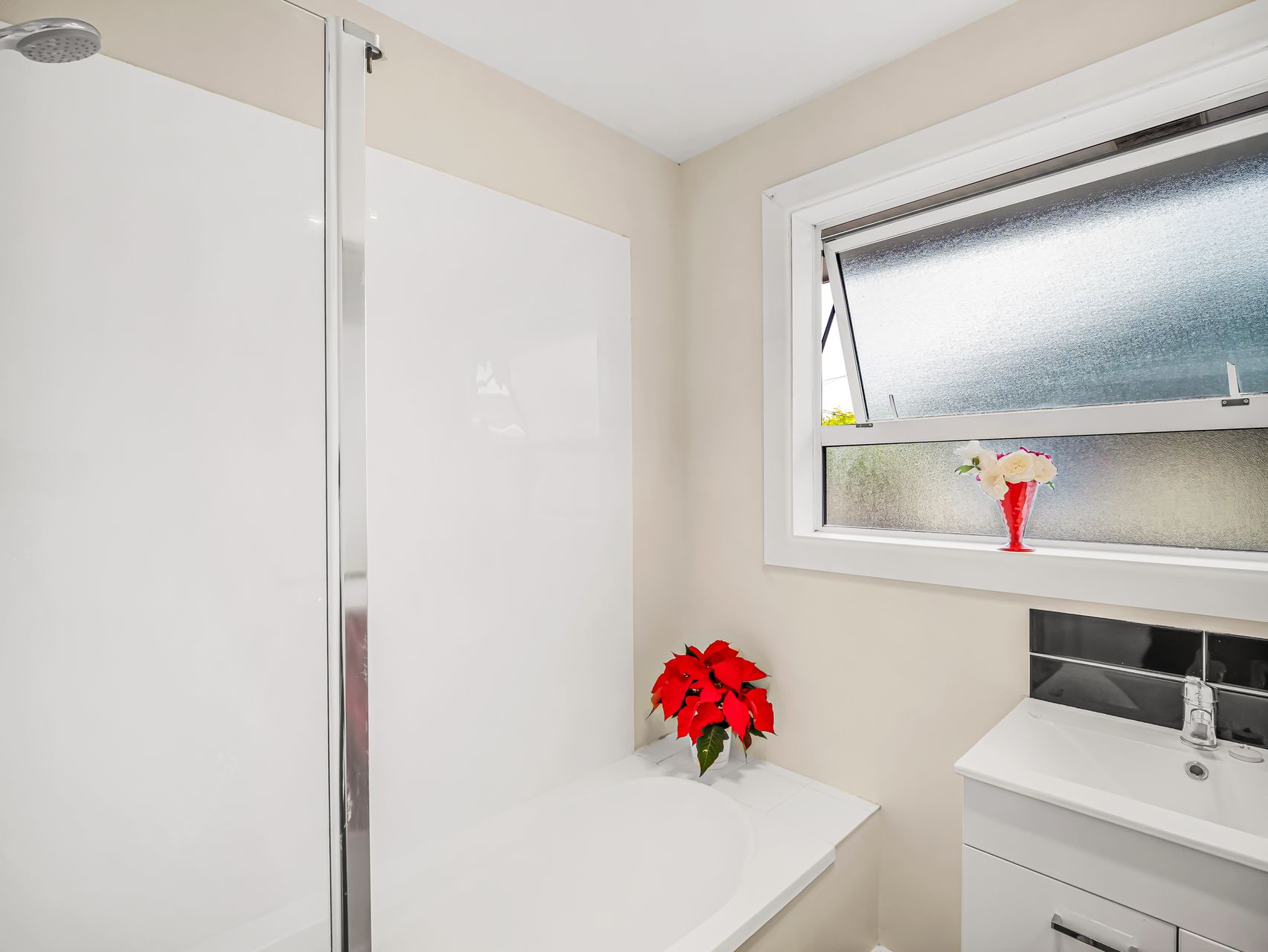 Down the hall, three well-sized bedrooms provide peaceful retreats, each with windows, blinds and curtains to suit. The family bathroom includes both a shower and a bath, complemented by a separate WC and a dedicated laundry for added convenience.