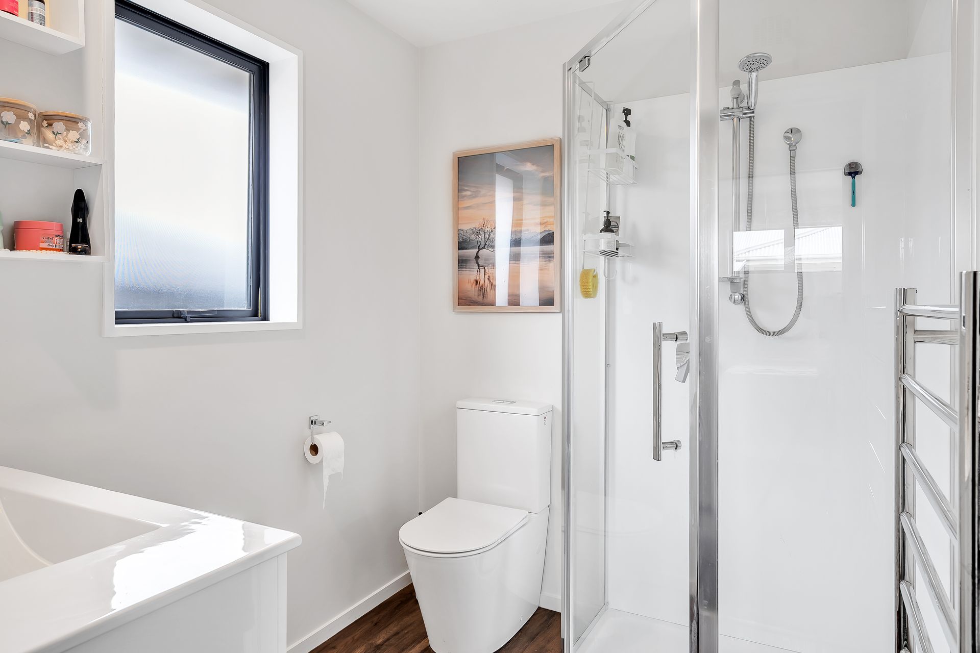 All three bedrooms are positioned down the hallway. The primary bedroom includes a walk-in wardrobe and its own ensuite. The remaining two bedrooms are well sized and share the main bathroom, which includes a full bathtub and a clean, modern finish suited to everyday use.