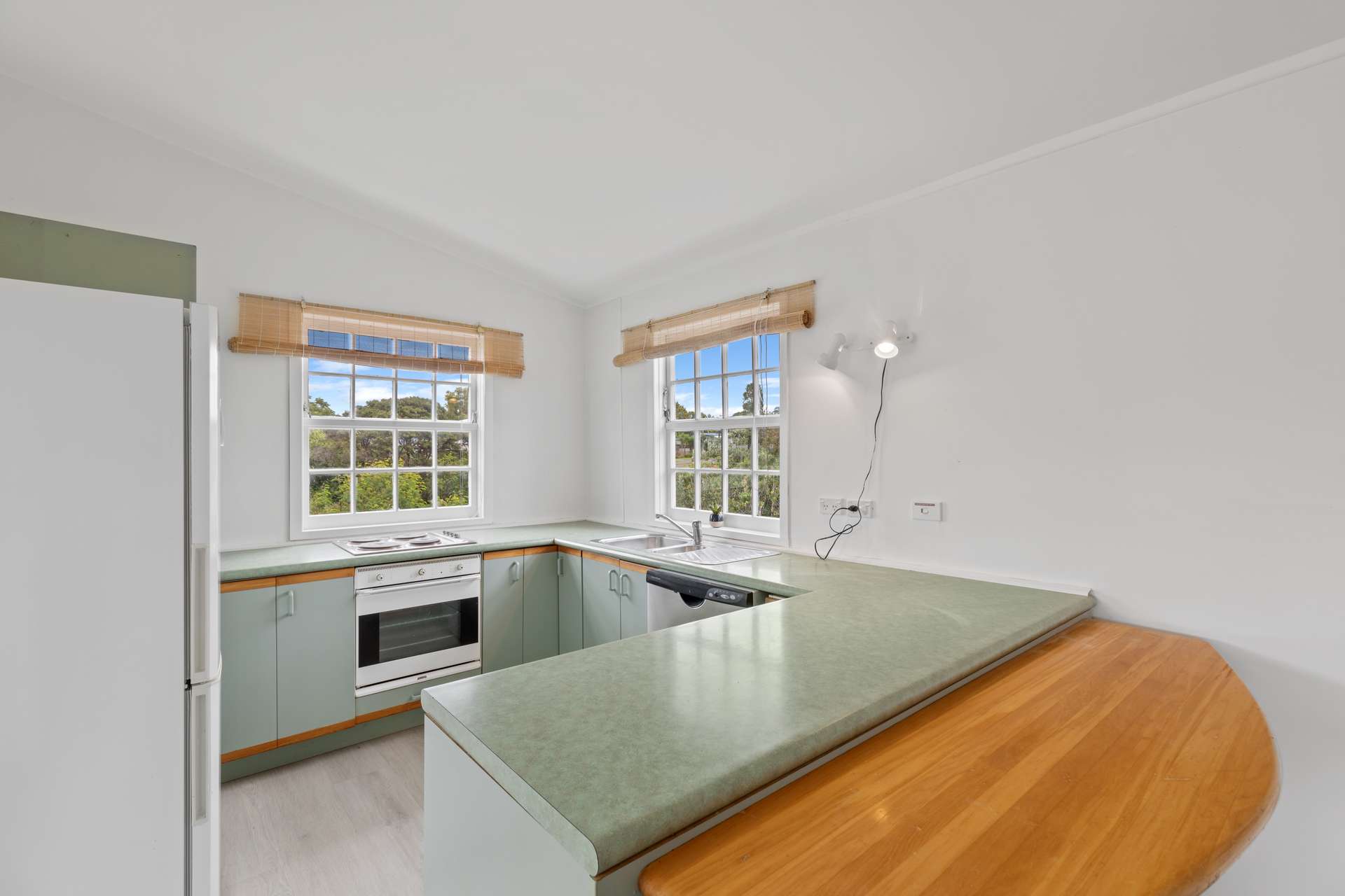 The kitchen offers excellent storage, a large benchtop and handy polished wood breakfast bar, and electric hob and oven. The cute paned windows add a real sense of character from the original building!