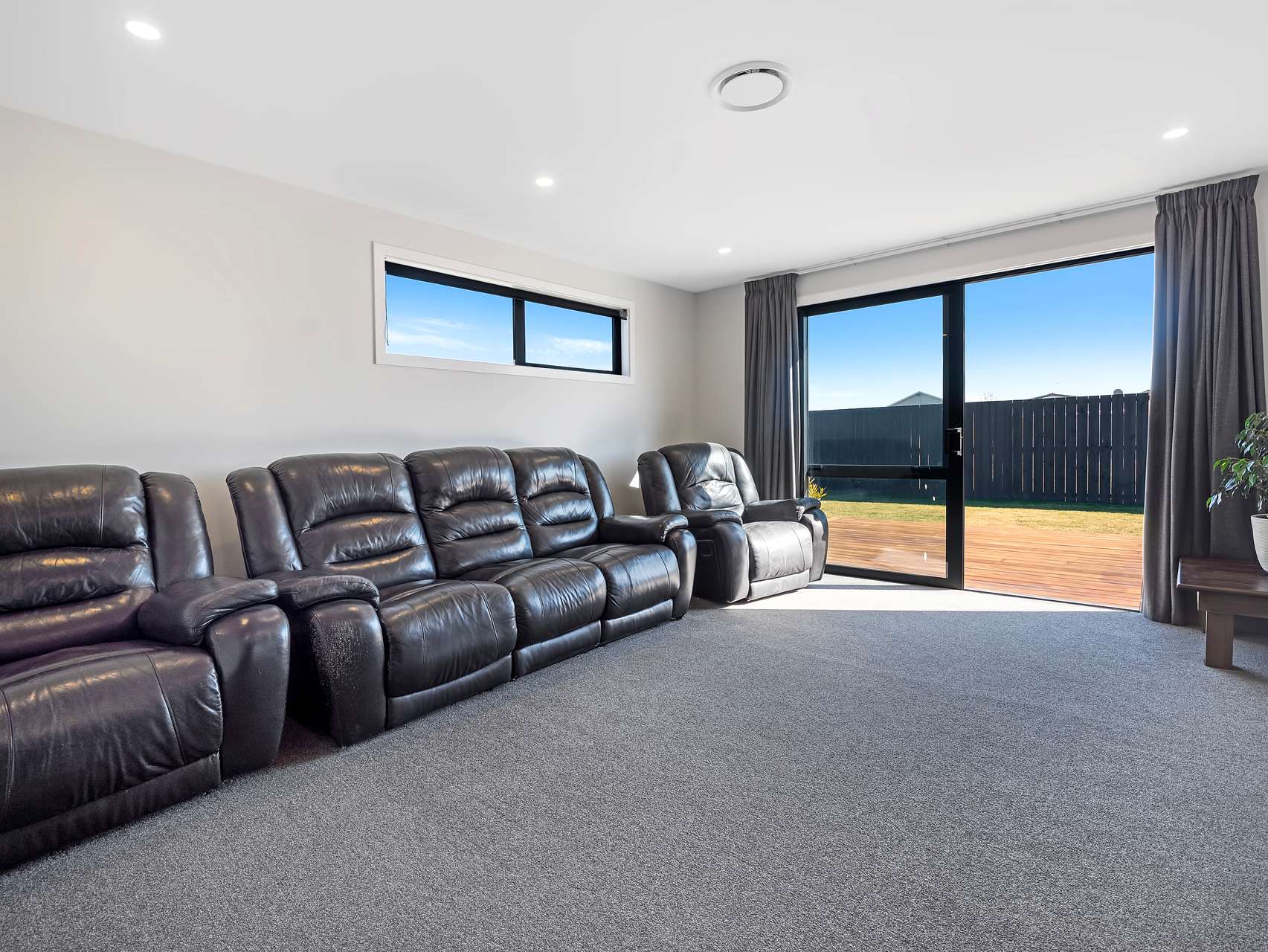 The open-plan living area is bright and generous, framed by wide sliders that draw you straight outdoors. The kitchen doesn’t just perform, it shows off with white stone, marble detailing, pendant lights and a sizeable island that works for families. A separate media room sharpens the appeal, giving you the option of a second lounge, kids’ den or retreat that can close off when needed.