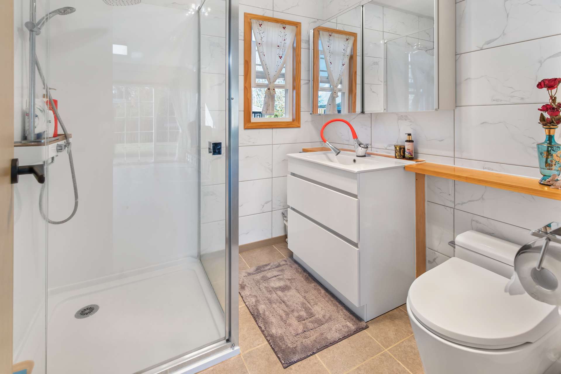 The bathroom has beautiful timber features too keeping it consistent with the rest of the house. It has a corner shower, face height storage in the mirrored cabinet, vanity with storage and a toilet.