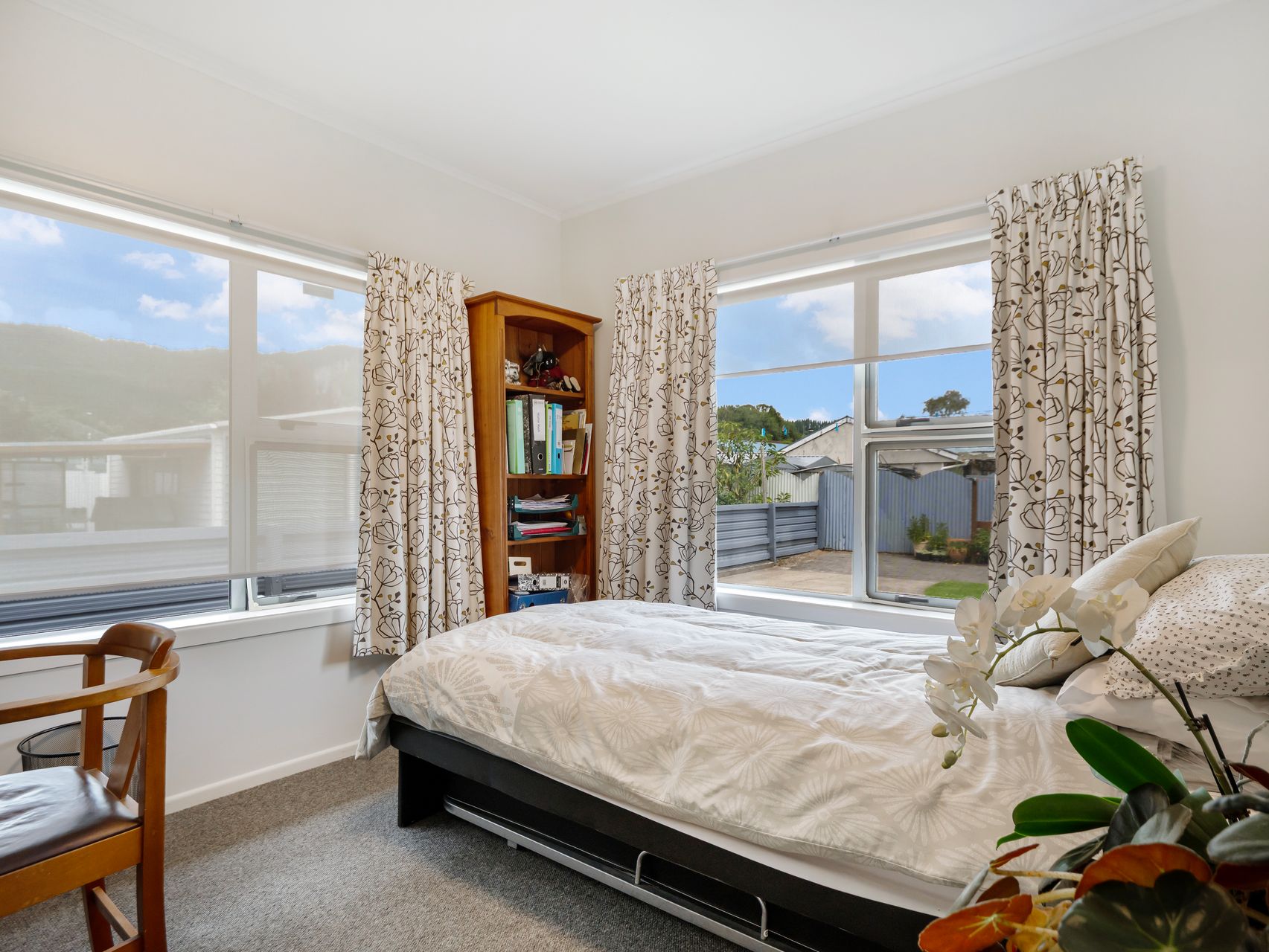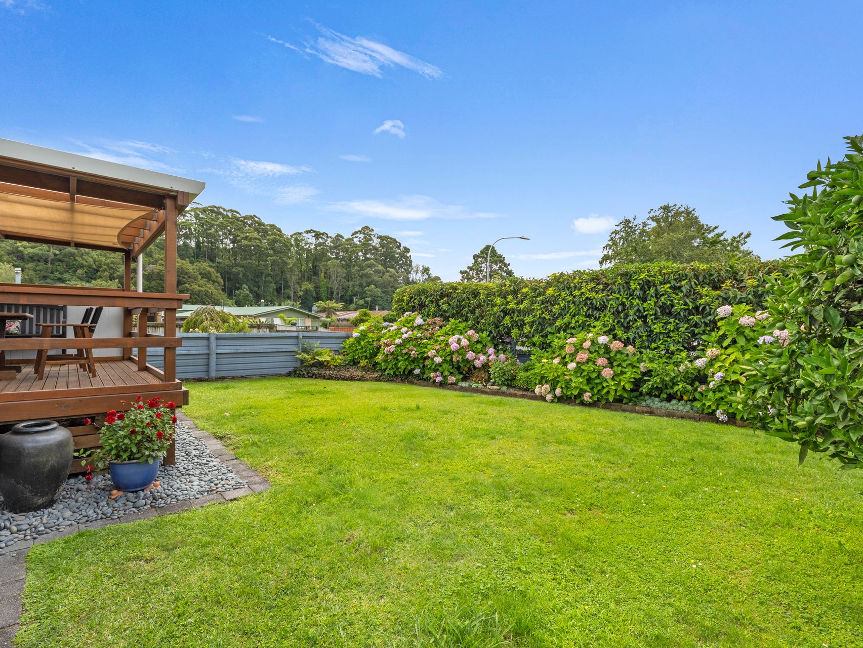 A generous timber deck with magnificent mountain views plus shade sail creates a sheltered setting for outdoor dining and relaxed afternoons. The fully fenced section is neatly maintained with green lawns, established shrubs, raised planters and flowering borders, offering space to potter, play or simply unwind. Practical features include a concrete driveway, garage, carport, a separate wooden garden shed and ample off-street parking.
