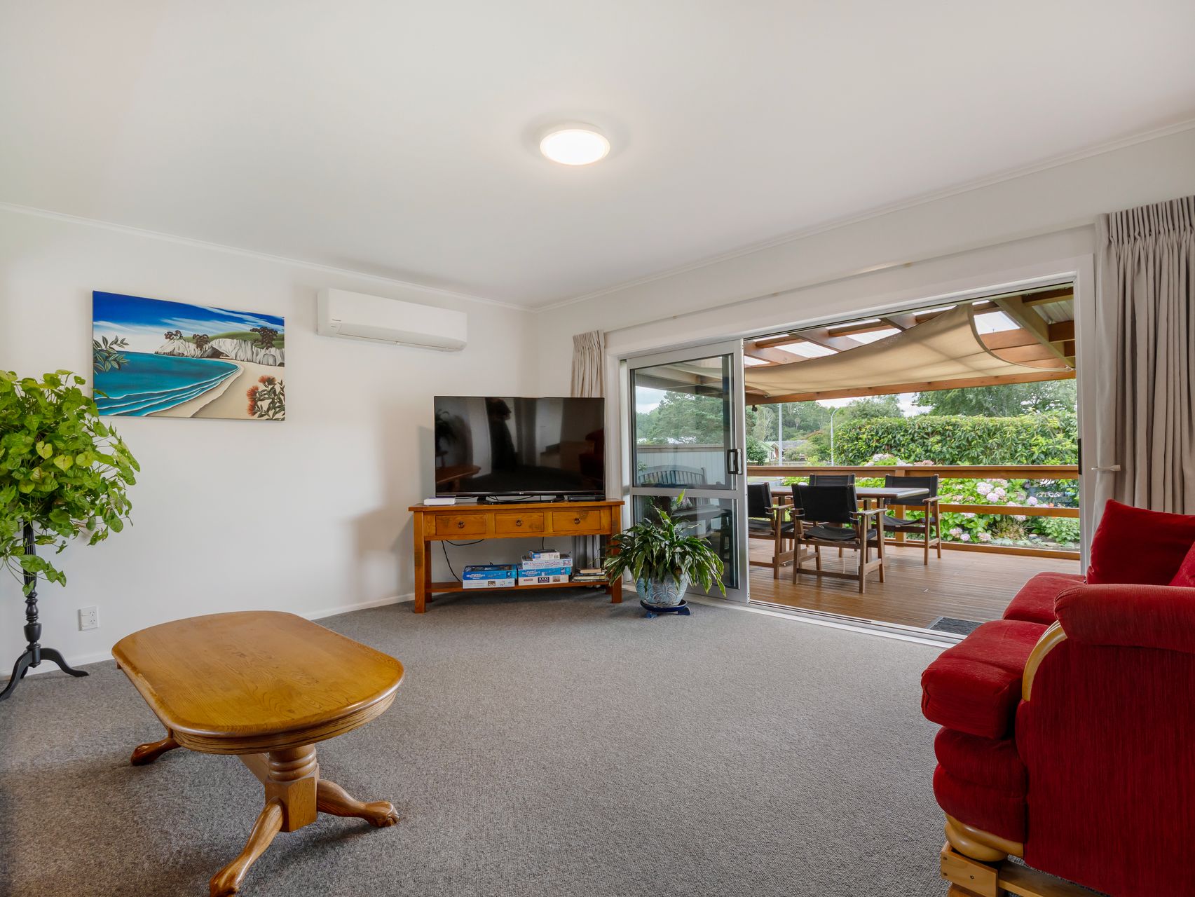 Step inside to an open-plan living, kitchen and dining area where everyday life feels relaxed and practical. The living zone is comfortably carpeted, warmed by a heat pump, and positioned to flow directly out to the deck, creating an easy indoor-outdoor connection that works just as well for quiet evenings as it does for entertaining.