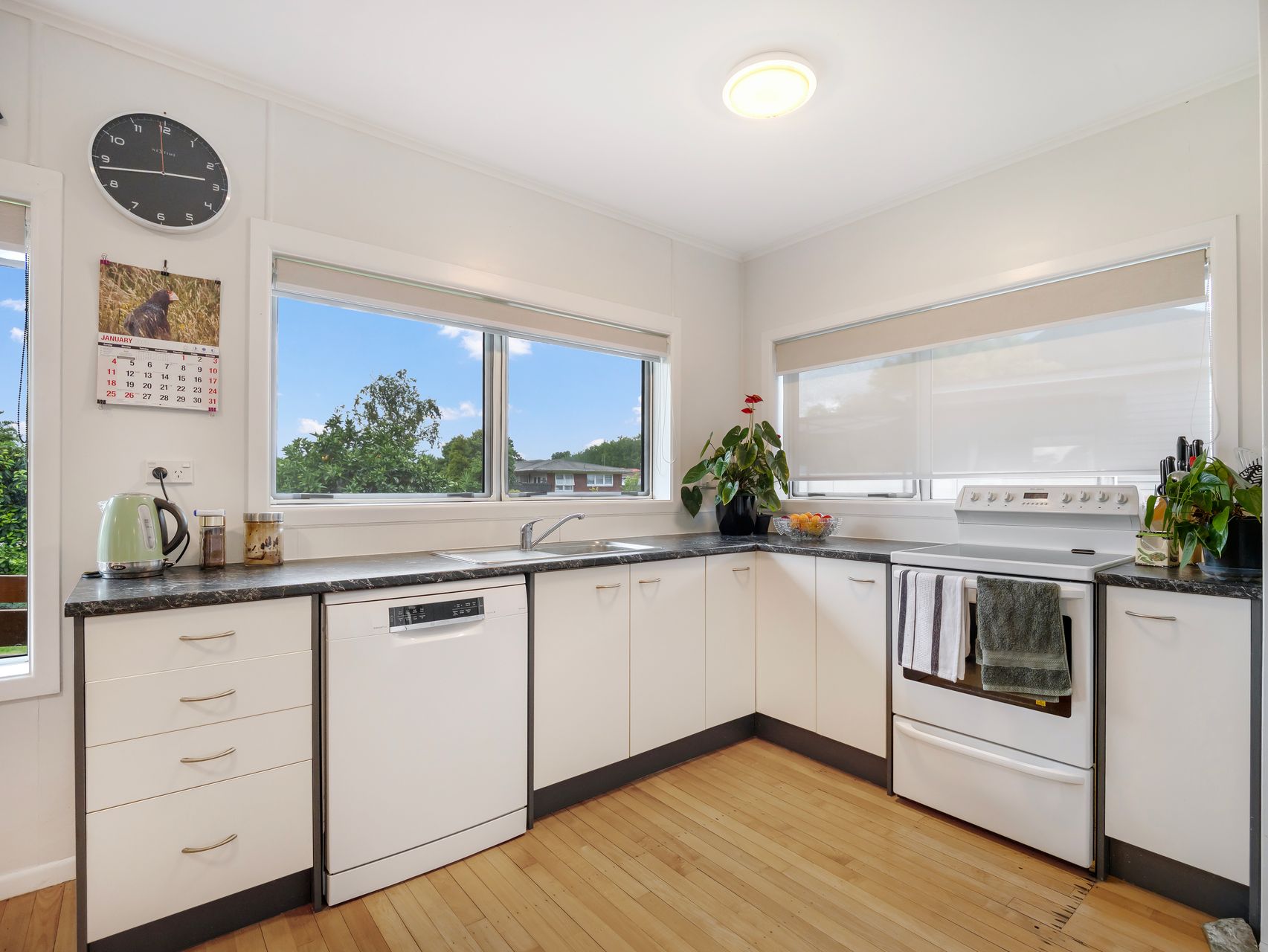 The kitchen is neatly arranged in an L-shaped layout, finished with crisp white cabinetry, dark benchtops and light timber-look flooring underfoot. A large window above the sink looks out over greenery, adding both light and outlook, while the dining space sits conveniently alongside.