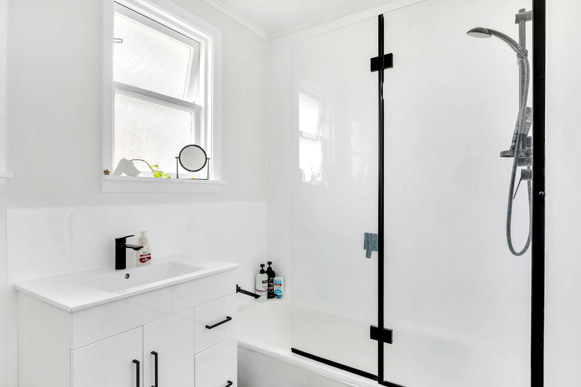 The bathroom has been tastefully updated with a shower over bath, sleek black tap ware, and a crisp modern finish. There’s also space for installation of a new second shower in the laundry(currently not plumbed in)