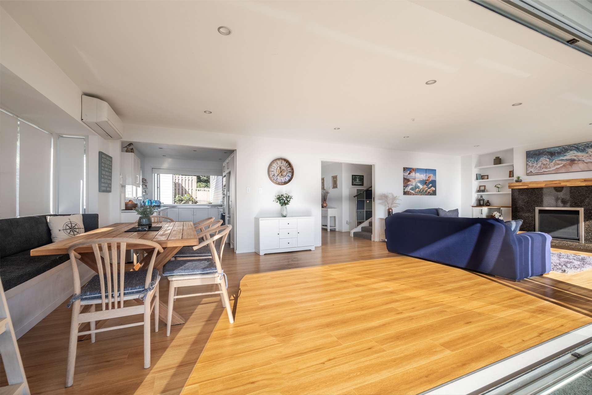 Spanning approximately 300sqm, the home is designed for effortless indoor-outdoor living. A sun-filled open-plan kitchen, dining, & lounge area forms the heart of the home, with oversized accordion doors that open to an elevated patio with breathtaking sea views. The designer kitchen includes café-style windows that connect directly to an entertainer’s deck, while a fireplace and heat pumps ensure comfort all year round.