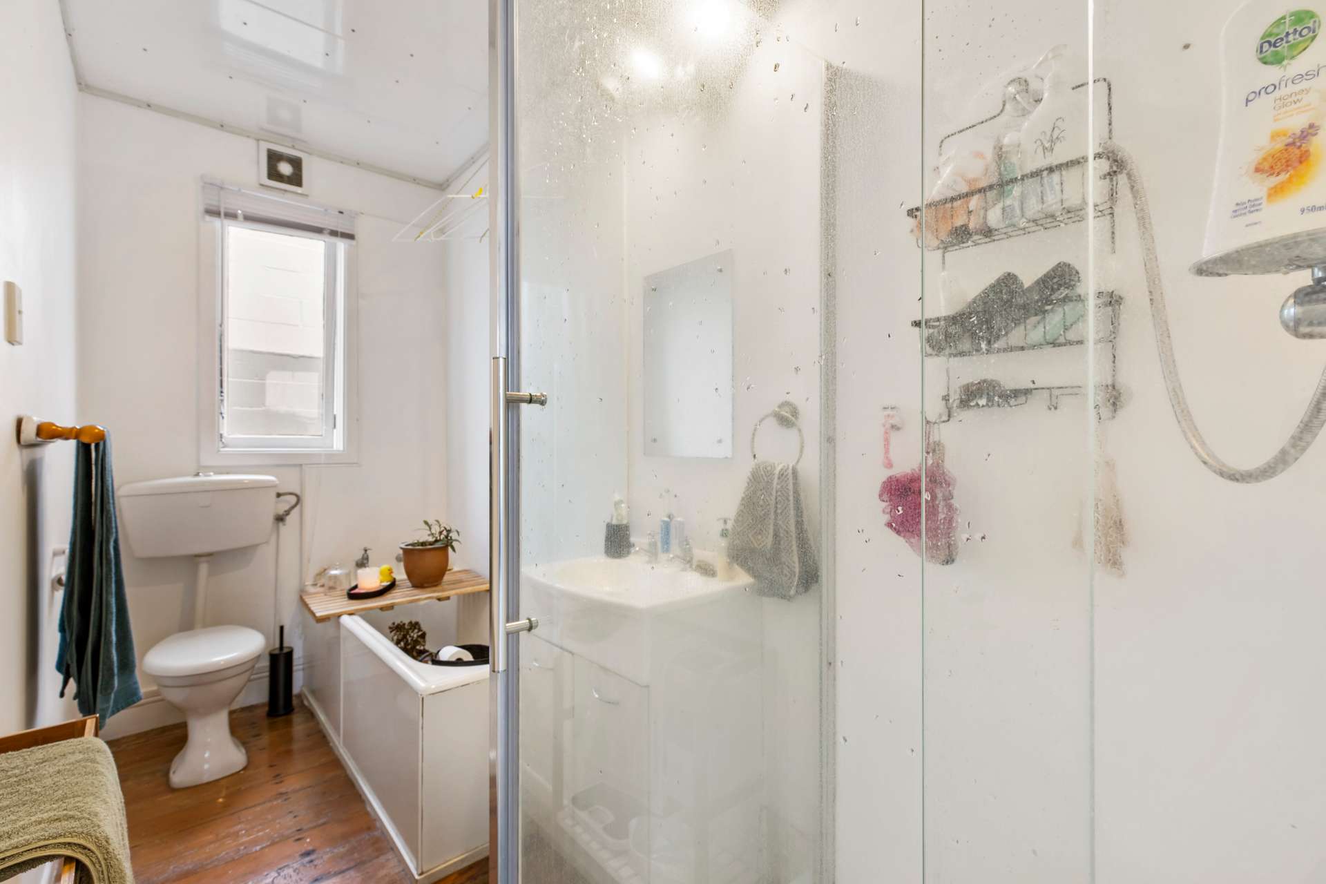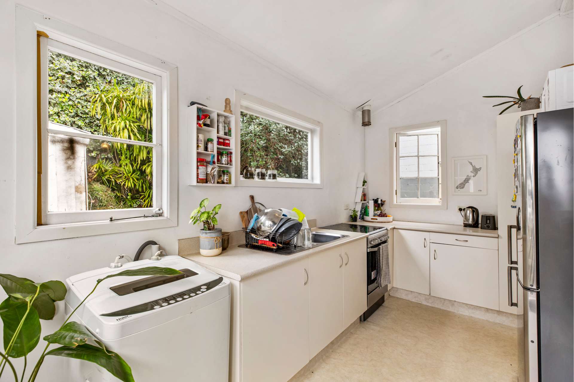 The kitchen is neat and tidy, and has a lush green view out through the windows. The laundry is also accommodated within the kitchen, and the classic bathroom has both a shower, and bath for both options.