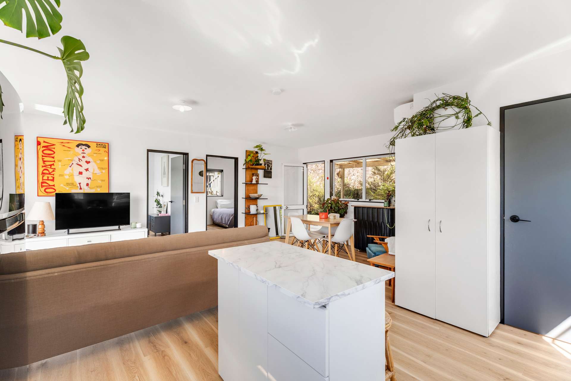 Inside, wood floors and large picture windows fill the home with warmth and light. The open plan layout brings together a cozy lounge, dining area and a well equipped kitchen, where vintage charm meets modern function. A crisp white island with bar stools invites easy conversation, while the mix of stainless steel and warm wood textures gives the space a welcoming, lived in feel.