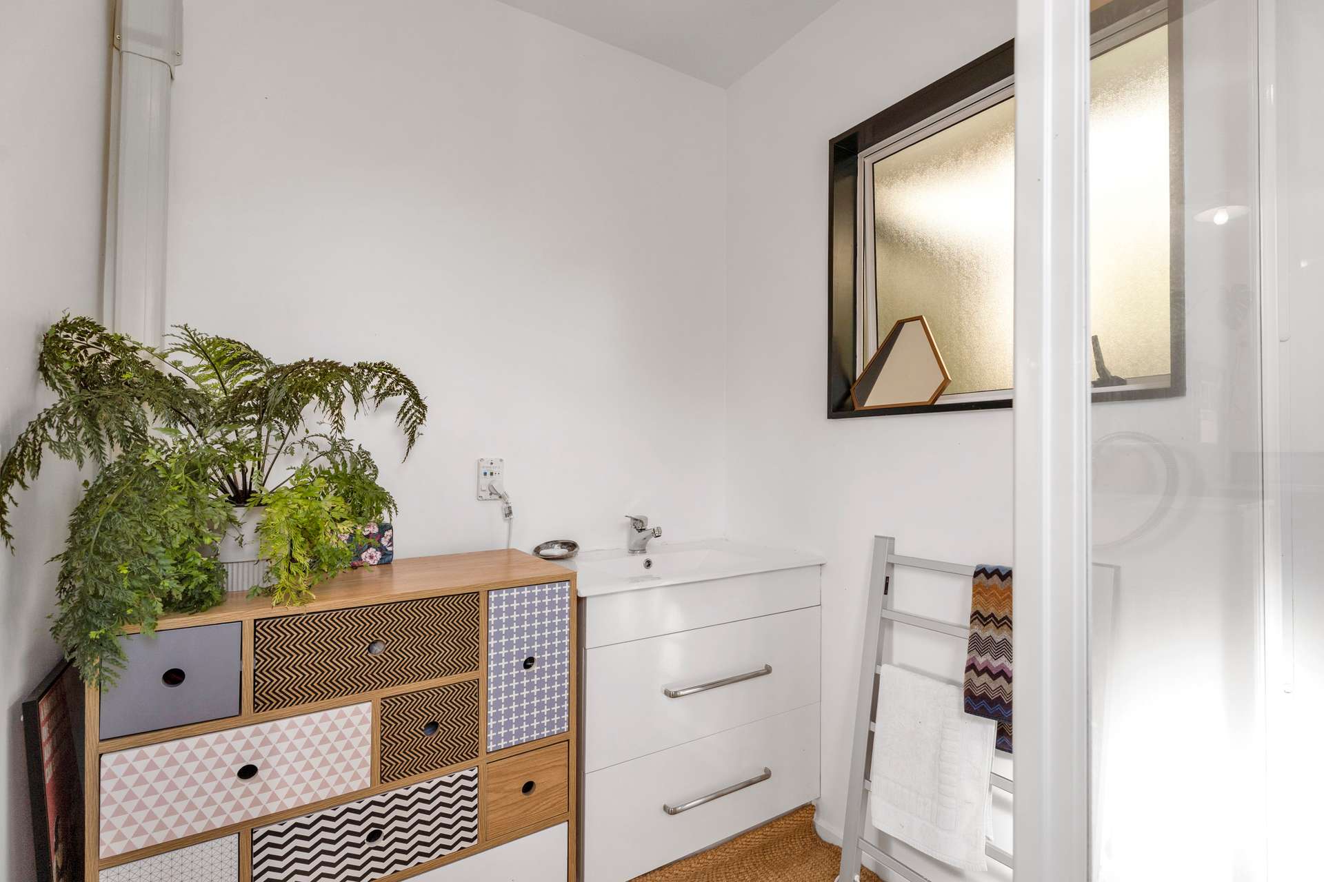 The master bedroom is restful and bright, framed by generous windows that open to sea breezes, while the second bedroom doubles beautifully as a guest room or creative workspace. The bathroom continues the home’s fresh coastal palette with white finishes and natural light.