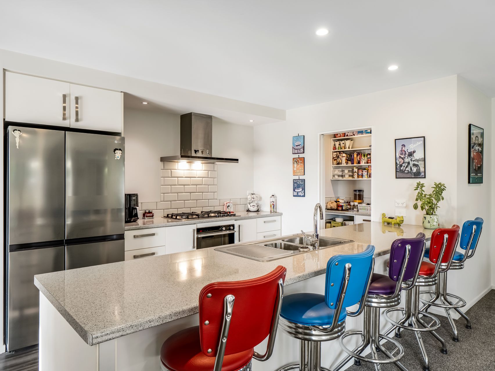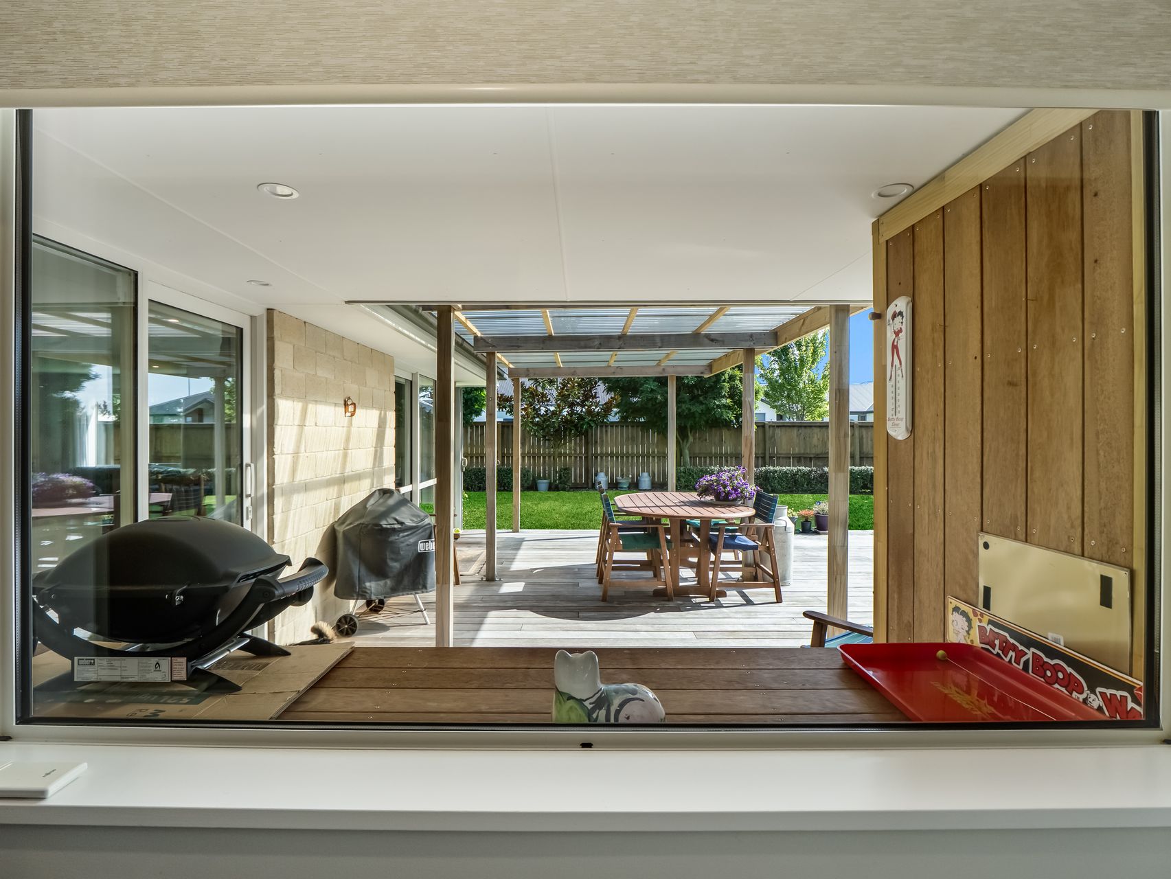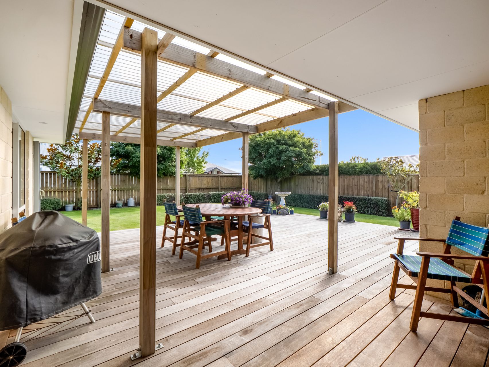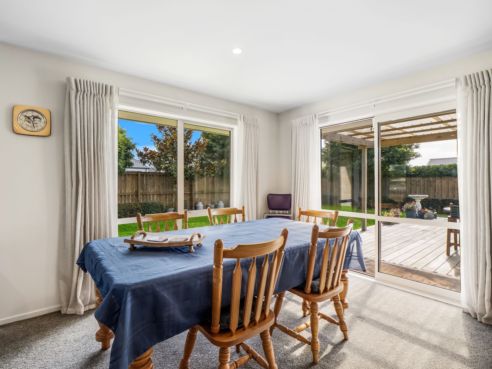 The open-plan kitchen, dining and living area captures excellent natural light and opens to a covered deck with pergola for year-round use. The kitchen is well-appointed with generous bench space, breakfast bar, gas hob, modern appliances, walk-in pantry and a tiled splashback. Two heat pumps, full double glazing, gas hot water and gas cooking ensure comfort and efficiency throughout the home.
