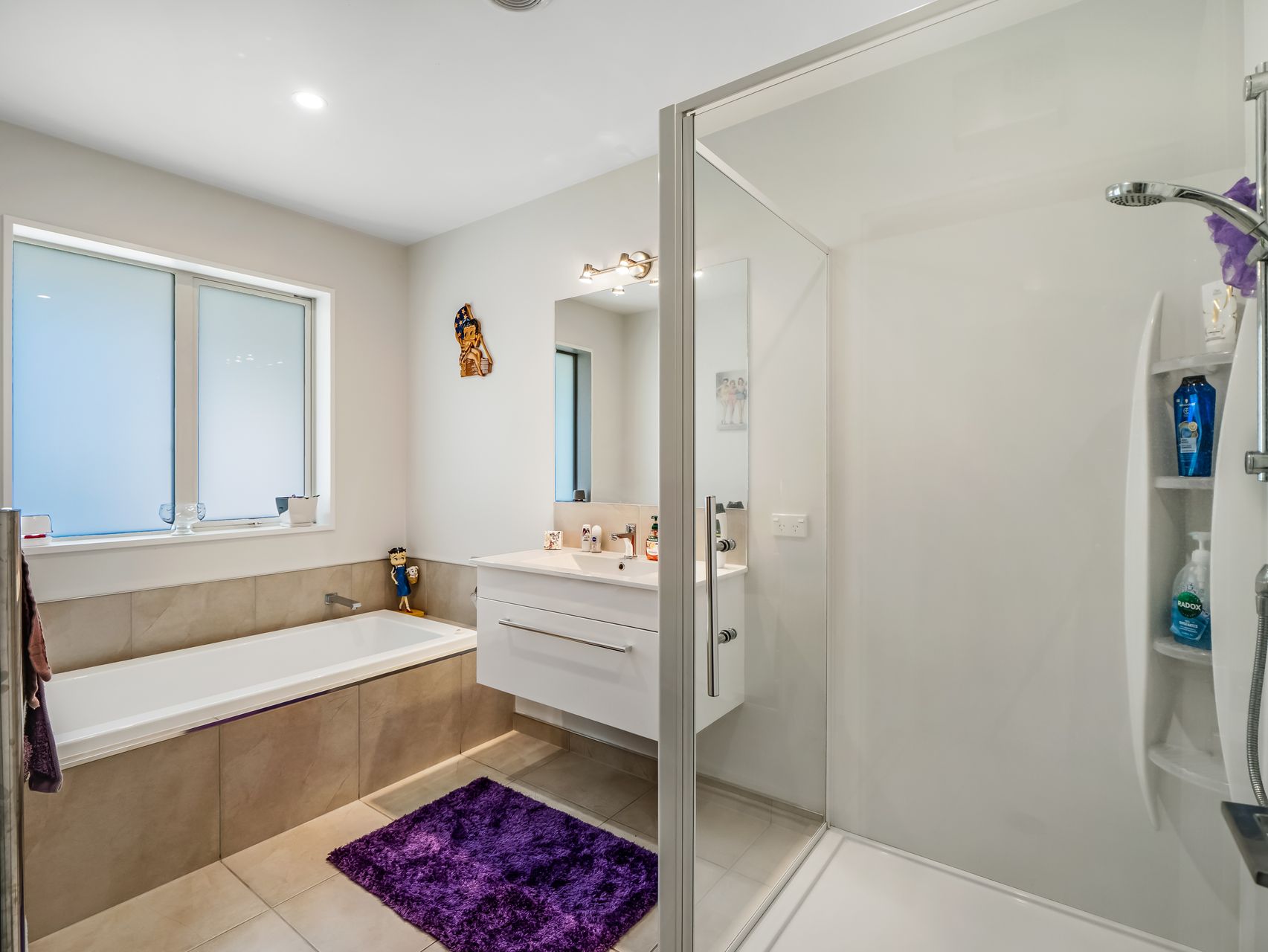 The master bedroom includes a walk-in wardrobe and ensuite, while two additional bedrooms are serviced by a family bathroom with bath and separate shower, plus a separate toilet. The separate laundry is conveniently located off the internal access double garage, enhancing the practical layout.