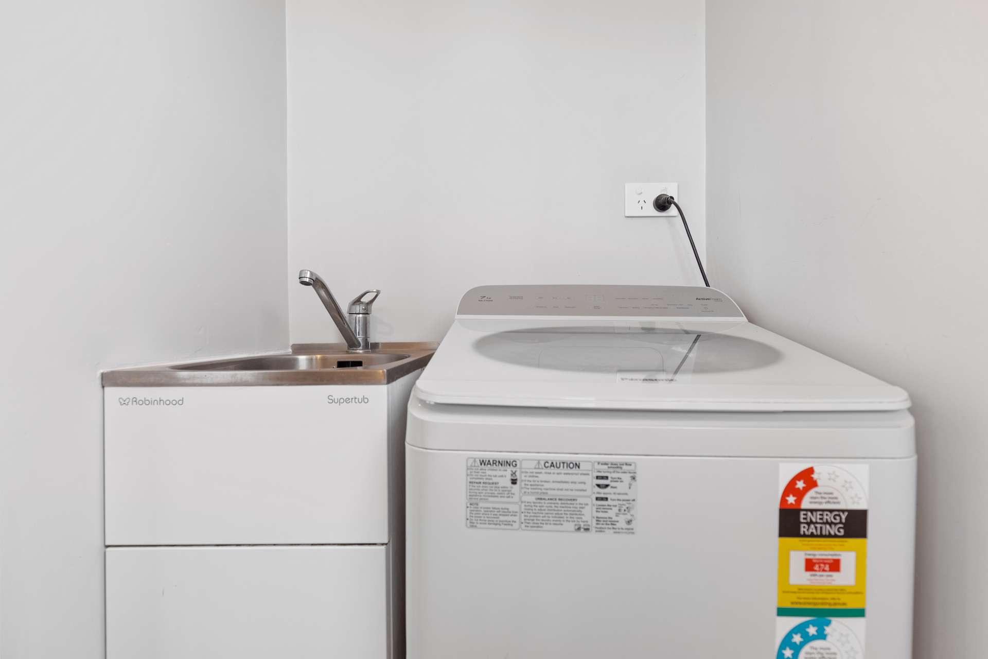 The family bathroom has a shower over the bath, a vanity and toilet. There’s a separate laundry area and plenty of storage space. There are two heat pumps for year round comfort.