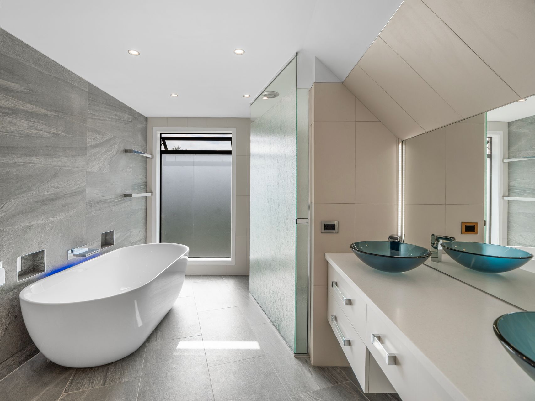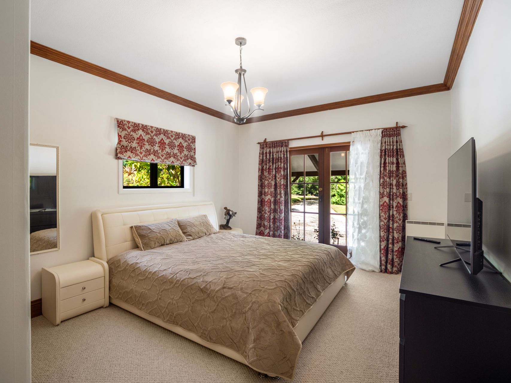 French doors spill to expansive decking framed by a colourful garden, manicured lawn, sunny BBQ area and the surrounding forested hillside, creating effortless flow for entertaining at scale.