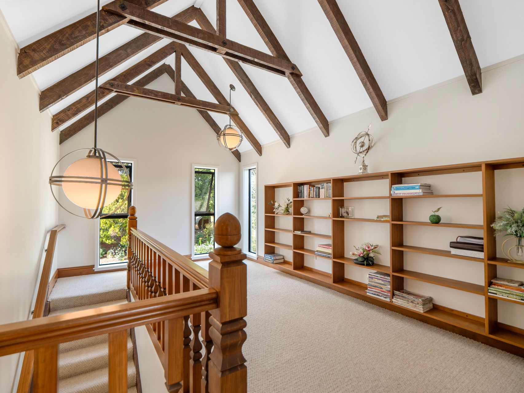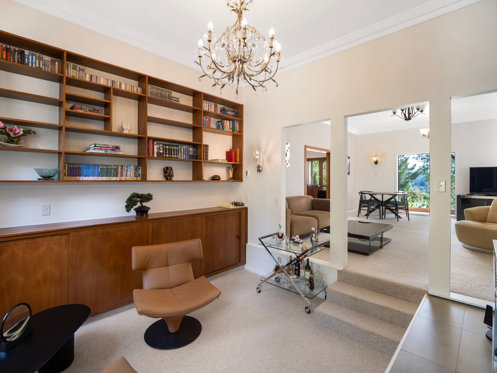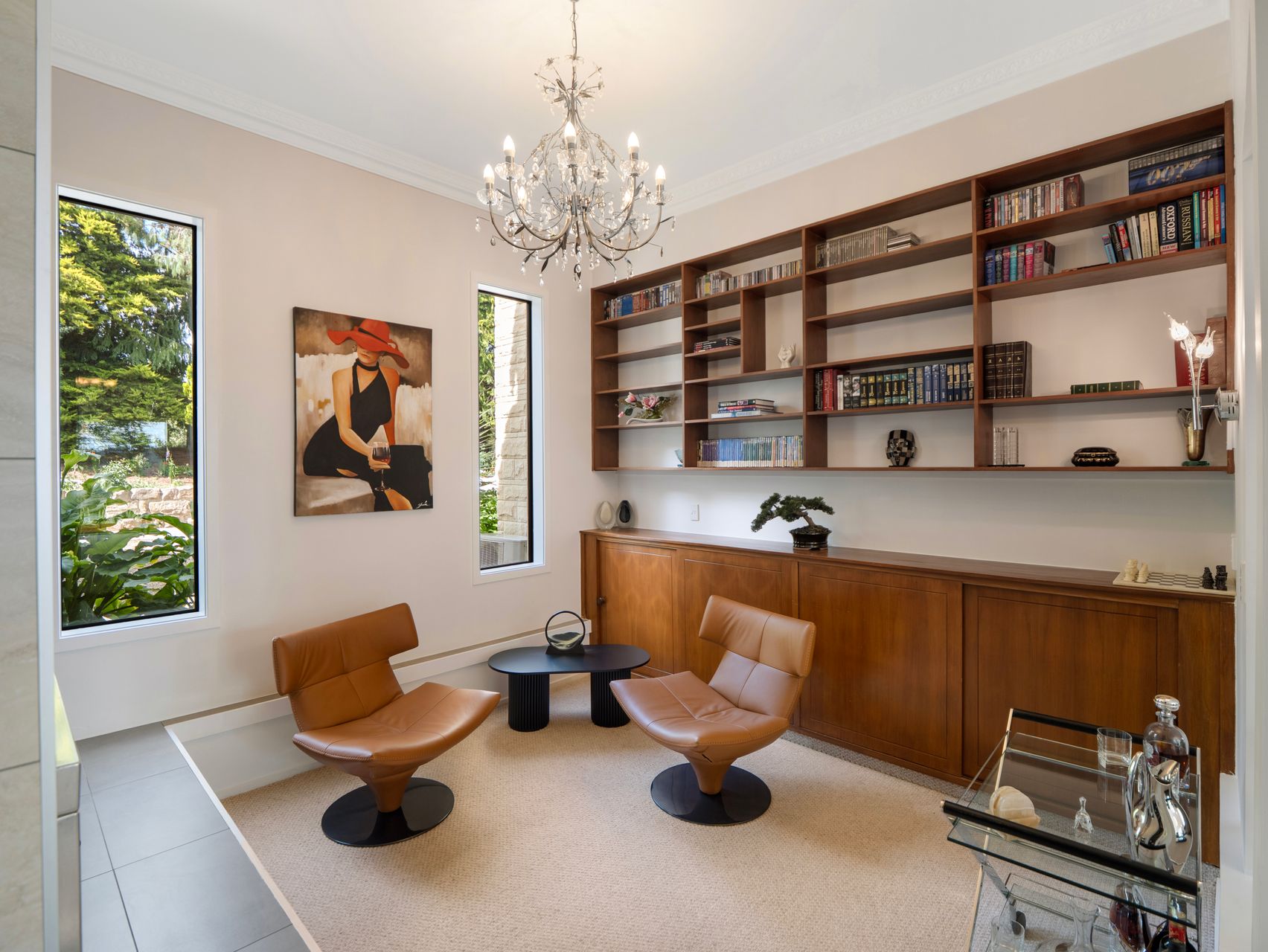 A separate library with bespoke shelving and a tranquil nook add yet more depth to the home’s living and working possibilities.