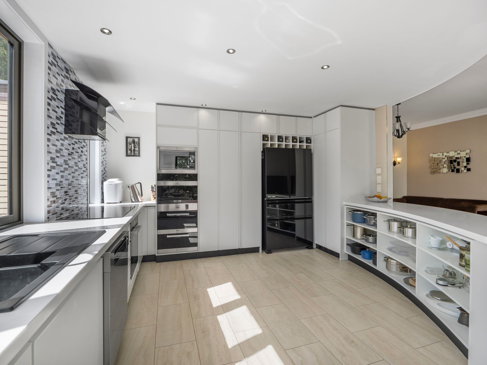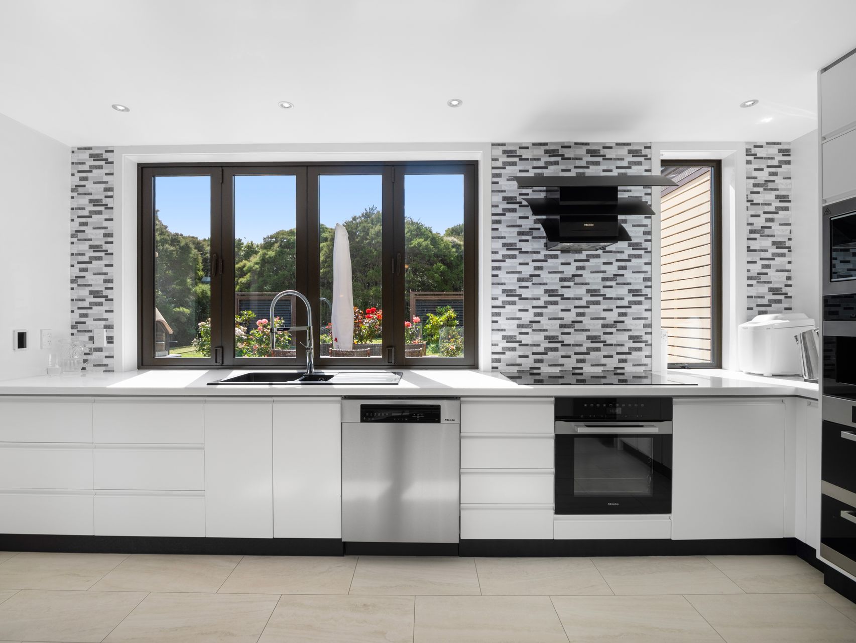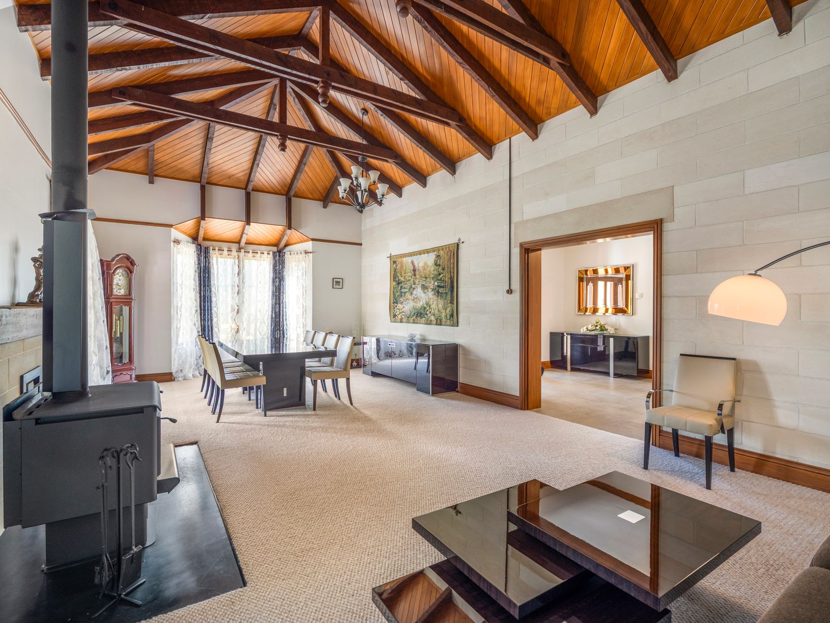 Inside, generous proportions and timeless detailing unfold through multiple living zones, from the formal lounge and dining room with its soaring timber ceiling and wood-burner, to the sophisticated open-plan hub with a “stand-out” kitchen, dining and second living.