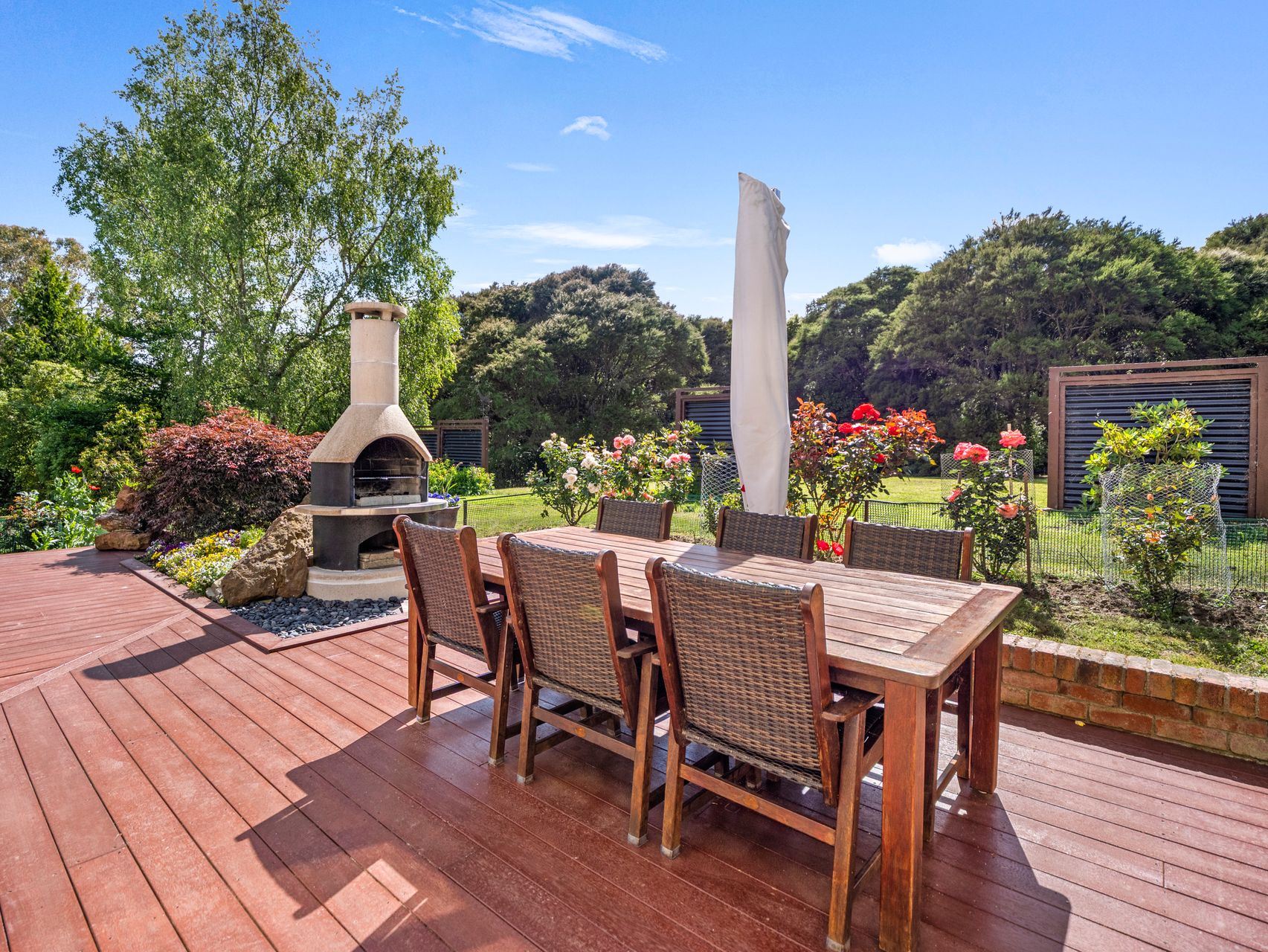 The land is equally purposeful: a substantial greenhouse, raised vegetable beds, netted orchard plantings and a utility shed with implement storage support genuine self-sufficiency, while garaging for five cars and ample parking ensure practicality.