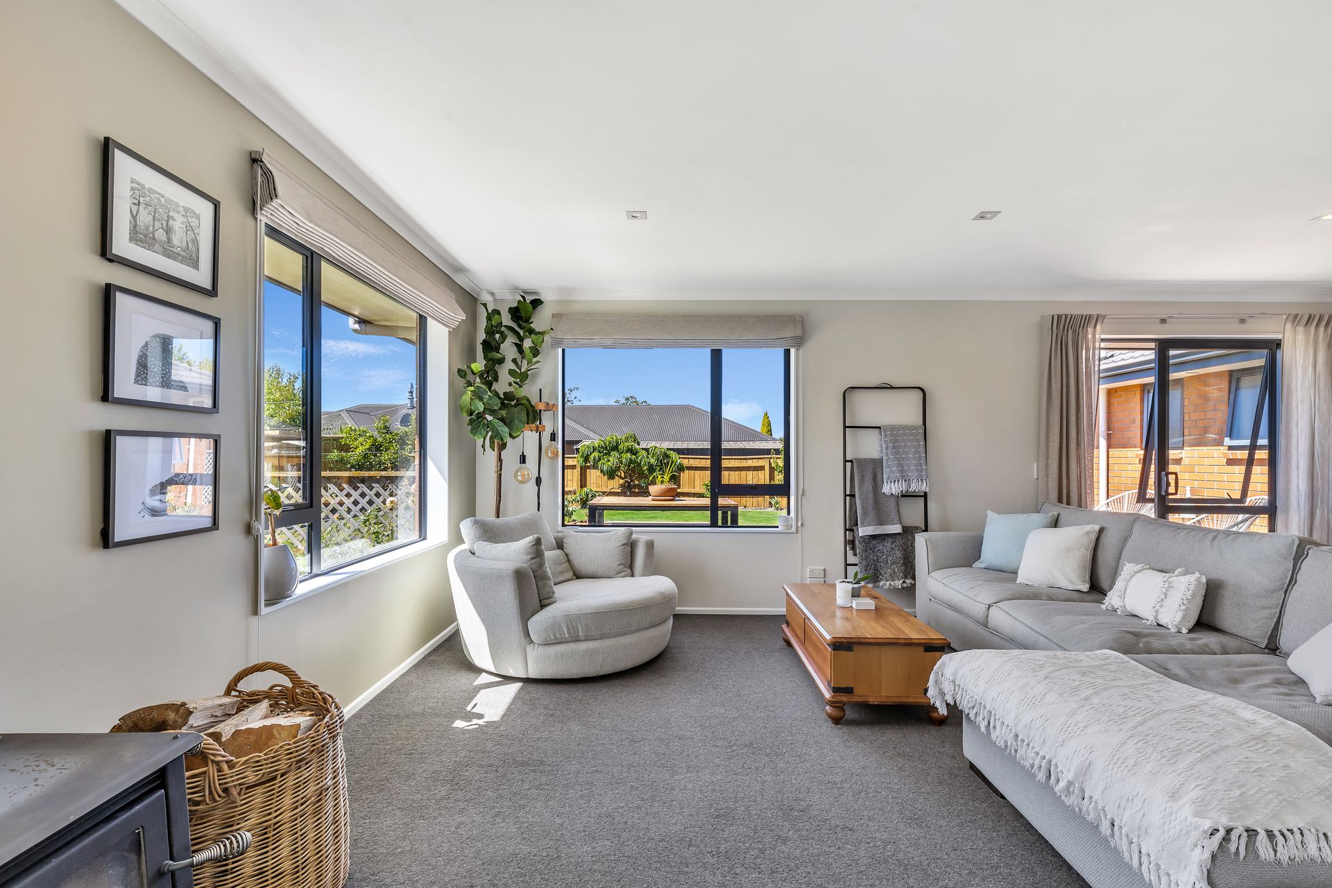 Step through the front door and you’re welcomed into a generous open-plan living space. Large windows draw in natural light throughout the day, while the wood burner keeps things cosy in winter. For warmer months, the heat pump has cooling covered too. Living, dining and kitchen sit together in a way that works whether it’s quick weeknight meals, weekend brunches or friends dropping by unexpectedly.