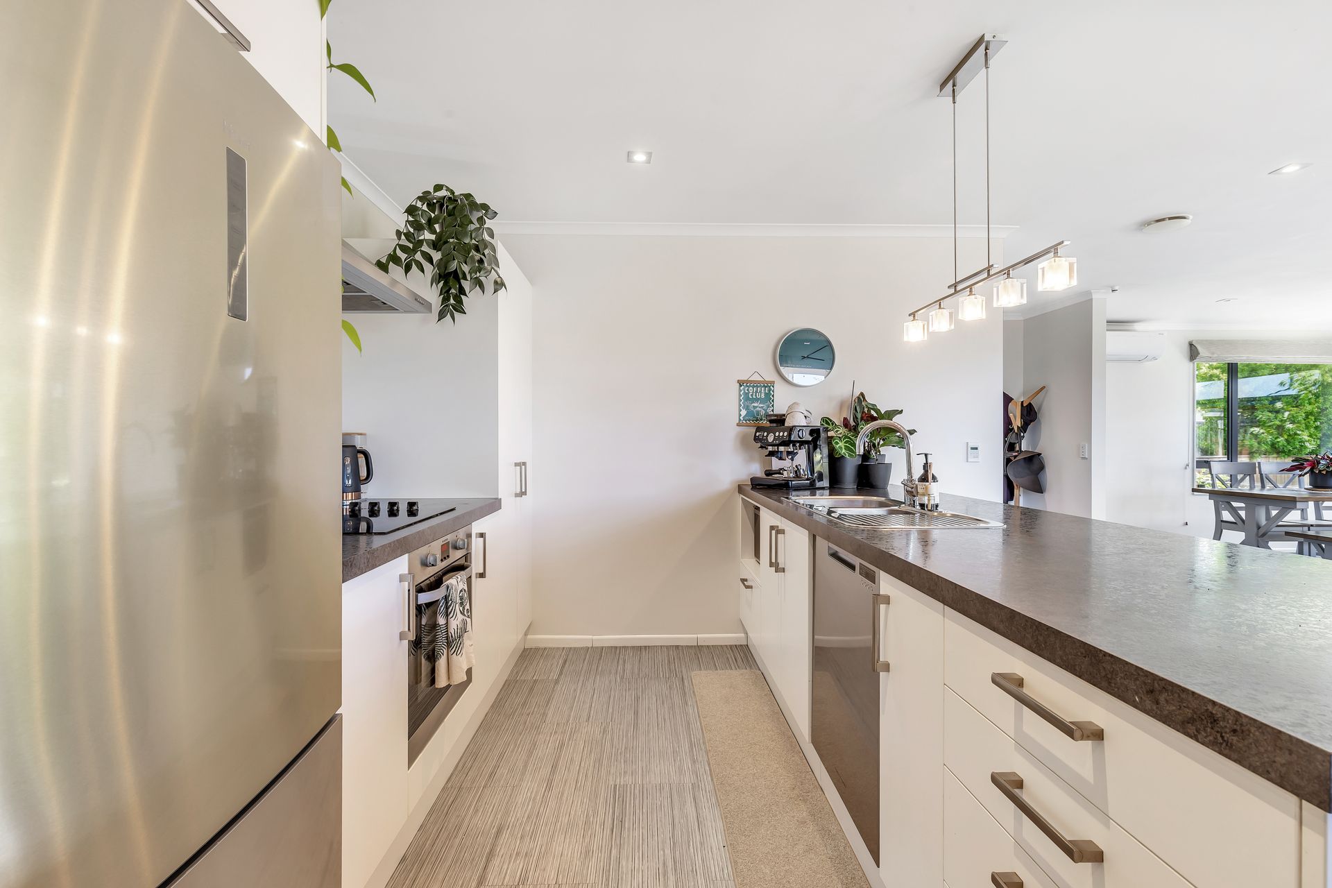 The kitchen is modern and practical, featuring a long breakfast bar for casual meals, plenty of bench space and storage, and a layout that keeps everything within reach.