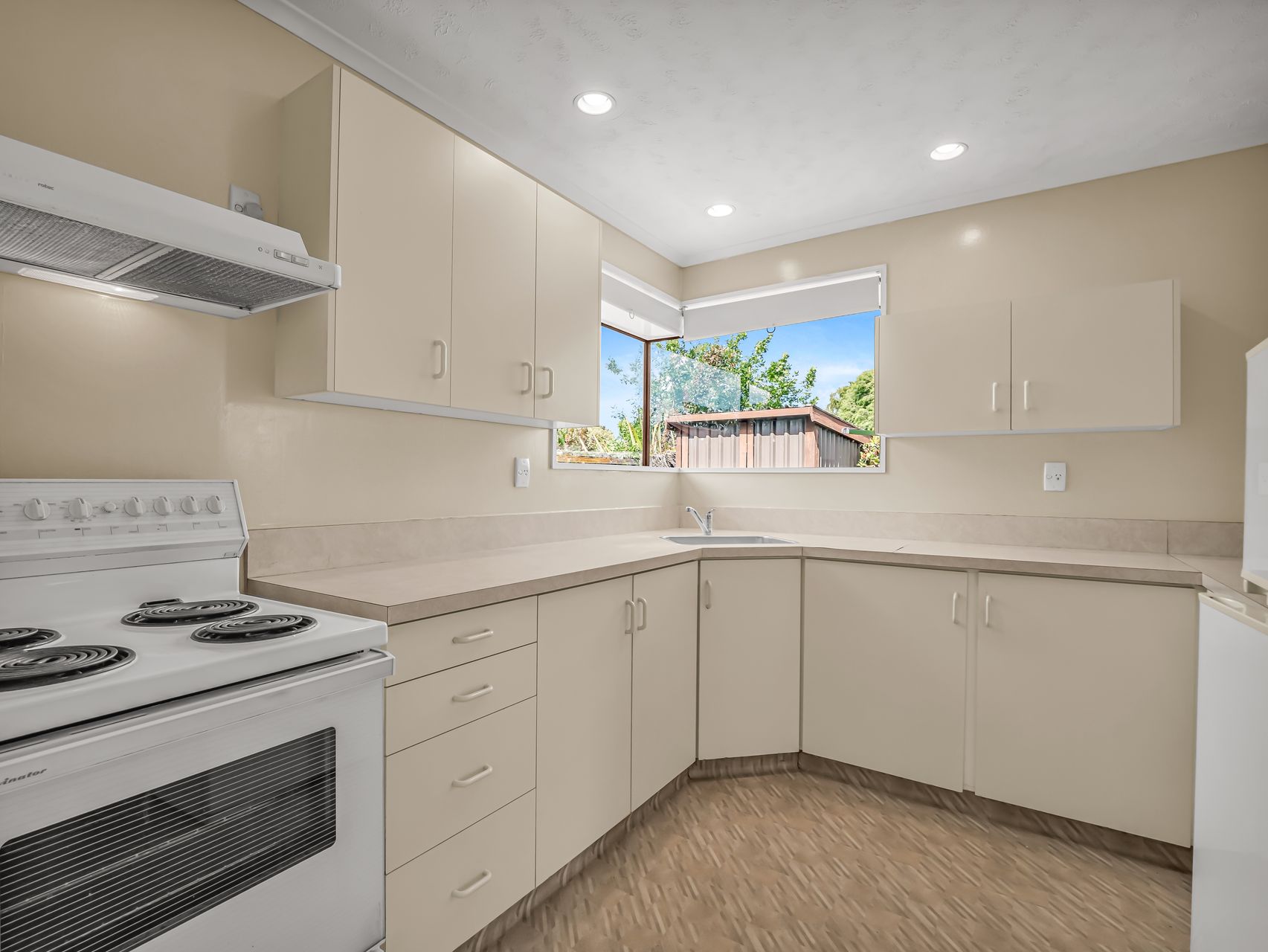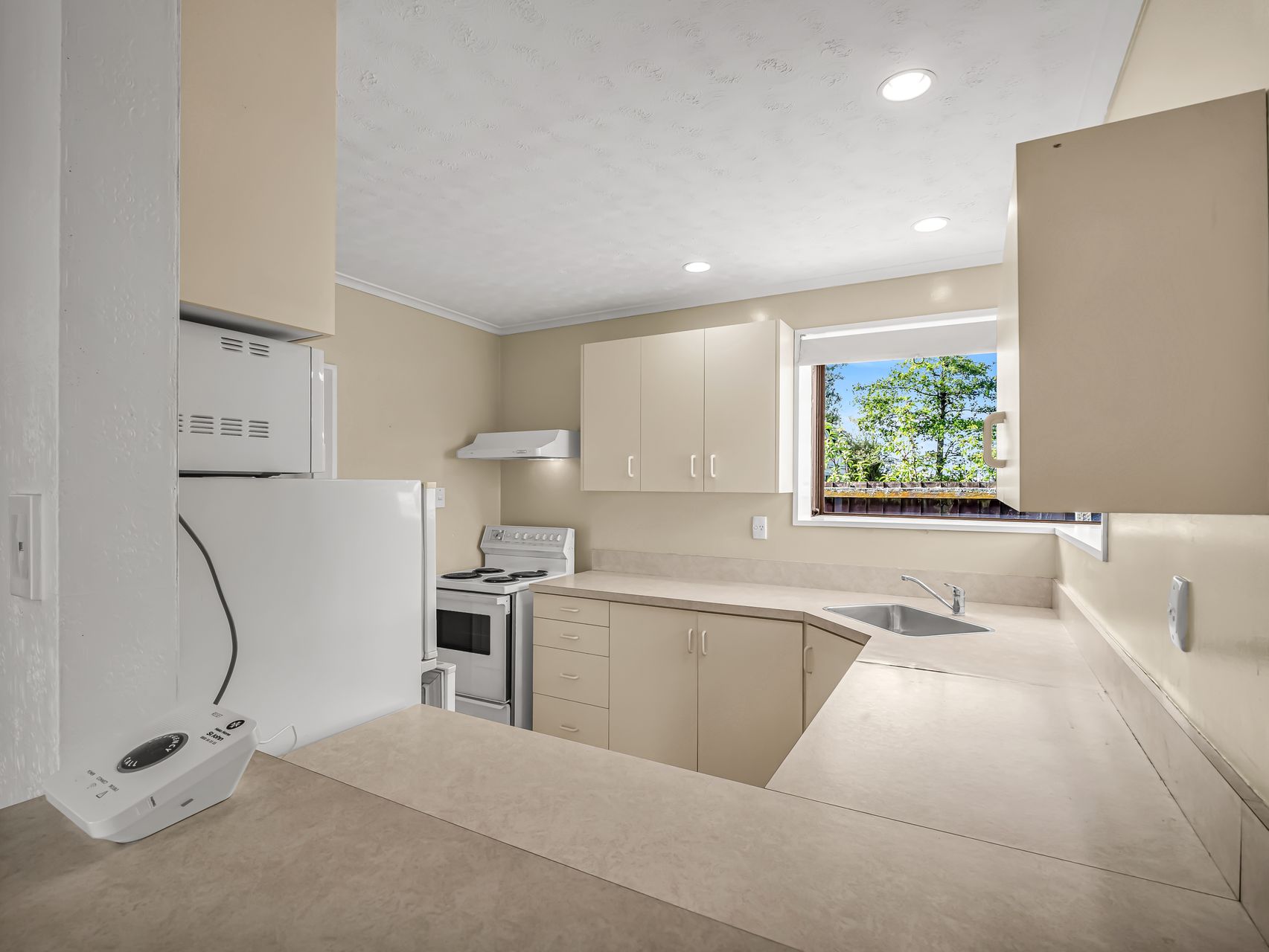 Inside, the living room is generous, open and bright, framed by big windows and a peaceful outlook to the greenery. Fresh flooring and neutral walls make it a clean slate you can style your way. The adjoining kitchen is tidy and practical with excellent storage, wraparound benchtops and a pleasant garden view while you cook.