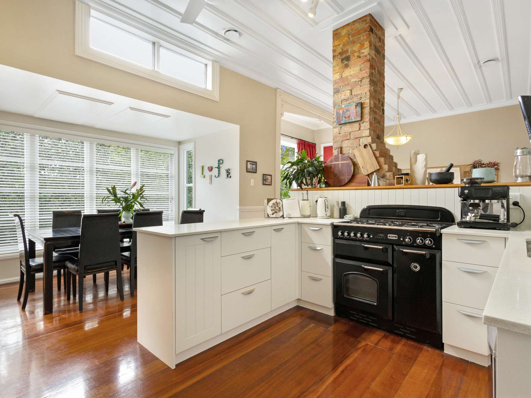 The open-plan kitchen and dining area form the heart of the home, where exposed brick, native timber ceilings and crisp white cabinetry meet sunlight streaming through wide windows. It’s a seamless blend of heritage charm and everyday practicality, ideal for family meals or relaxed entertaining.