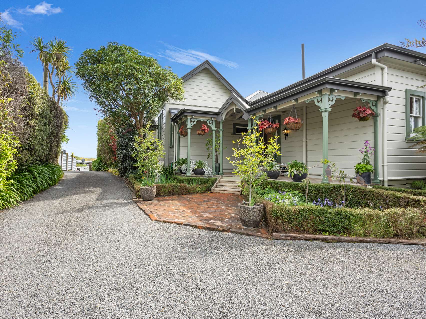 In a rear section, it’s instantly welcoming: manicured gardens, hanging baskets and classic green trim set the tone for what’s inside. The front porch hints at slow mornings, while decorative fretwork adds storybook appeal.