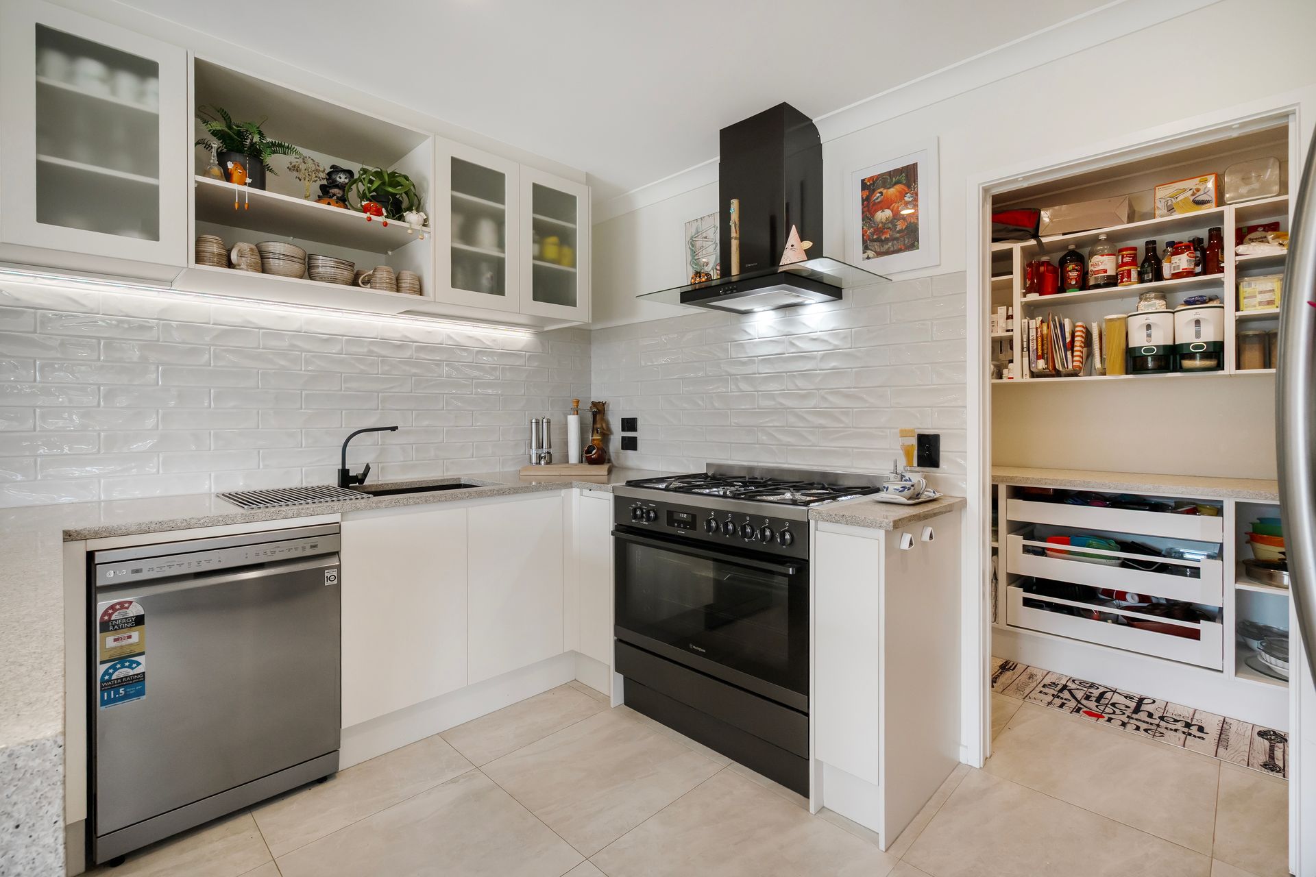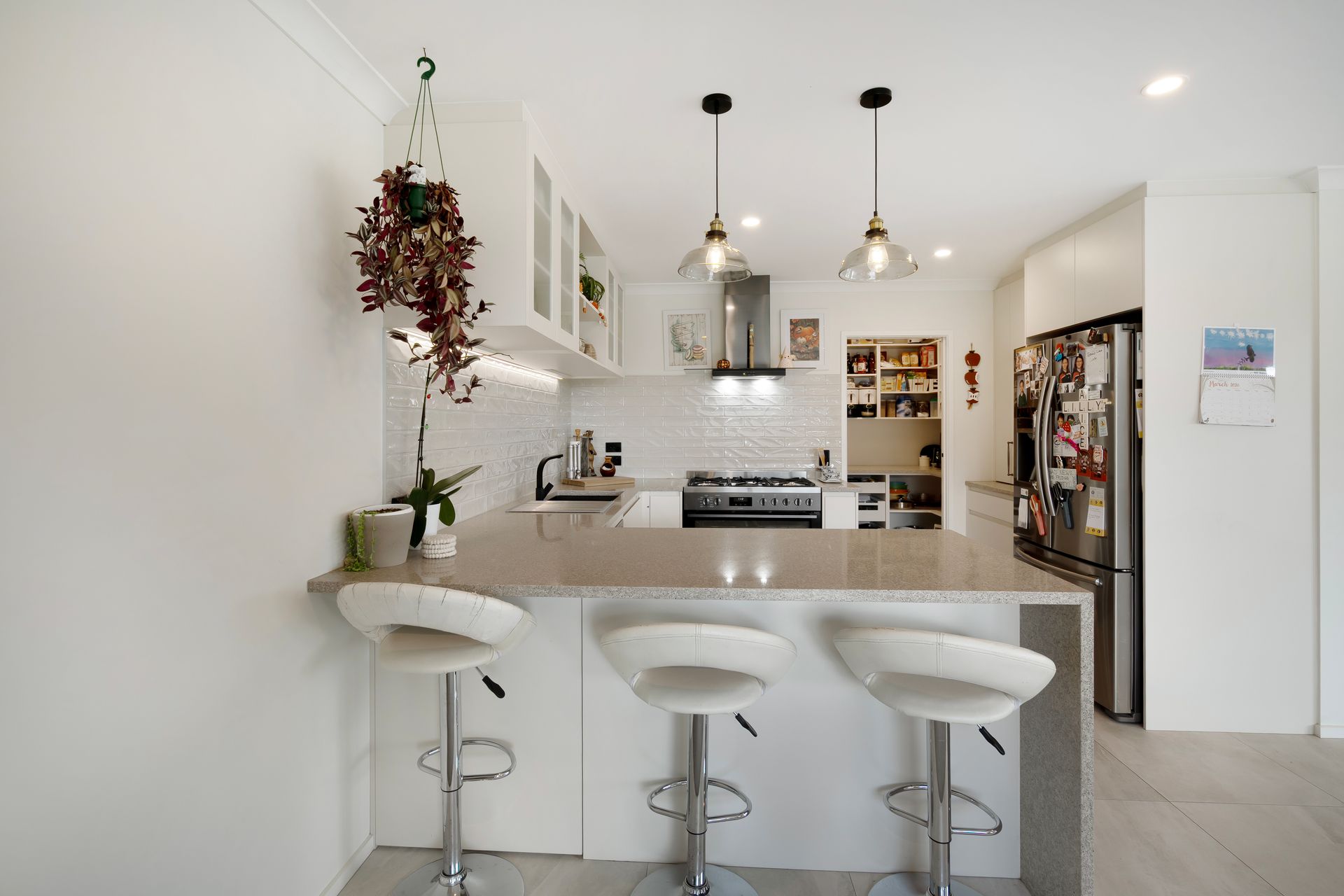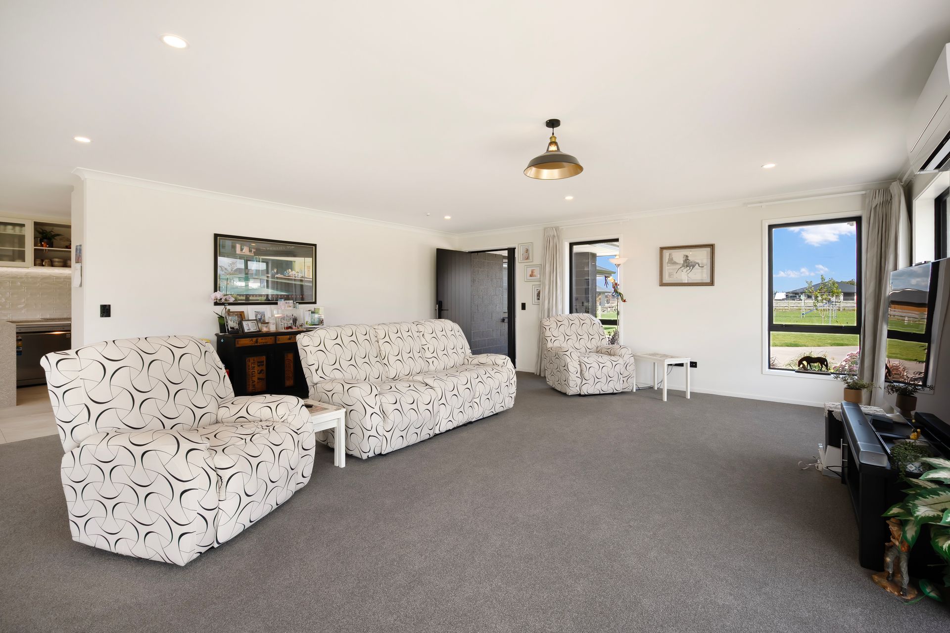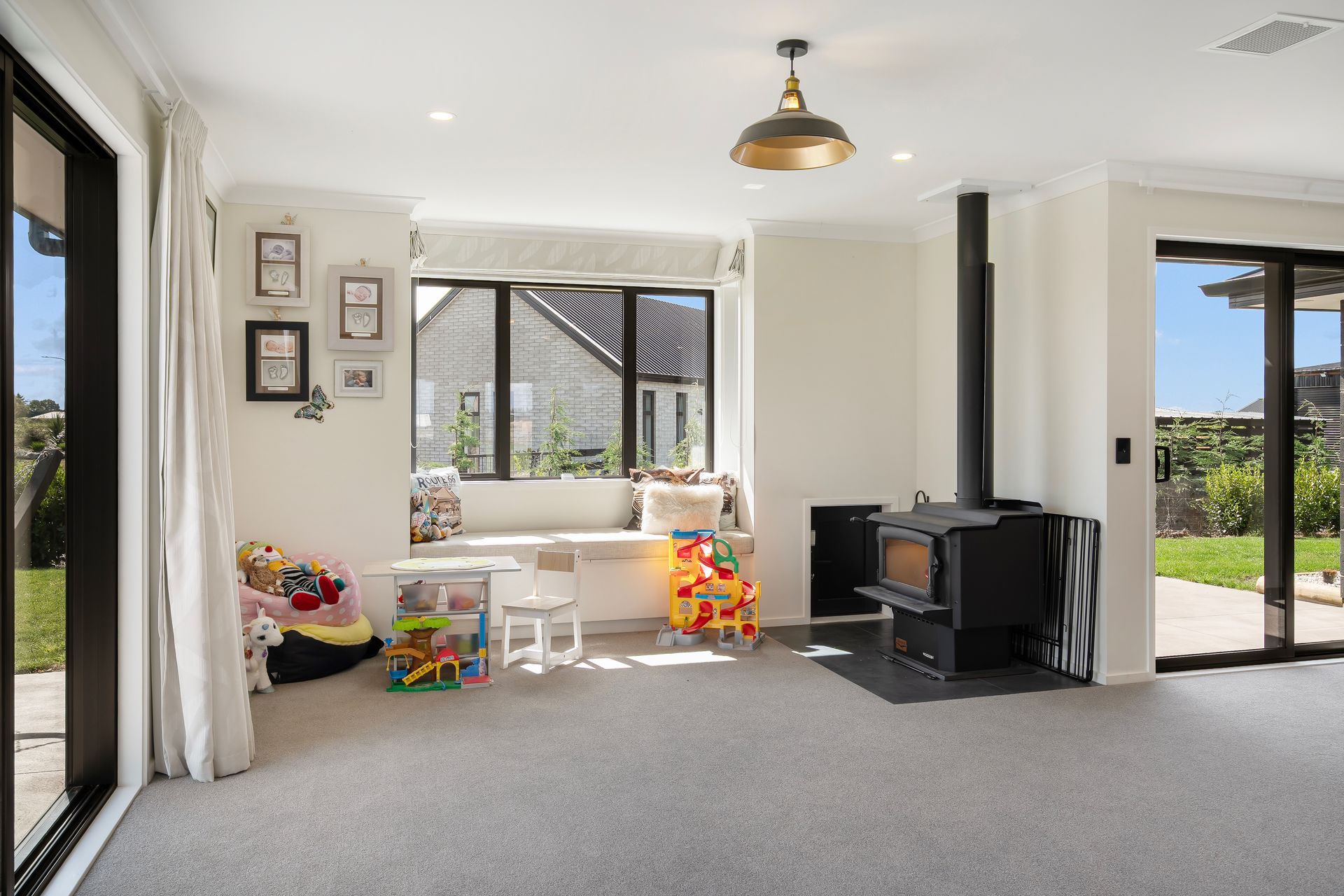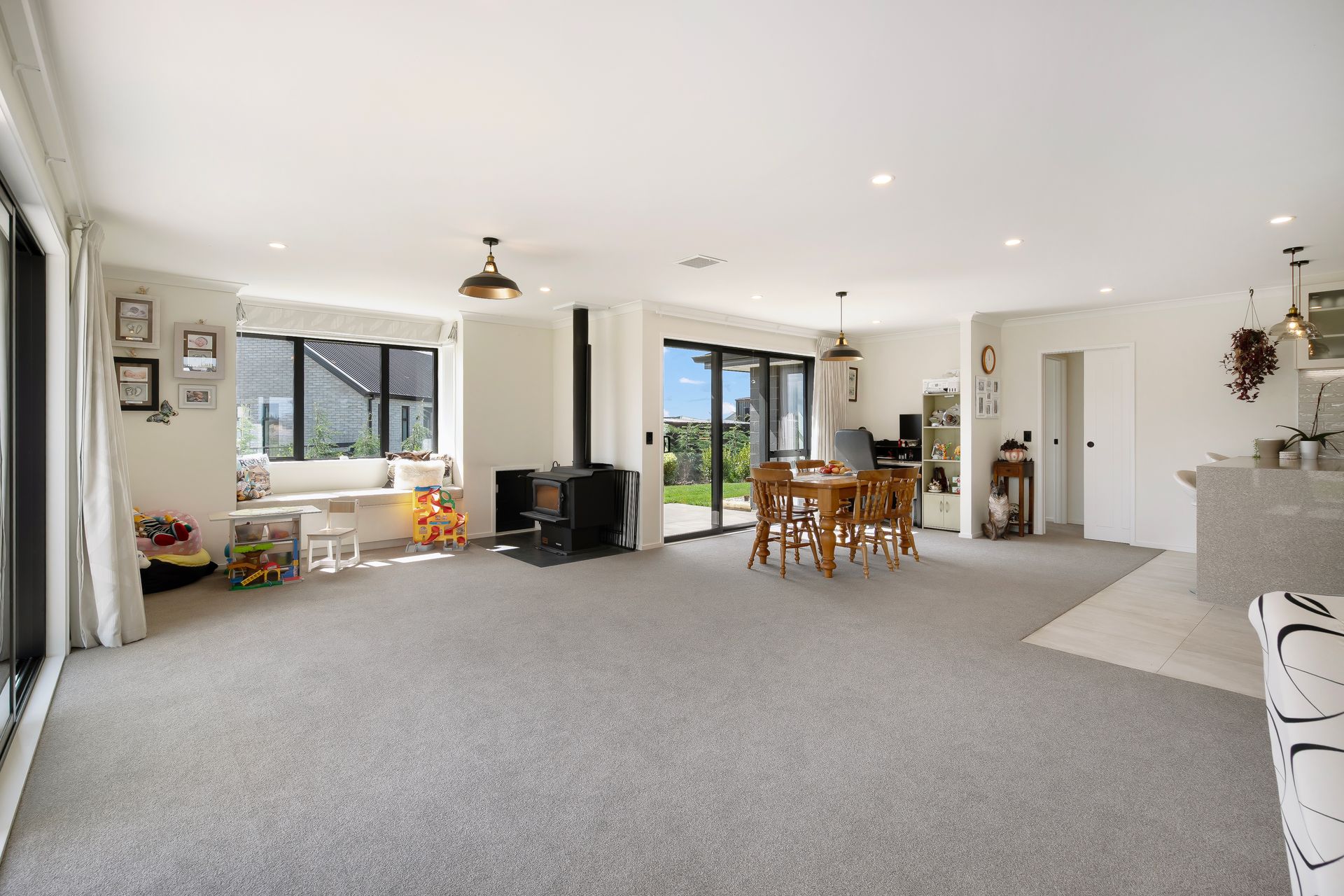 The open-plan living and dining zone is bright and welcoming, with wide sliding doors creating seamless indoor-outdoor flow to the patio and lawn beyond. A heat pump keeps the main living area comfortable year-round, while a wood burner adds a cosy focal point for cooler evenings. The kitchen sits at the centre of it all with pendant lighting, modern appliances and a sociable breakfast bar where conversations naturally gather. Just alongside, a walk-in pantry adds a layer of everyday practicality.