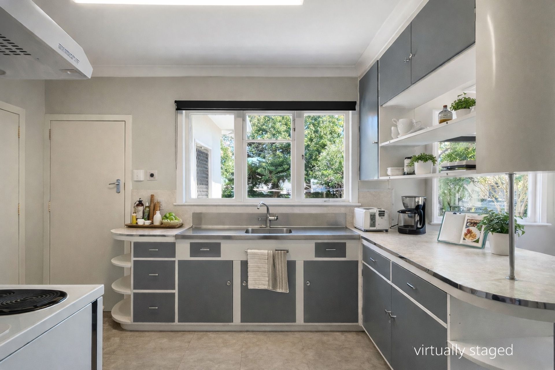 The kitchen retains its original charm, with mid-century cabinetry, generous bench space and a distinctive curved breakfast bar that adds personality and practicality. A large window above the sink brings in greenery and daylight, making this a space that’s ready to be refreshed or reimagined to suit your own style.